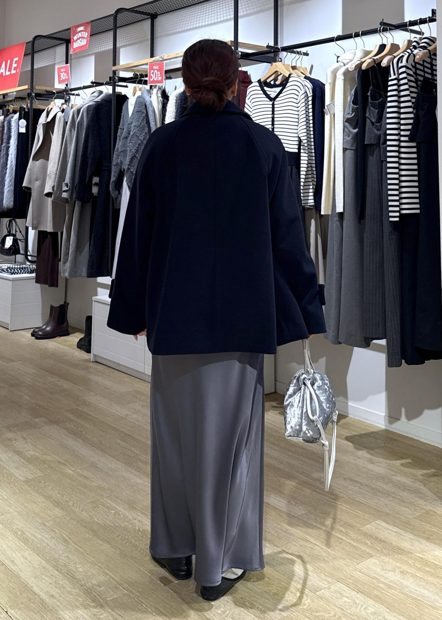 サテンのスカートや足元をブーツではなくパンプスにすることで、春先寒い時まで使えるコーデにしてみました!