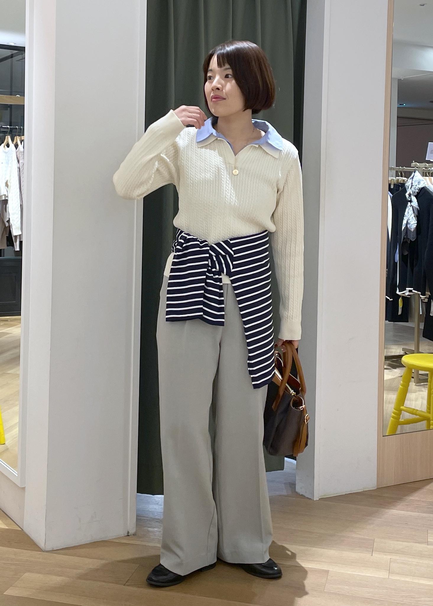 淡いカラーでまとめていたので、ネイビーのボーダーカットソーを腰巻きして、メリハリを付けつつ少しラフな印象に◎