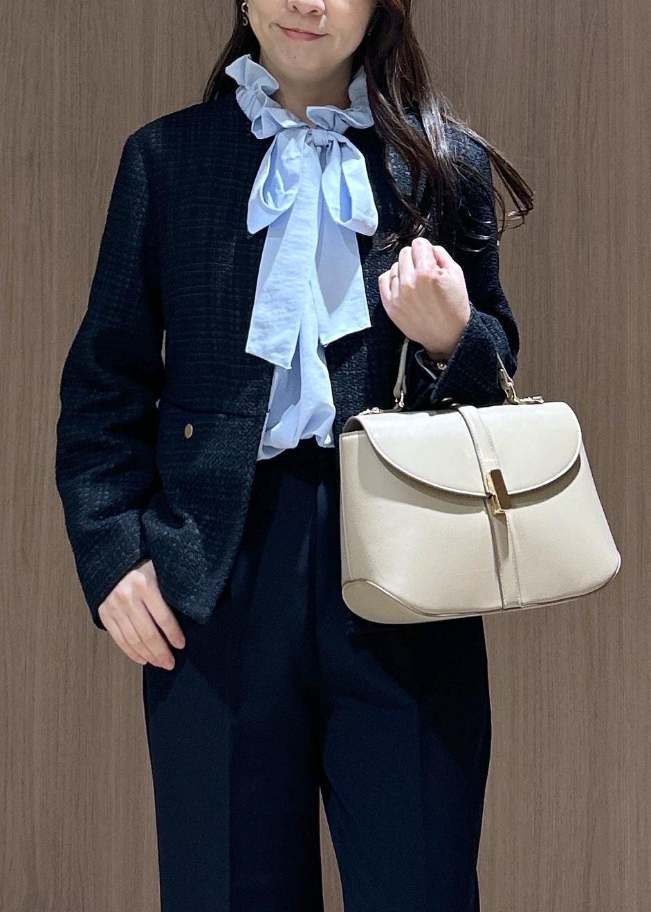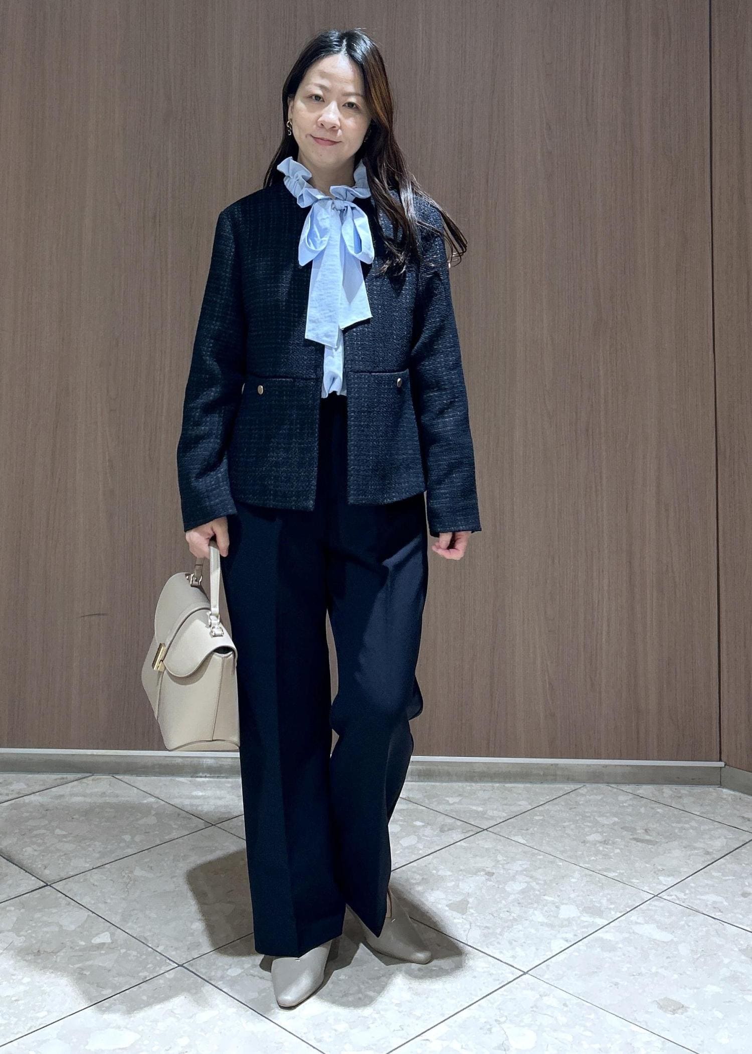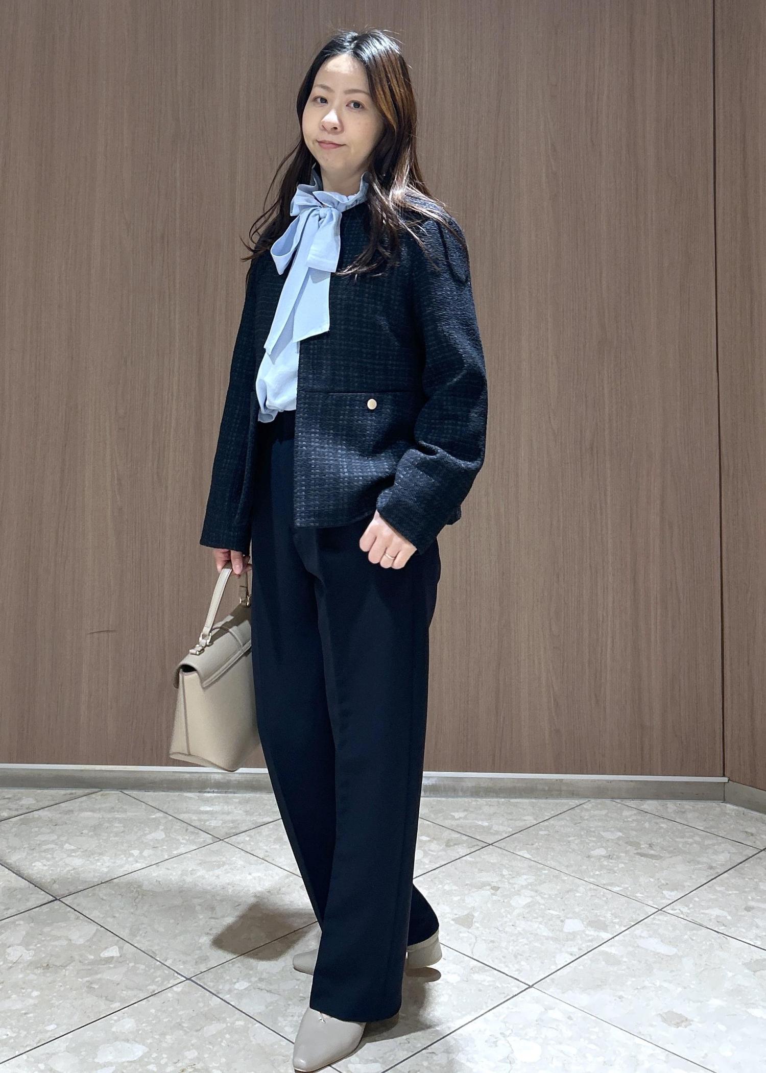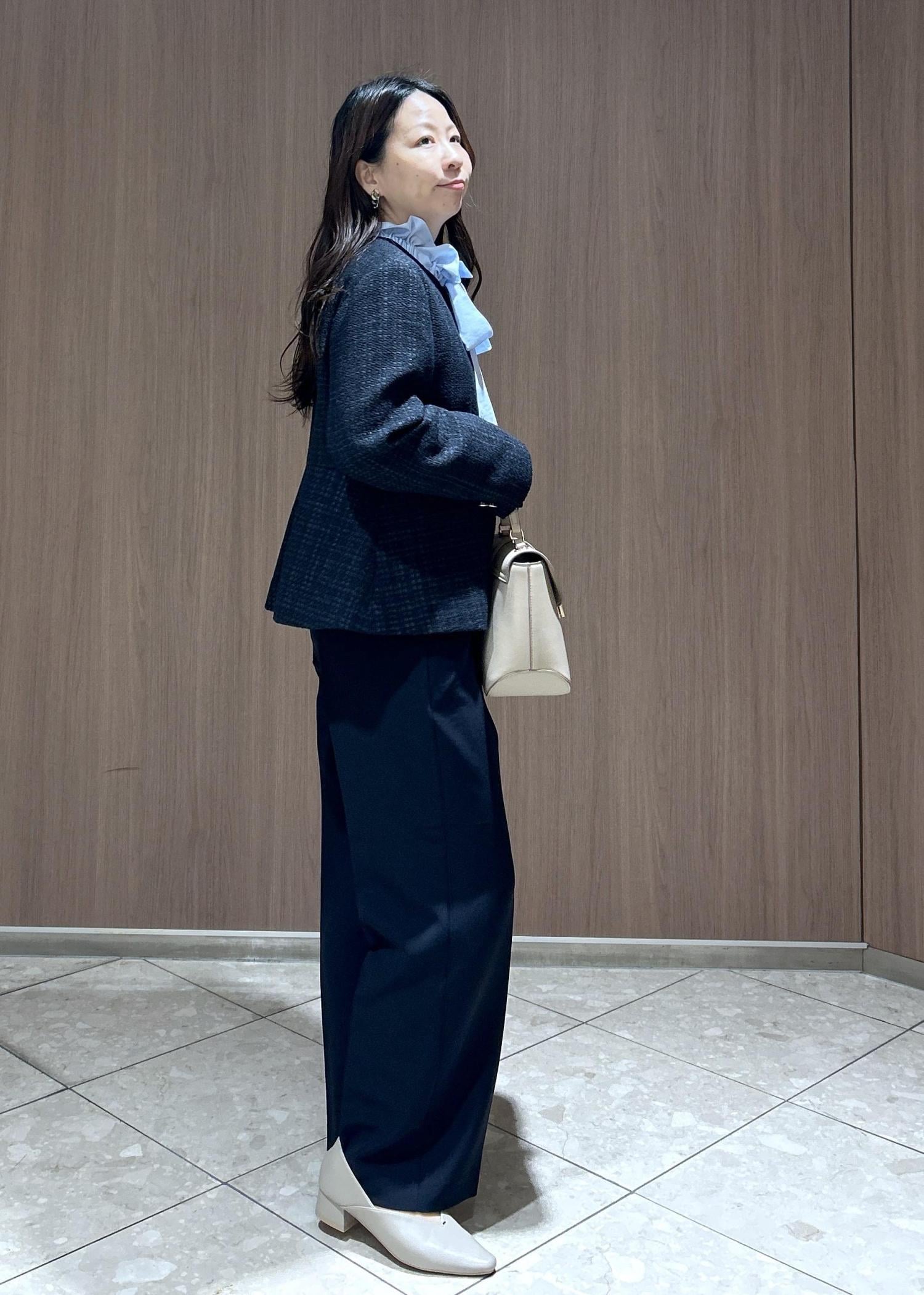 上下ネイビーでまとめ、シャツでブルーをアクセントにしたスタイリングをしてみました。小物はお洋服が重めなカラーになったのでライトベージュで軽やかに仕上げてみました。