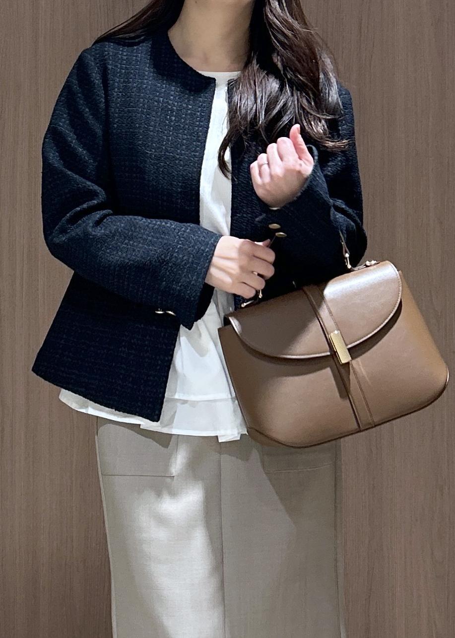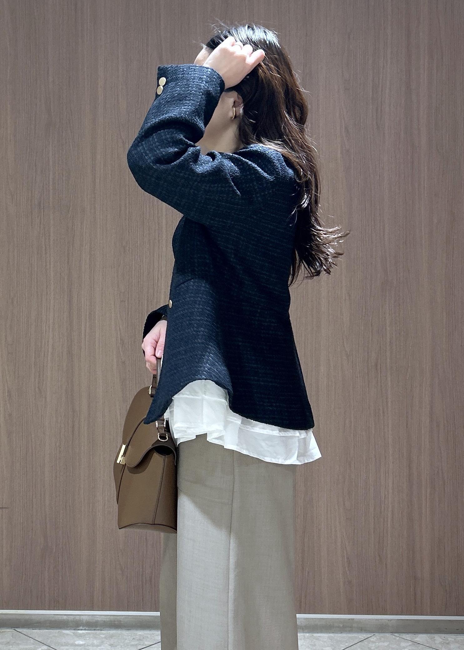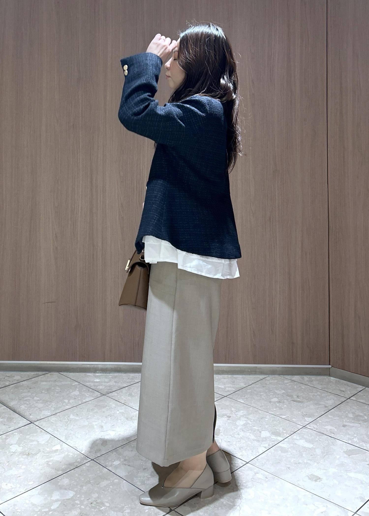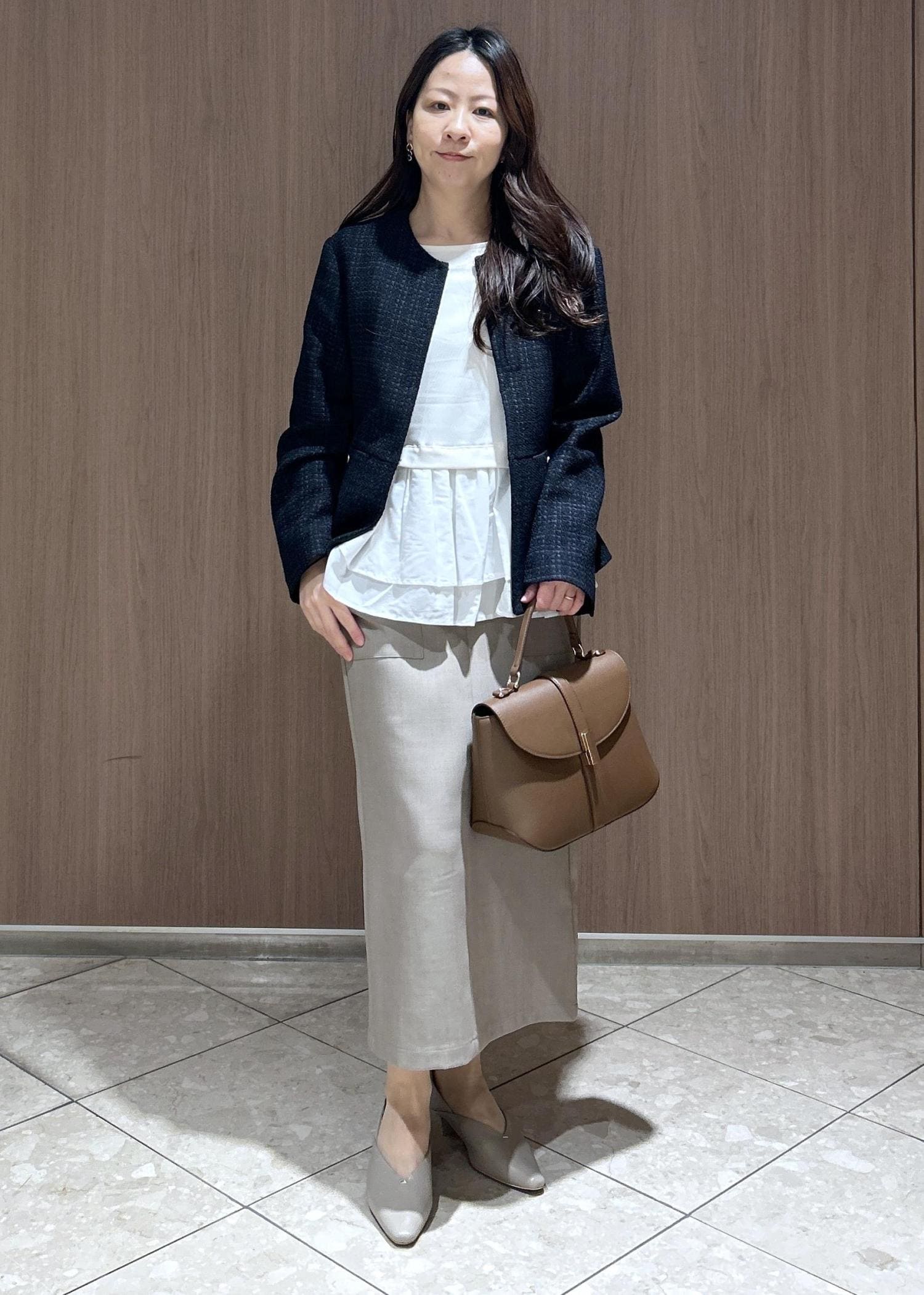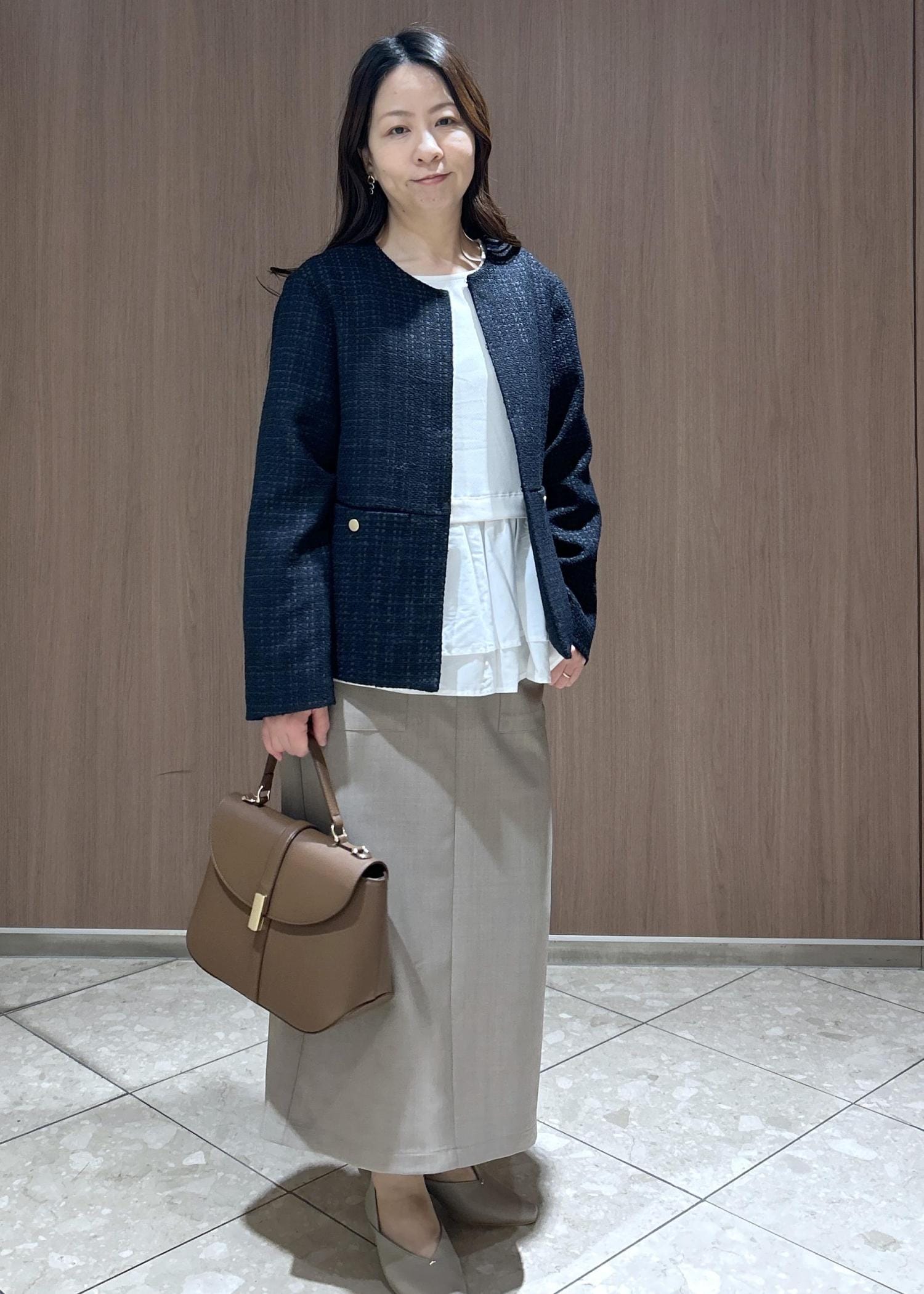 ツイードジャケット×タイトスカートで大人女性のお仕事スタイルにしてみました。ツイードにペプラムインナーを合わせで可愛さをプラスすることでより柔らかい印象になるように仕上げてみました。