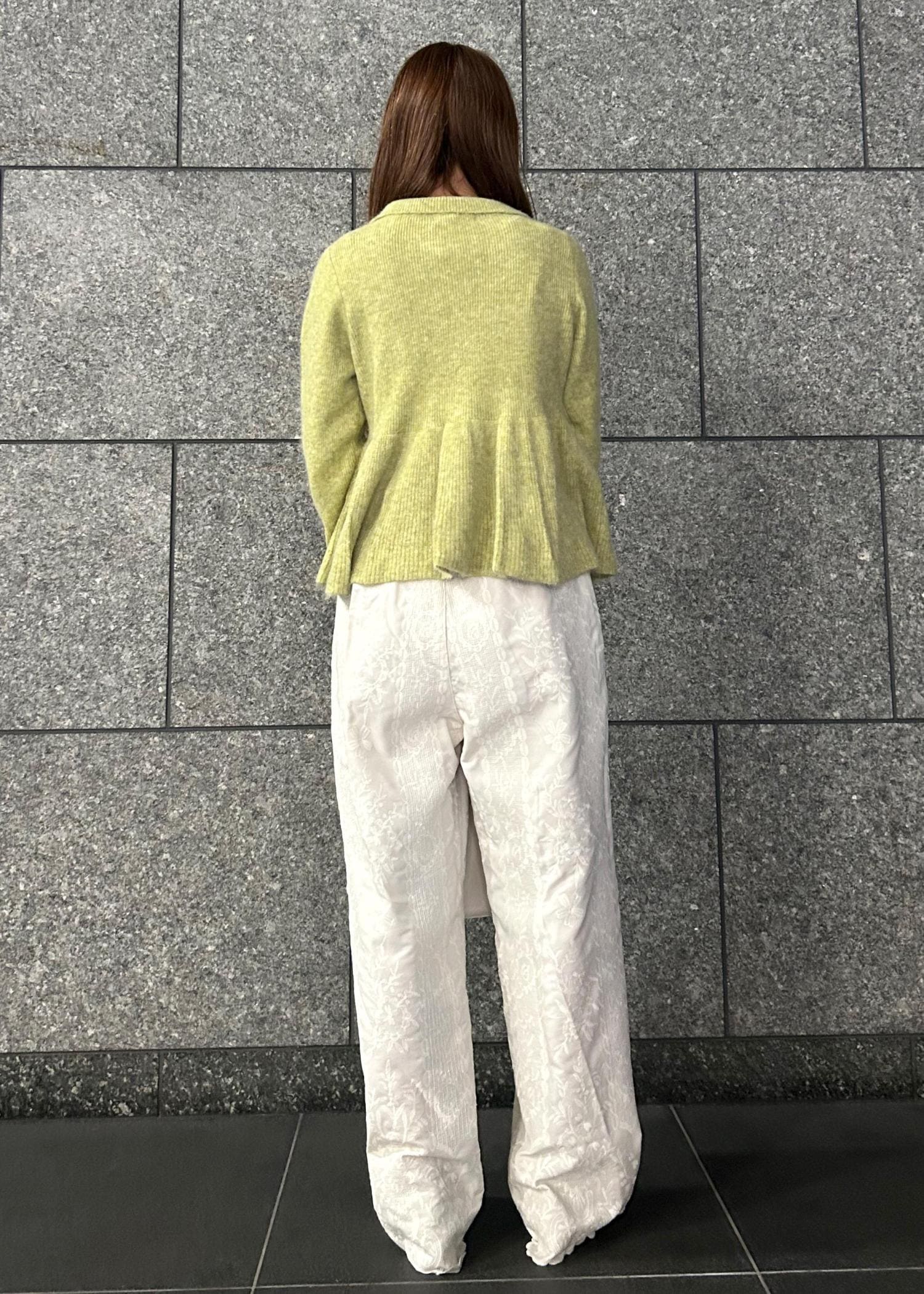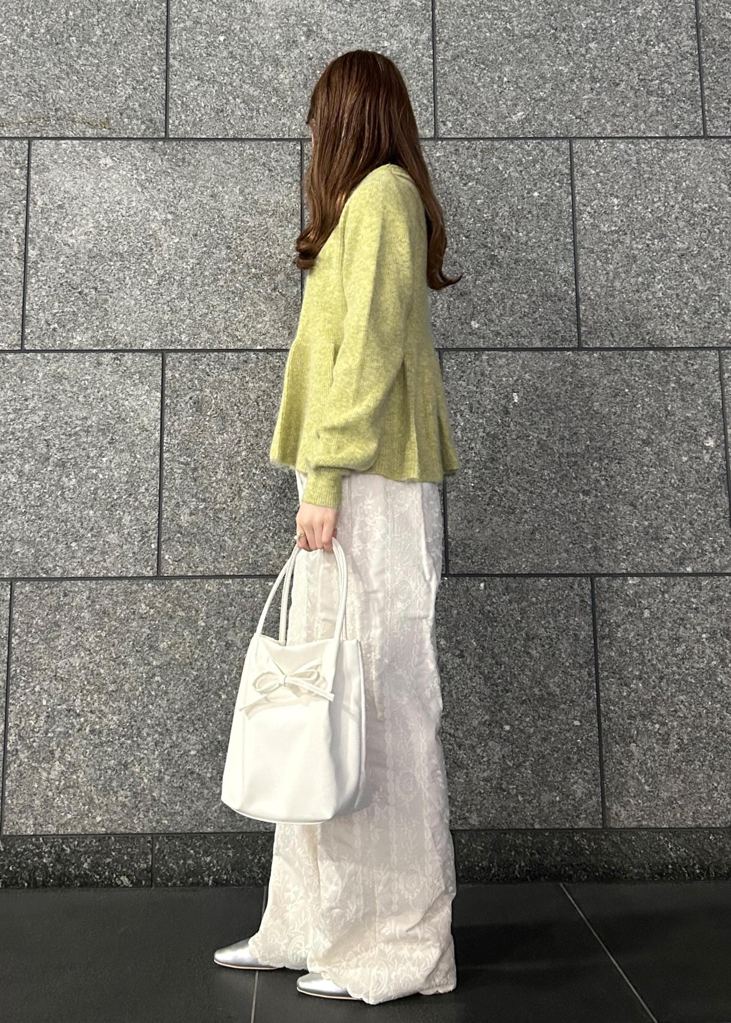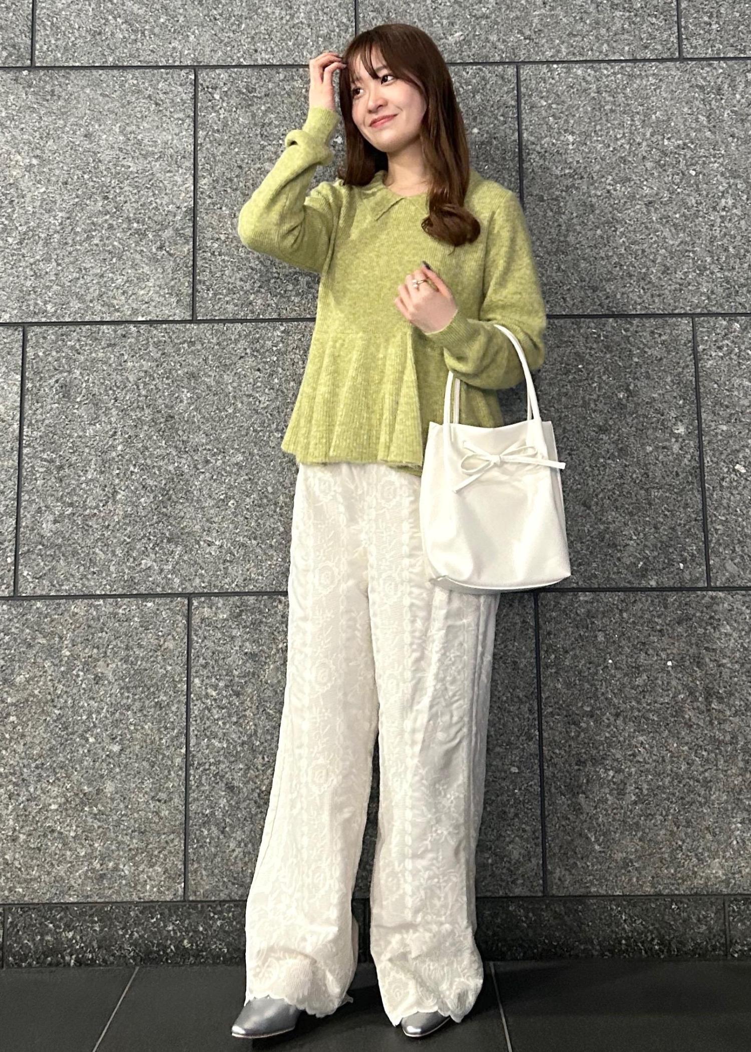 黄緑色のトップスと白のパンツの組み合わせで春らしさを感じるコーデに仕上げました!