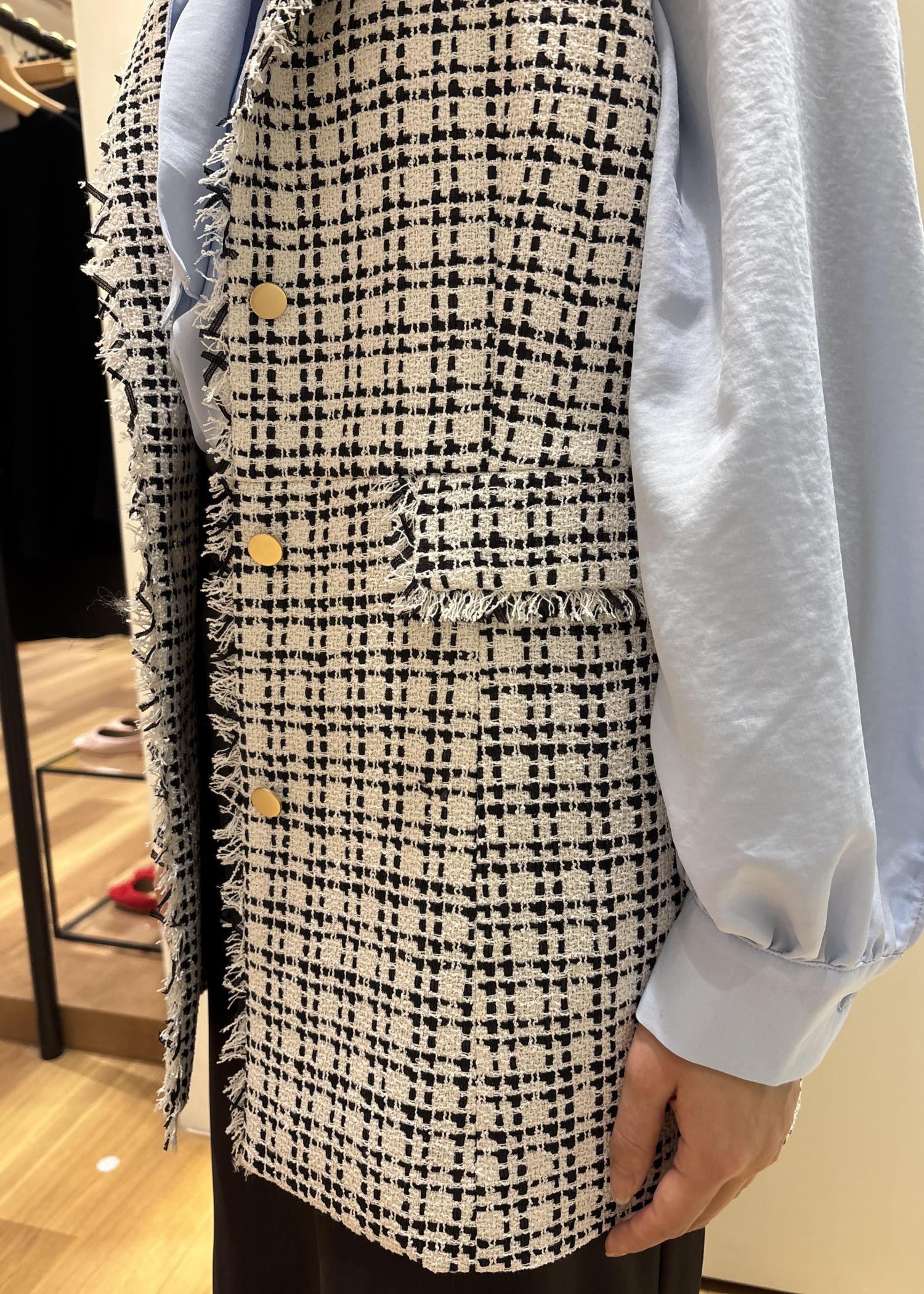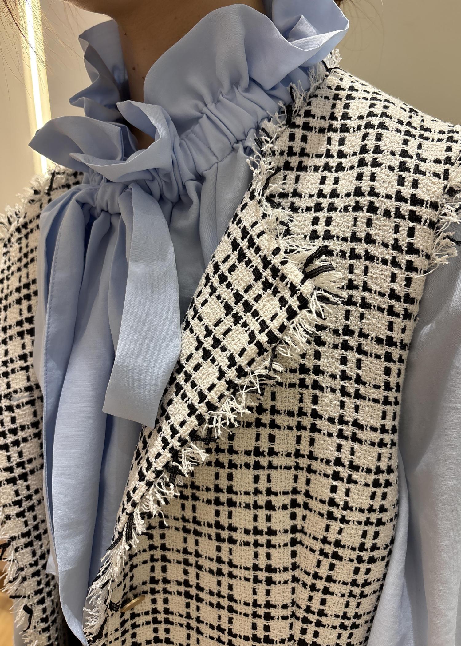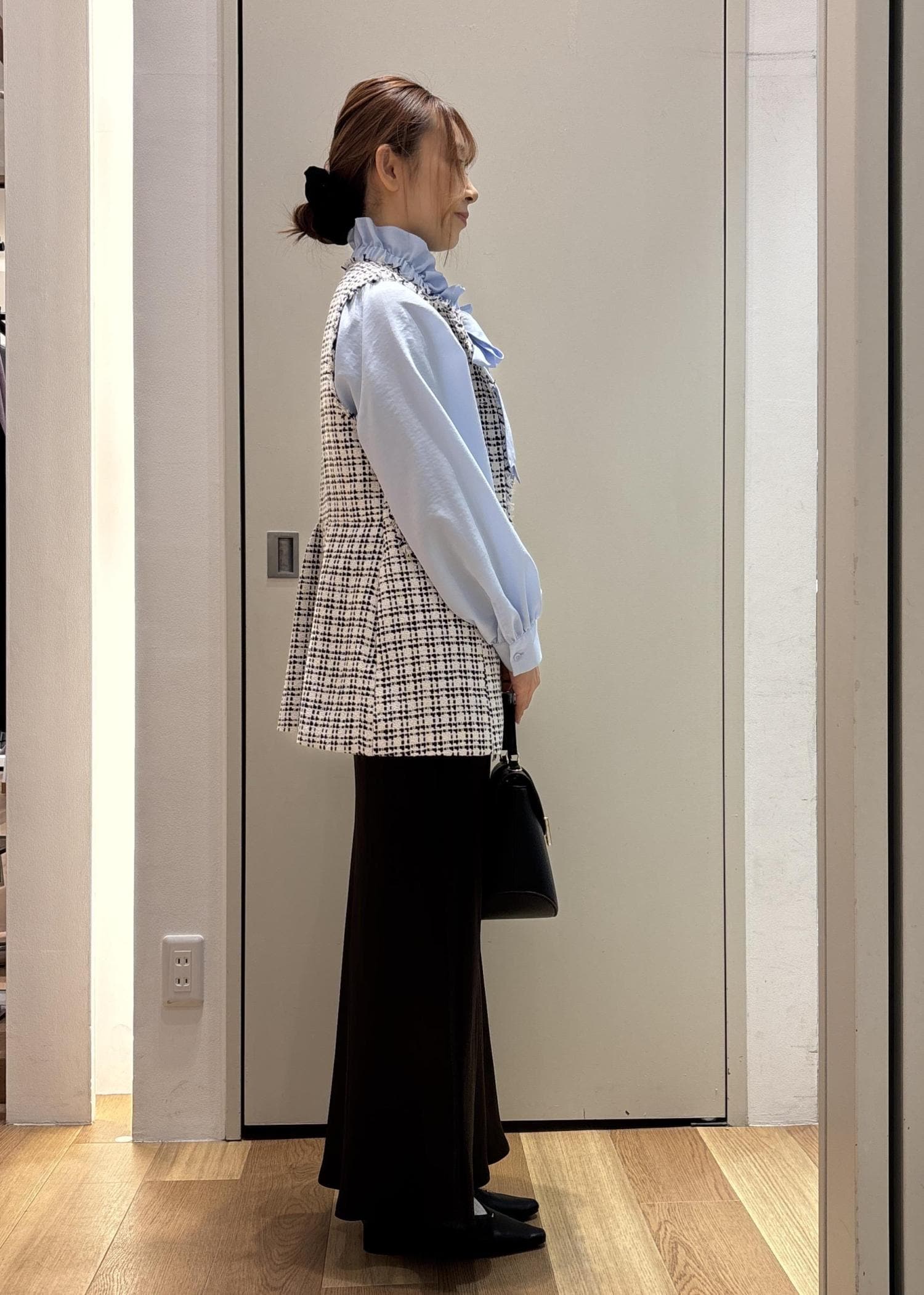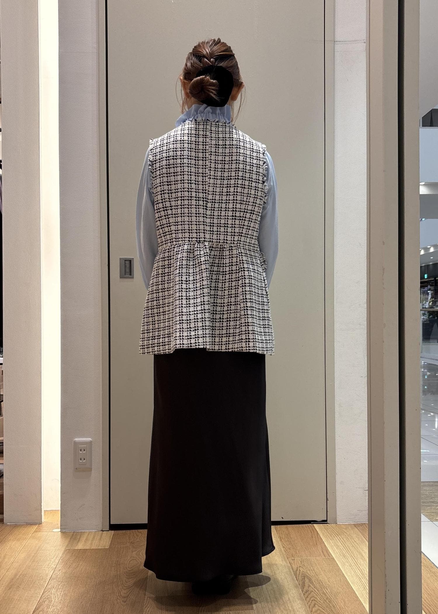 そこに、モノトーンのツイードジレを合わせきちんと感をプラスしました。