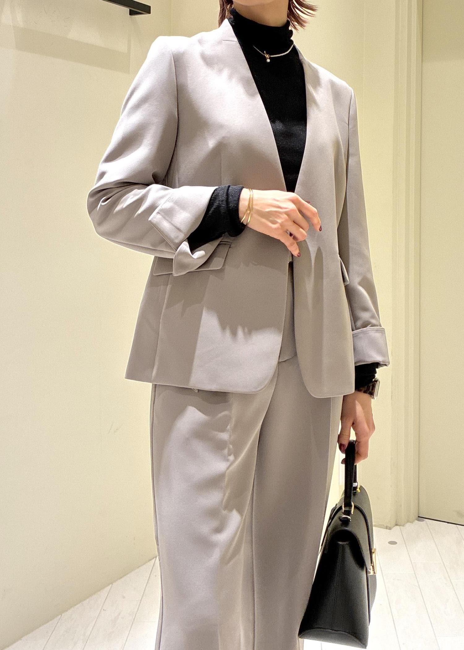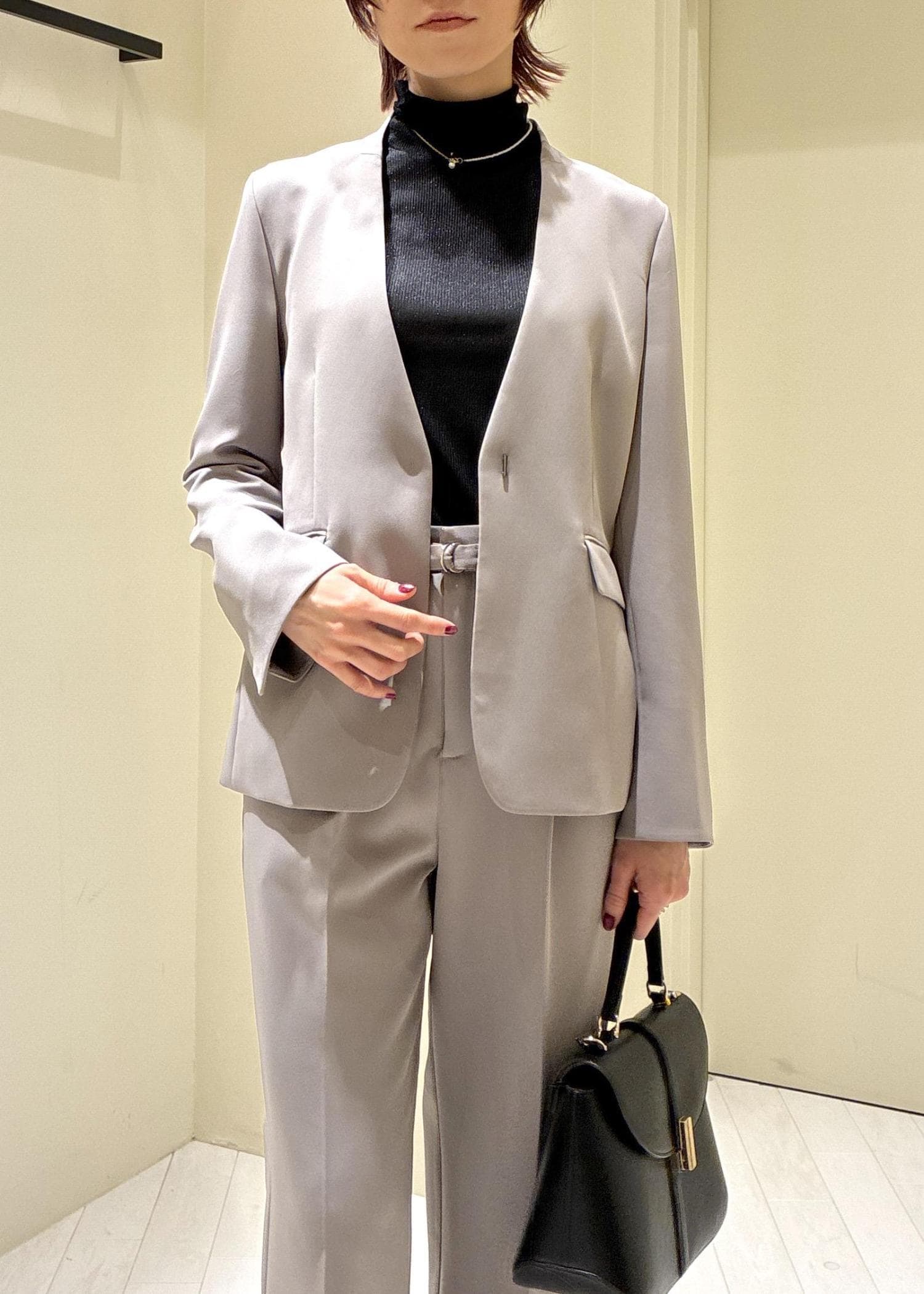 ノーカラーで首周りスッキリと、インナーが映えるデザインです。 -