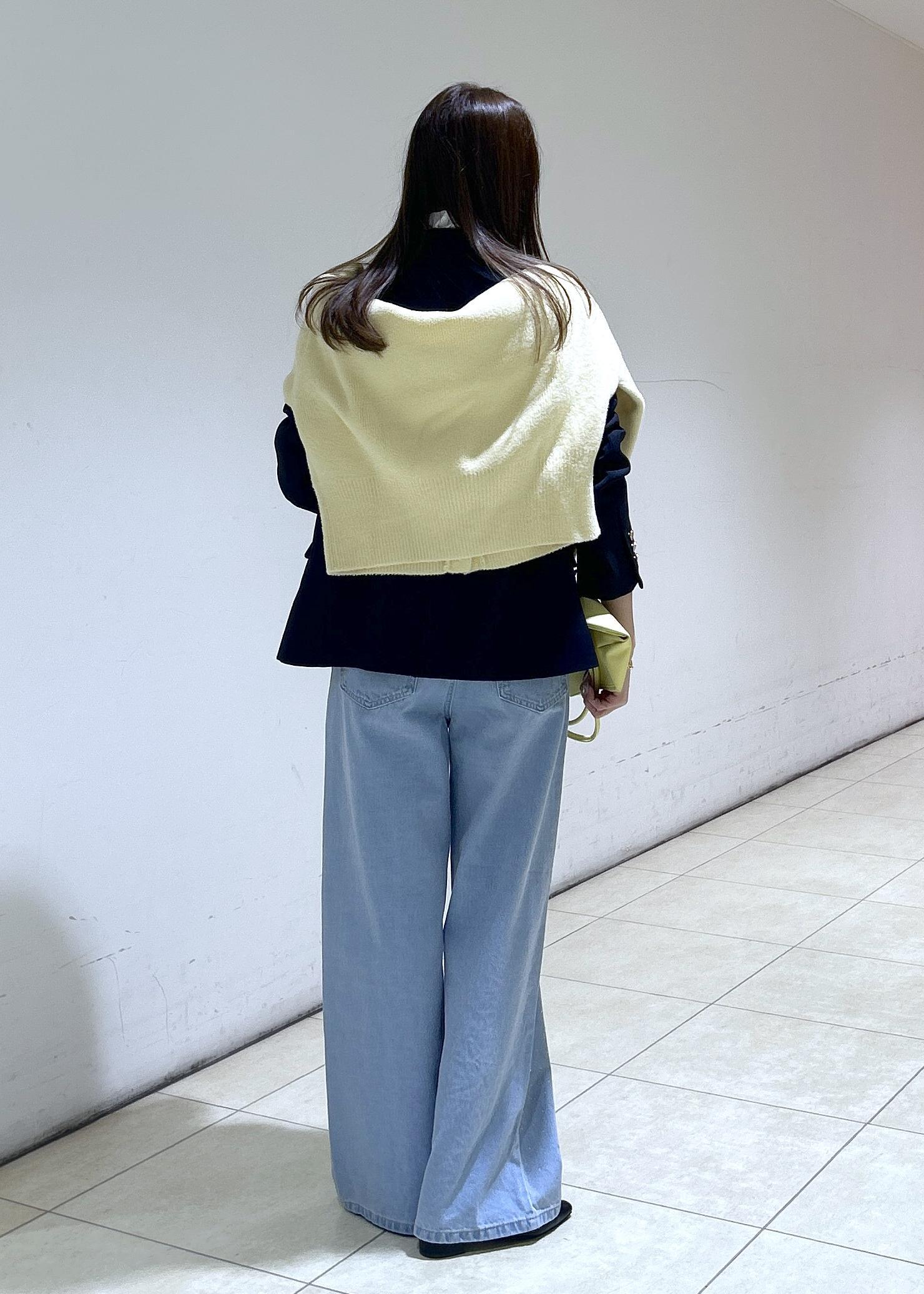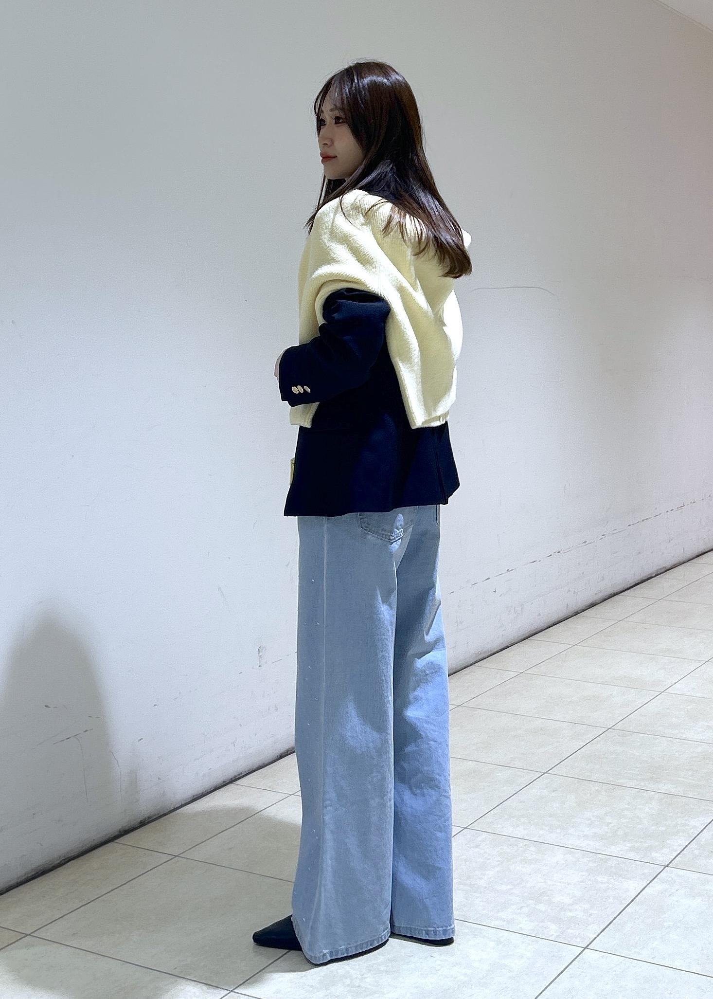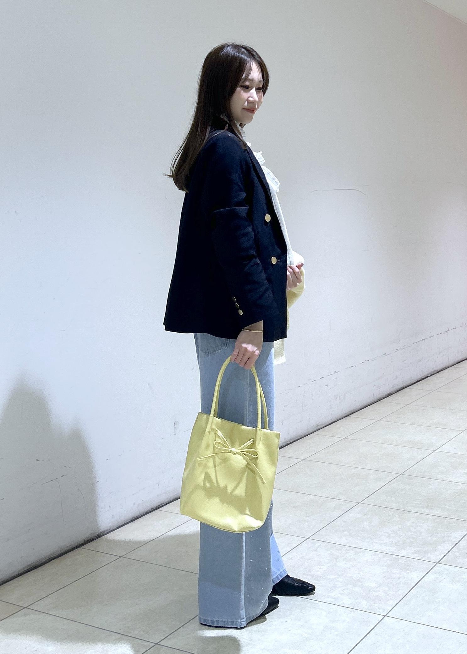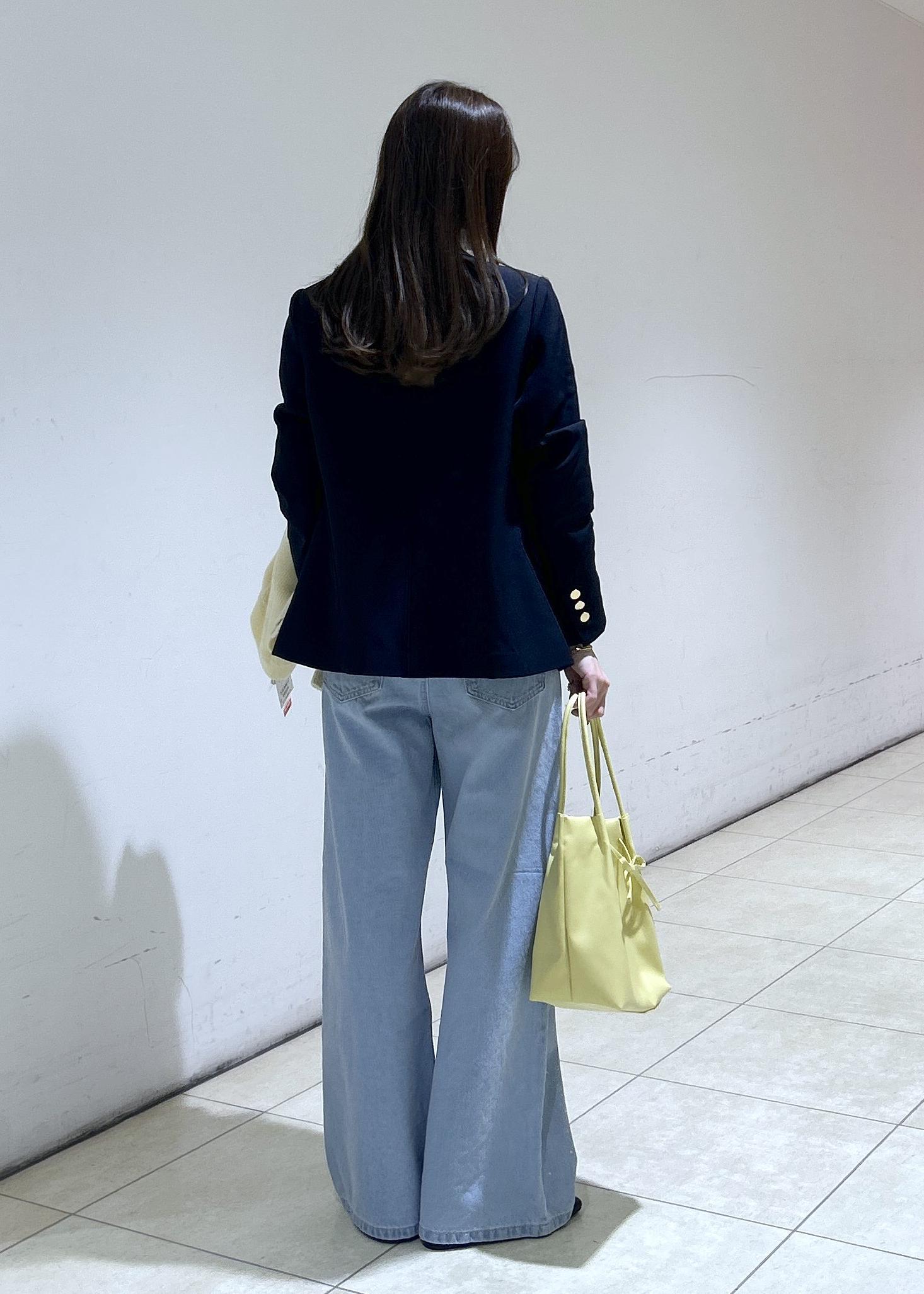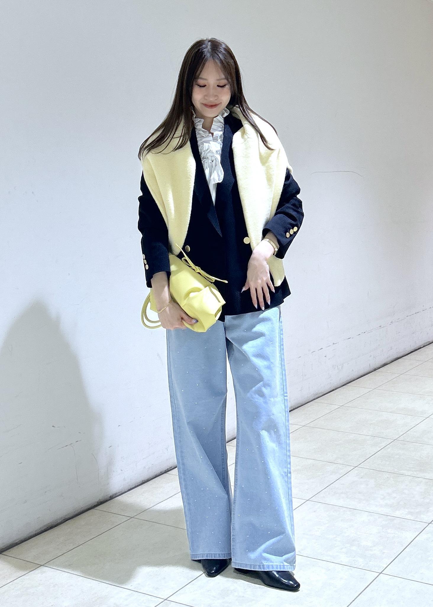 イエローを差し色にし、ネイビーのジャケットで大人っぽいスタイリングにしました。