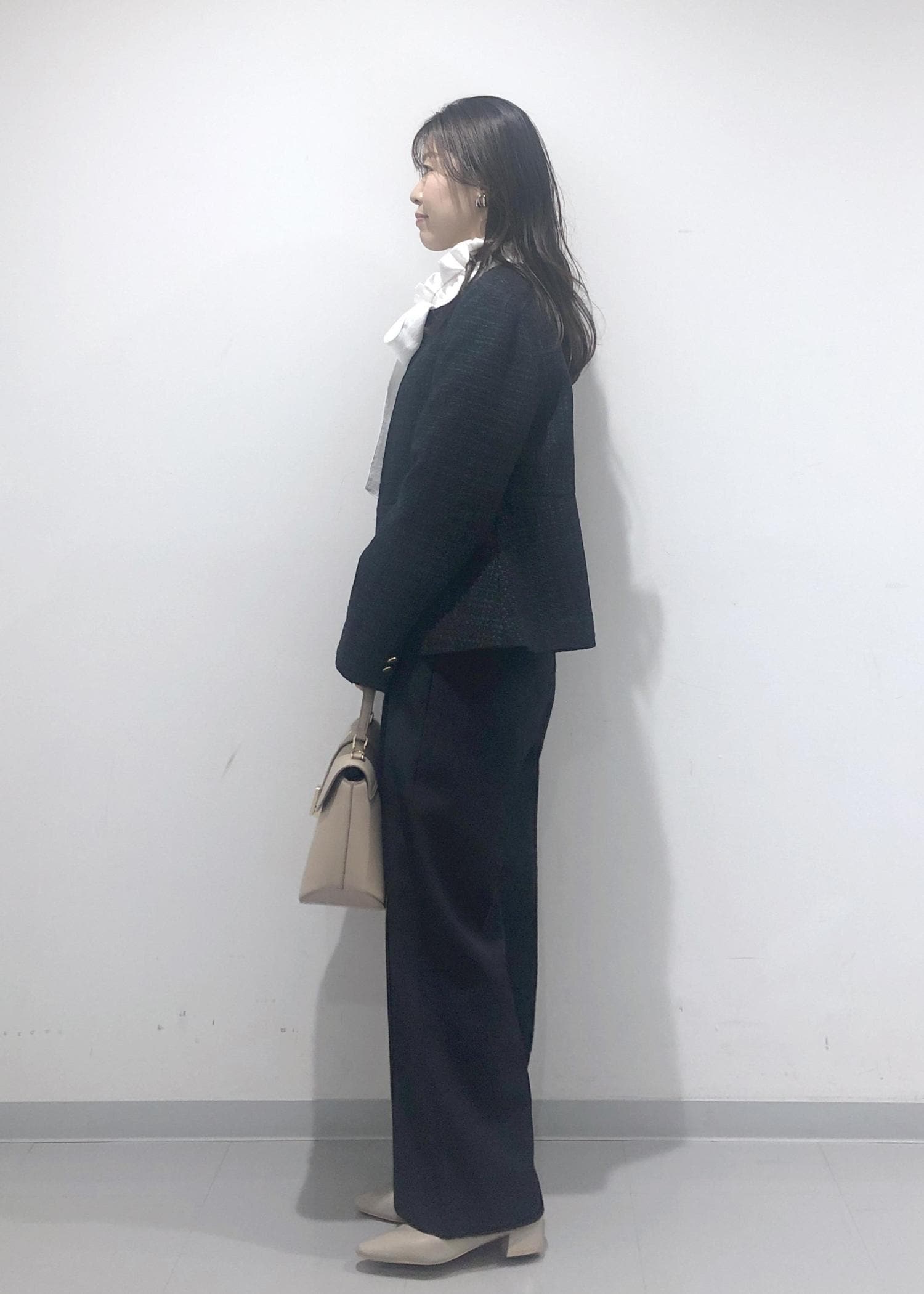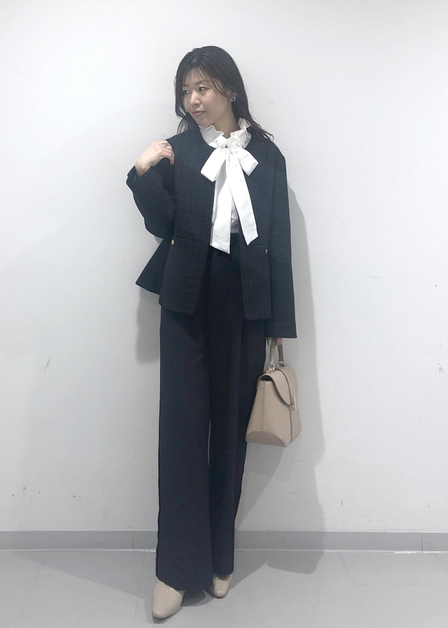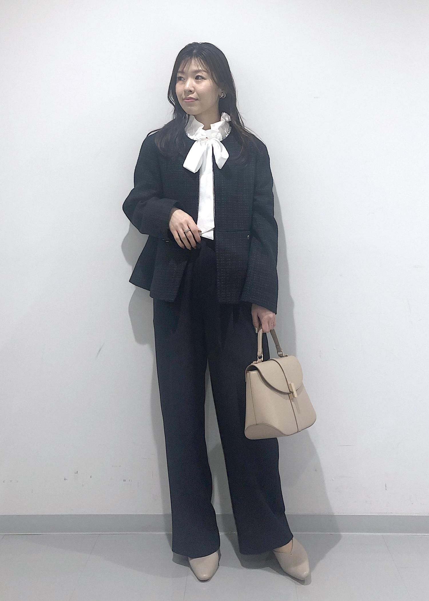 首周りが華やかなフリルリボンのブラウスに、ネイビーの上品見えするペプラムツイードジャケットを羽織り、ネイビーのワイドパンツを合わせた、セレモニー(卒業)コーデです!