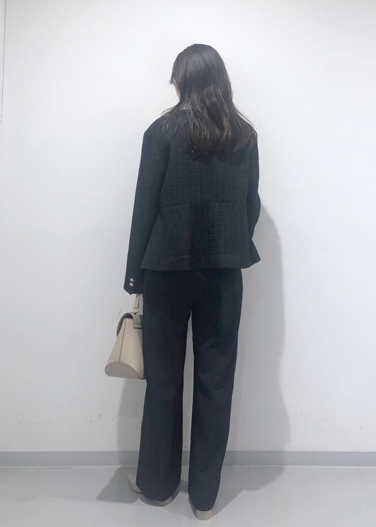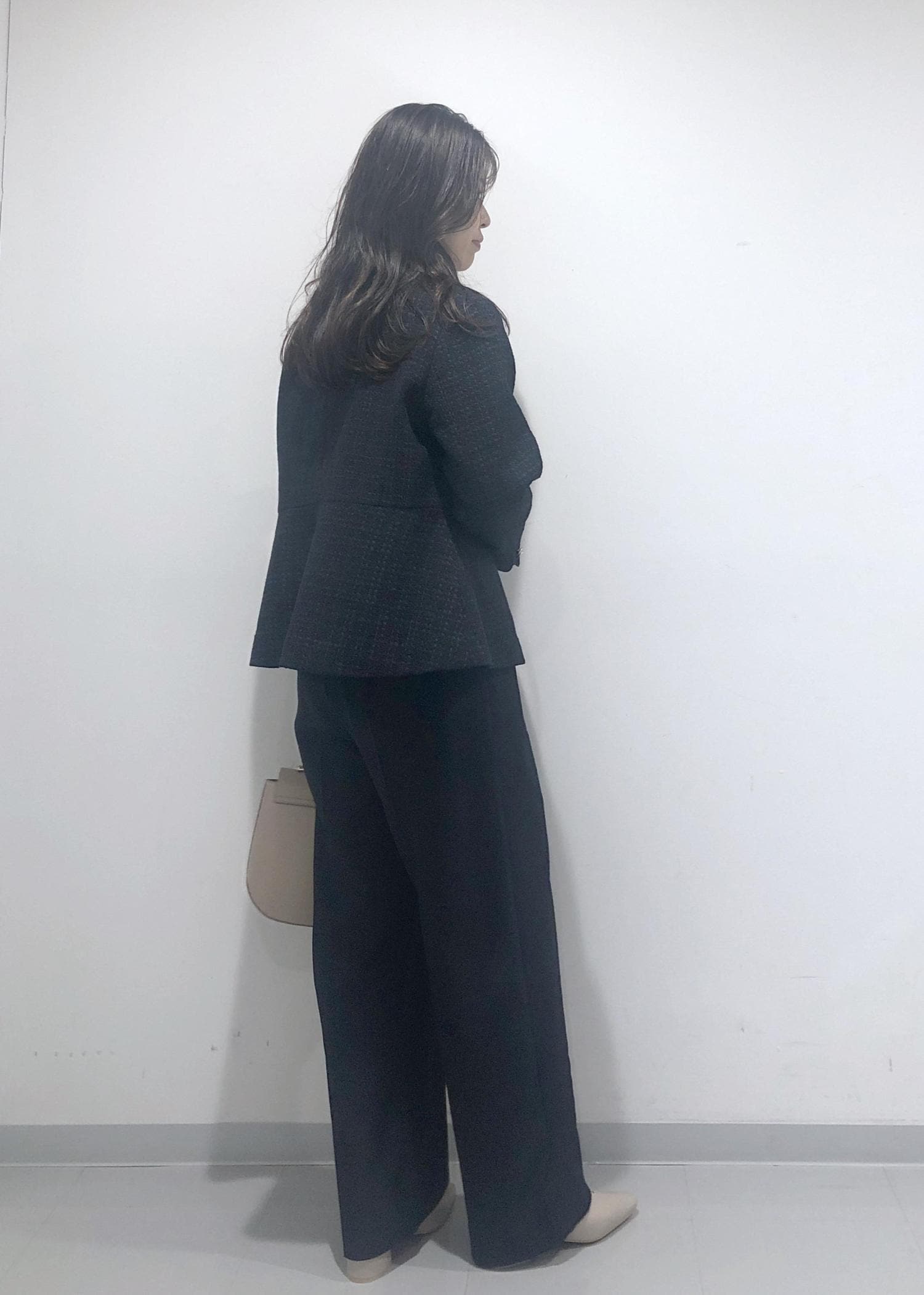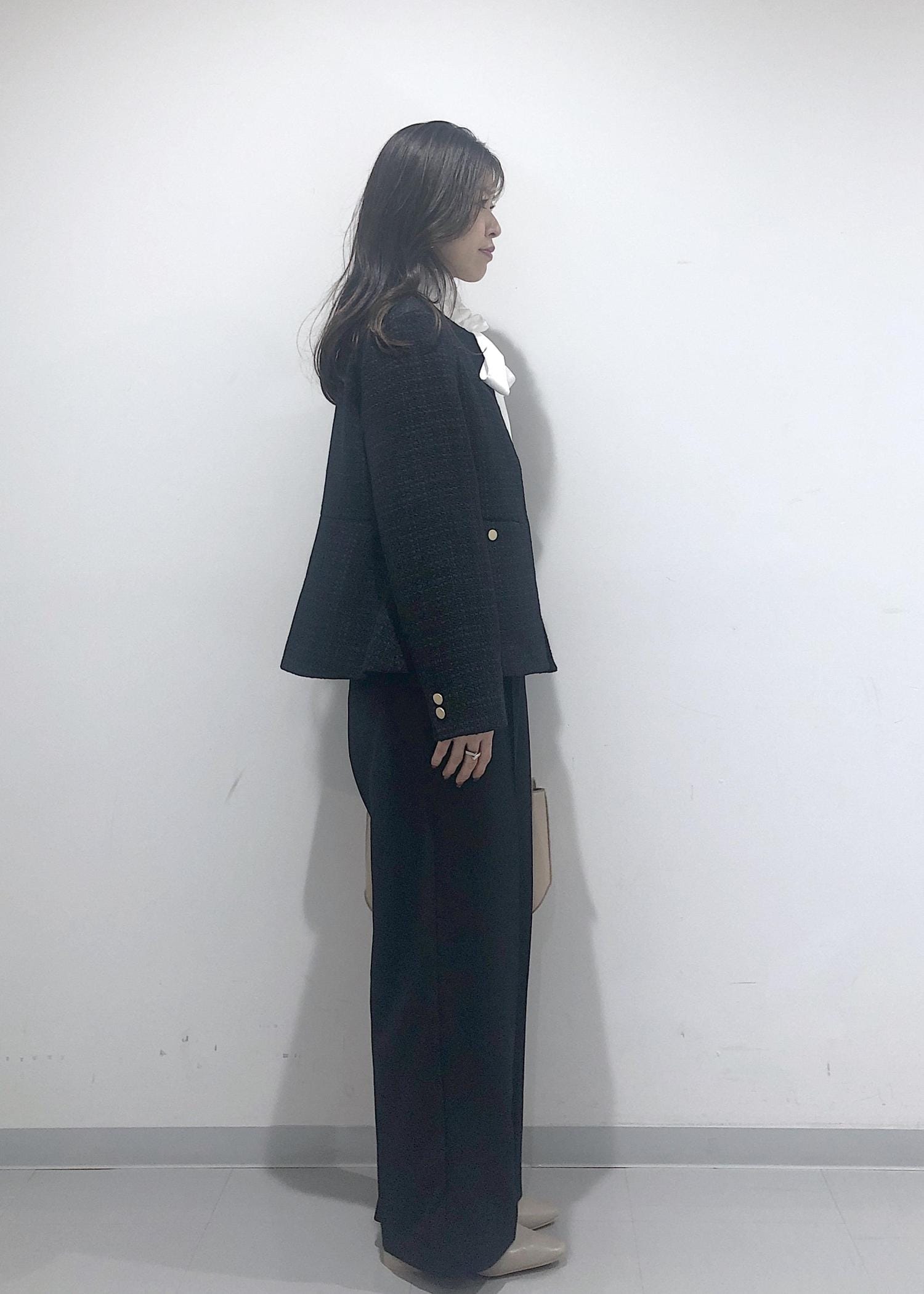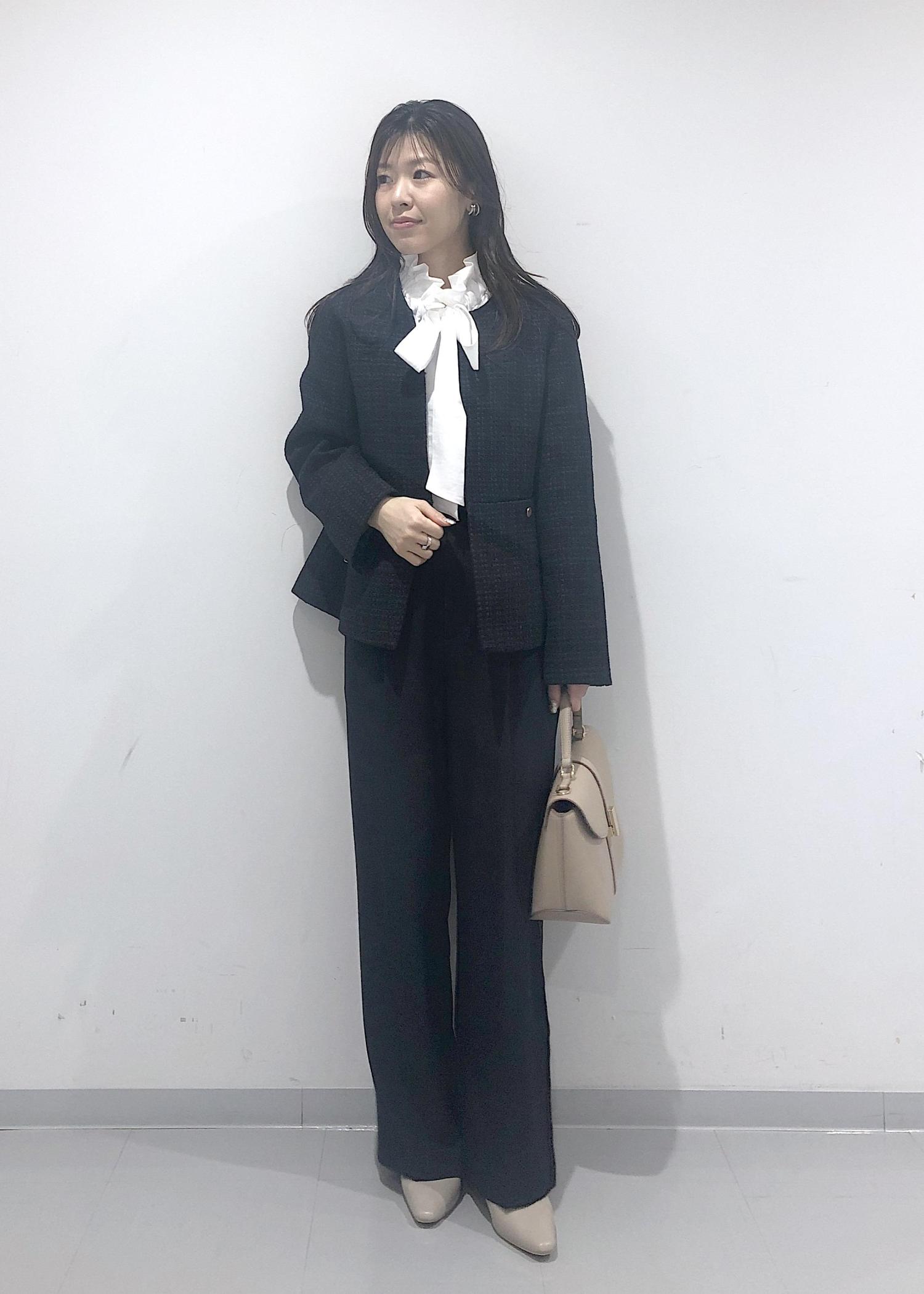 首周りが華やかなフリルリボンのブラウスに、ネイビーの上品見えするペプラムツイードジャケットを羽織り、ネイビーのワイドパンツを合わせた、セレモニー(卒業)コーデです!