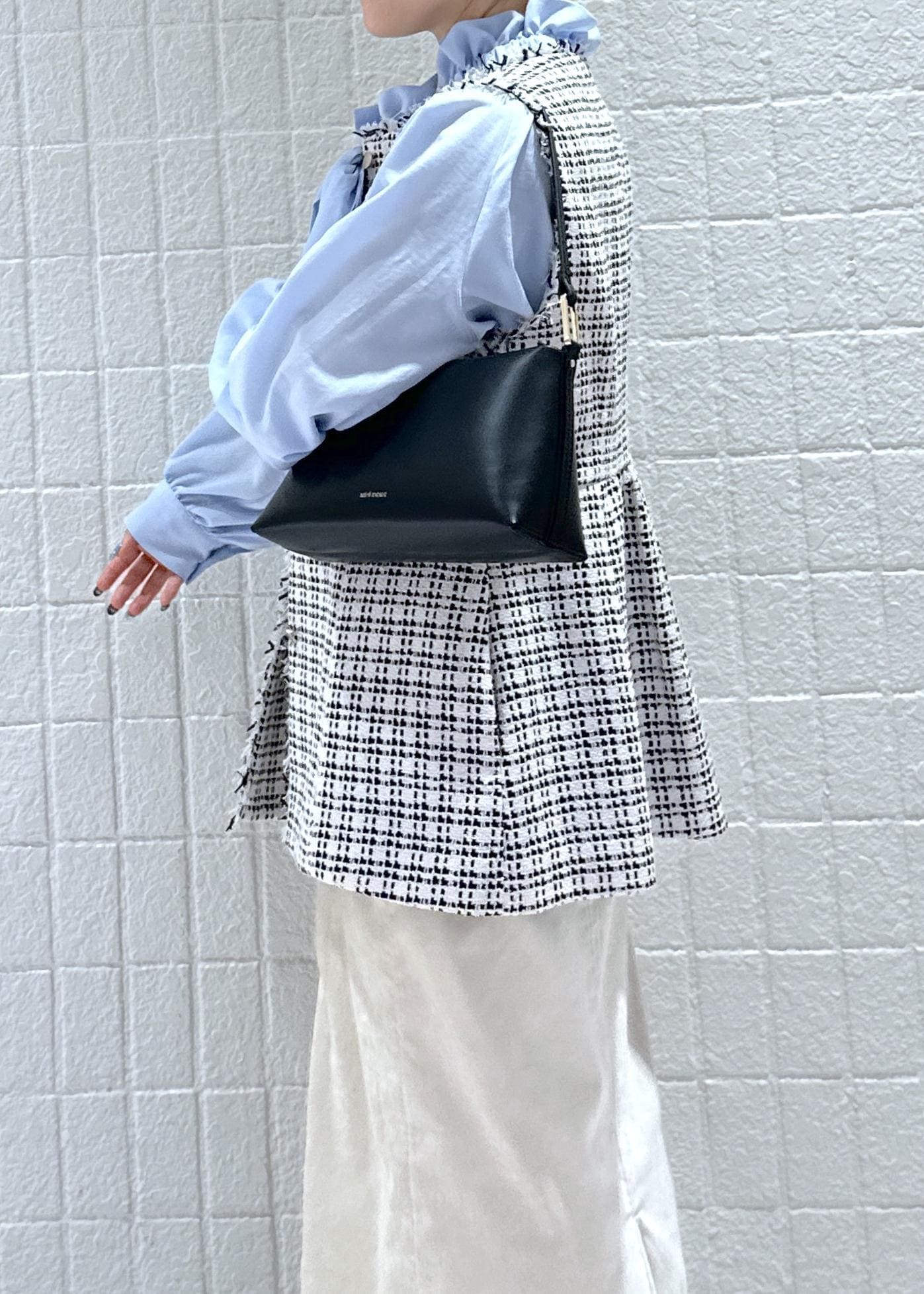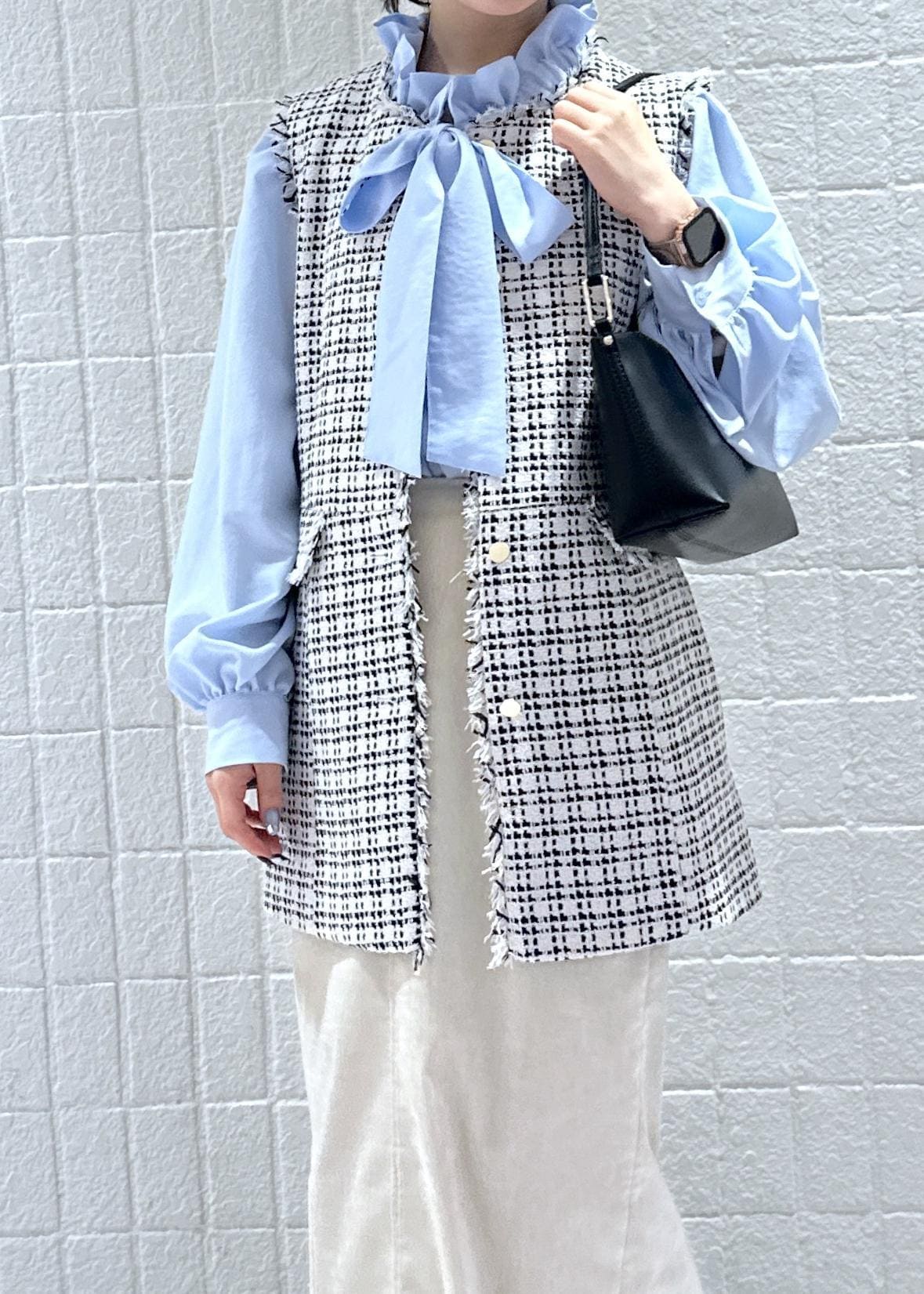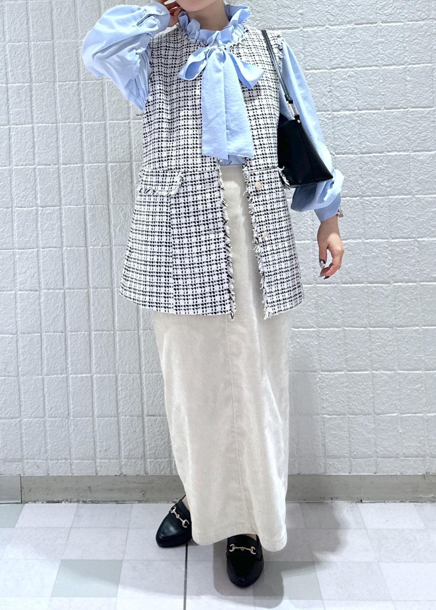 ツイードジレを使ったキレイめコーディネートです。