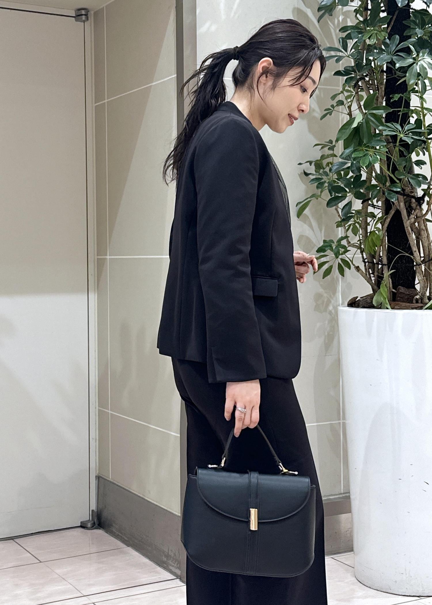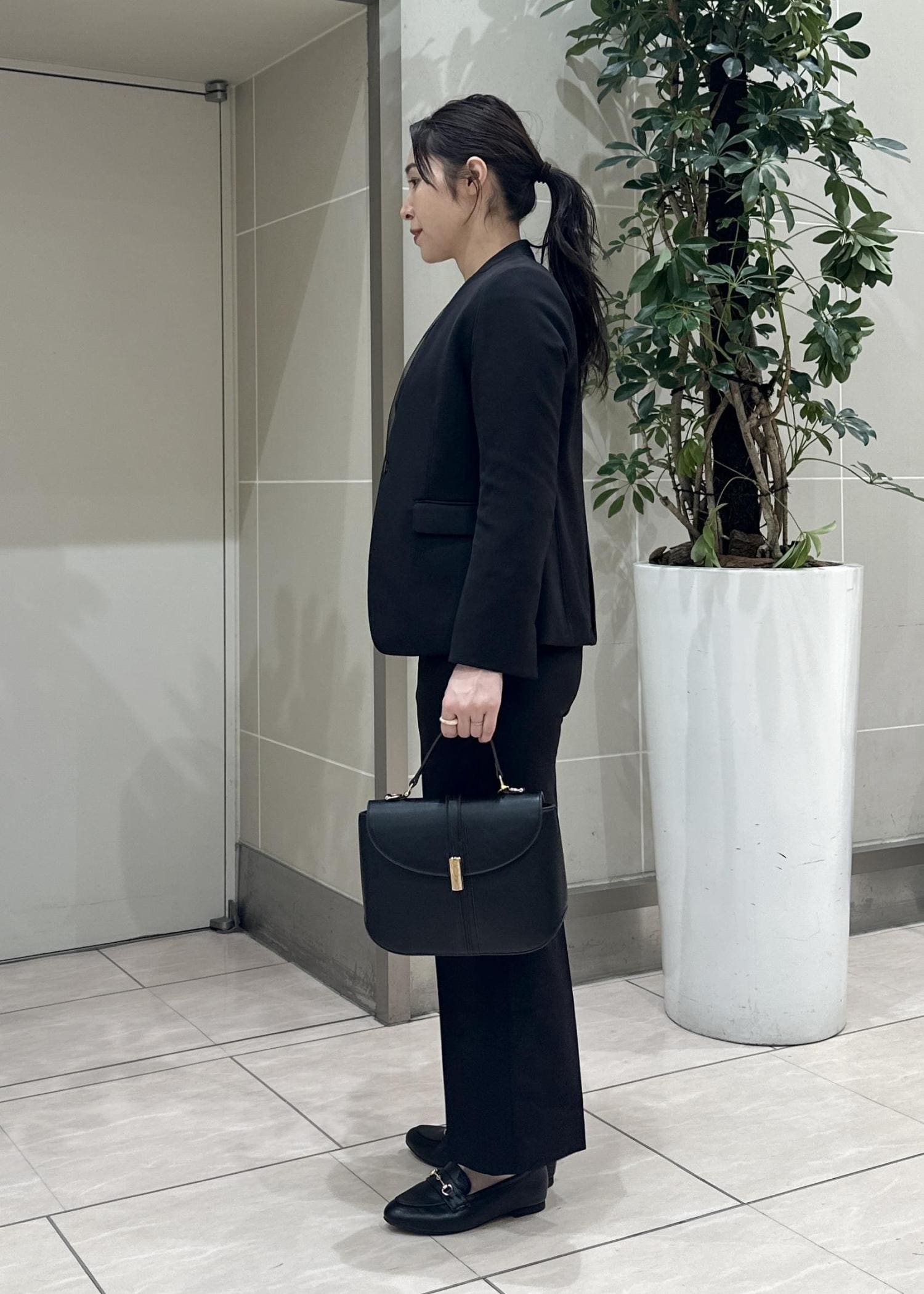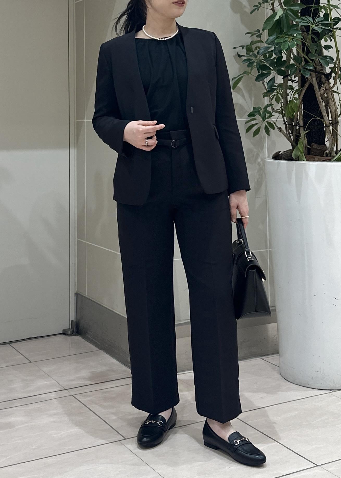 ノーカラージャケット×ワイドパンツなのでカチッとし過ぎないセットアップ。