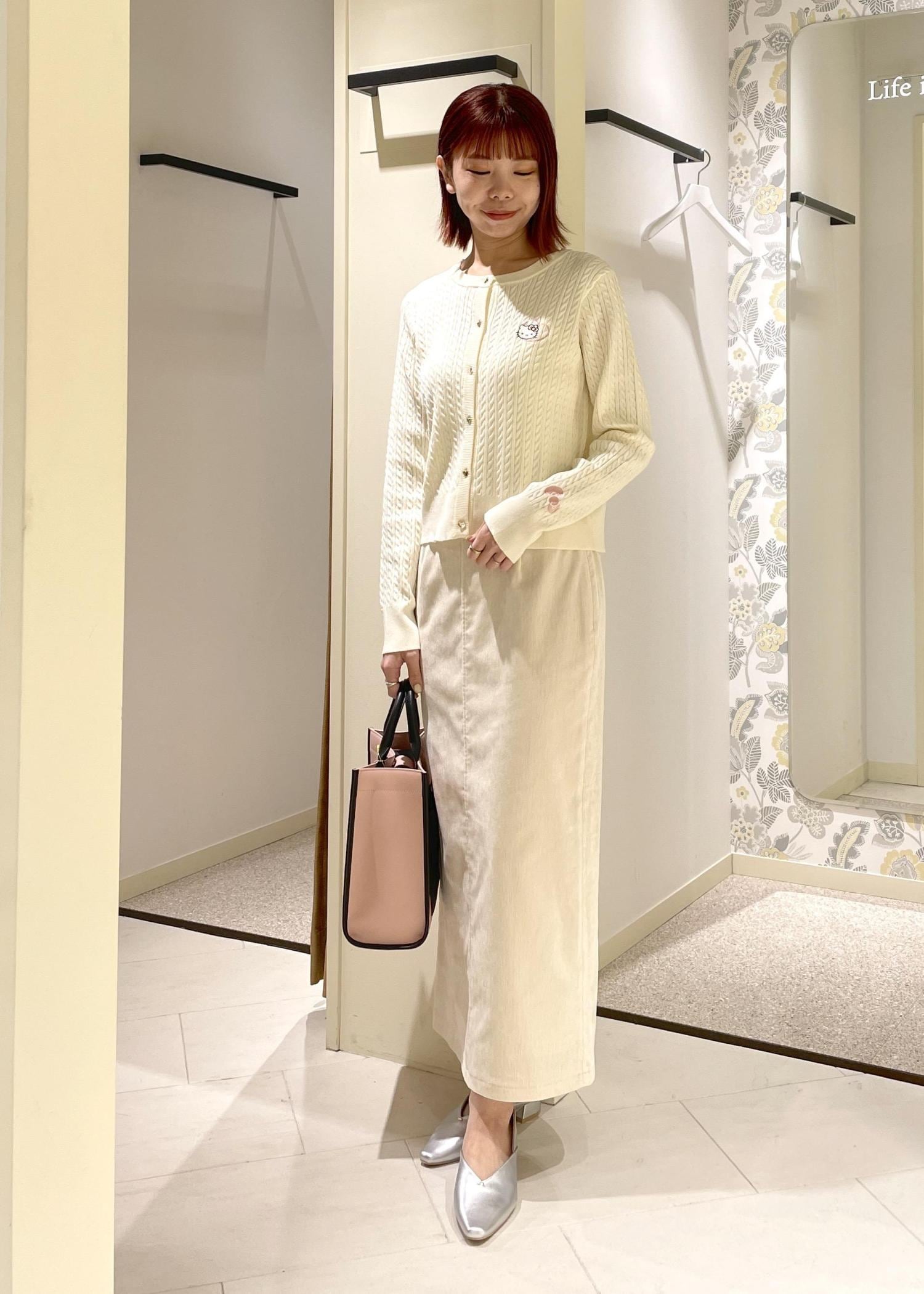 カーディガンも胸元と袖口のワンポイントがさりげなく可愛らしく、ケーブル編みなので、ワントーンでまとめてもシンプルすぎないのがポイントです◎