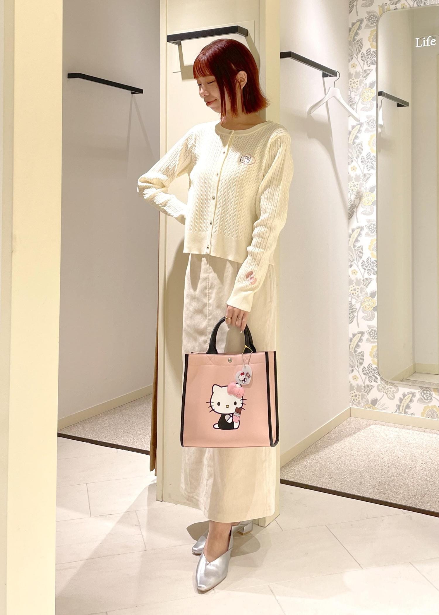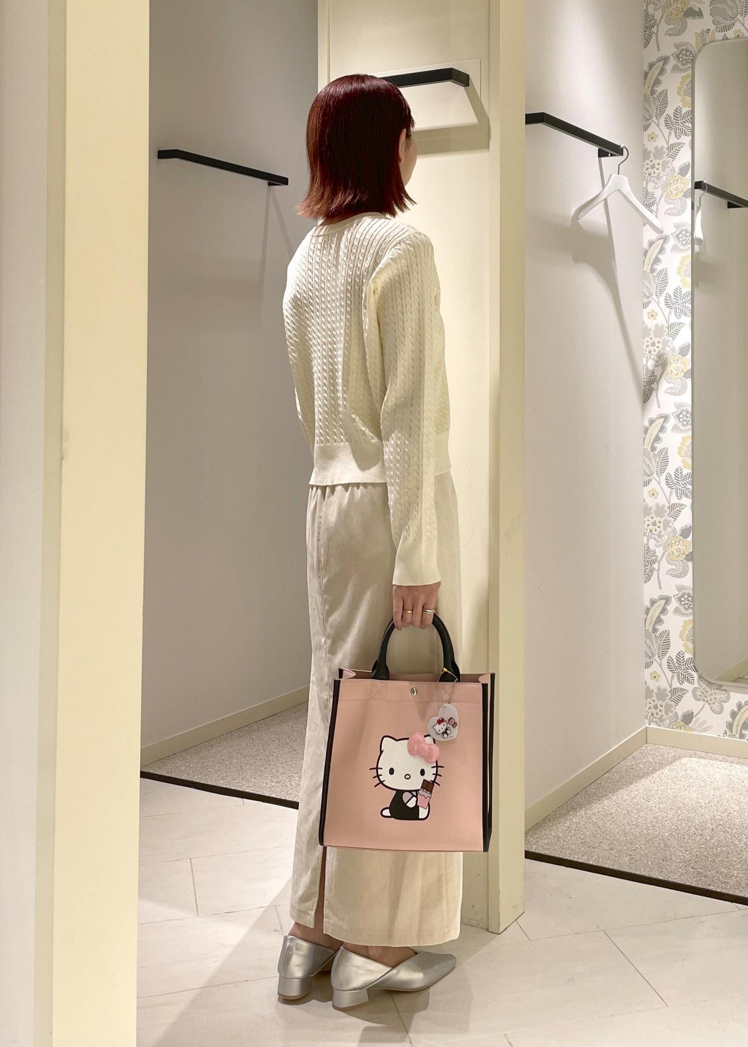 ホワイトのワントーンコーデにハローキティ第2弾のチャーム付きトートをアクセントに合わせた春の先取りコーデ