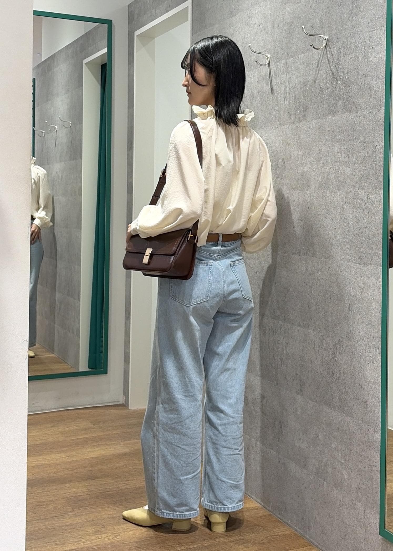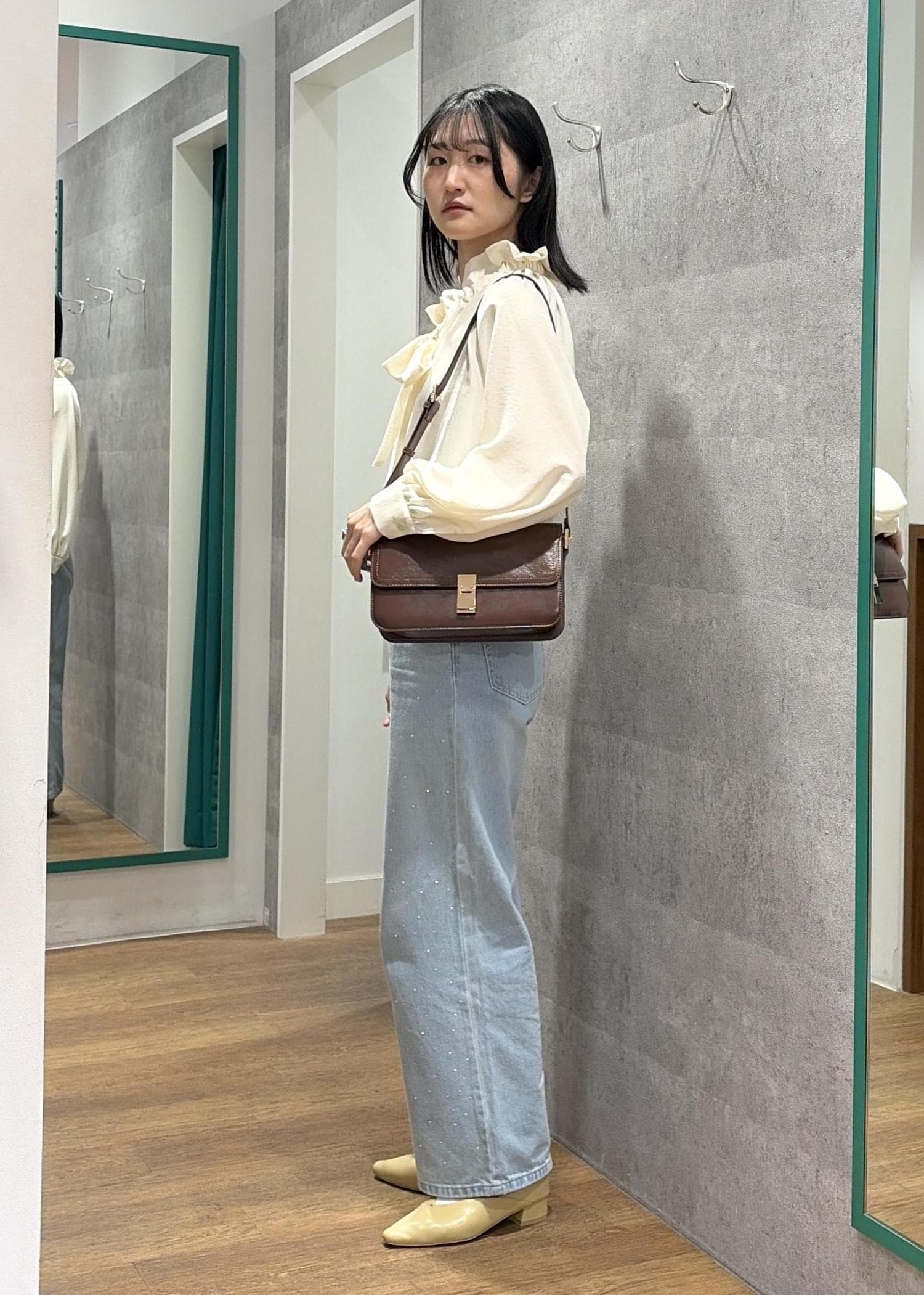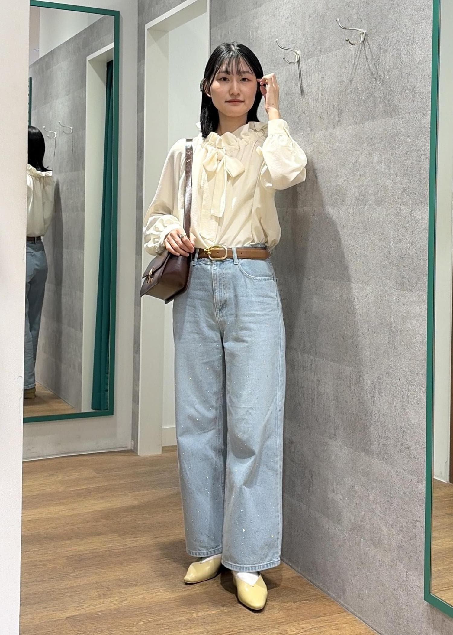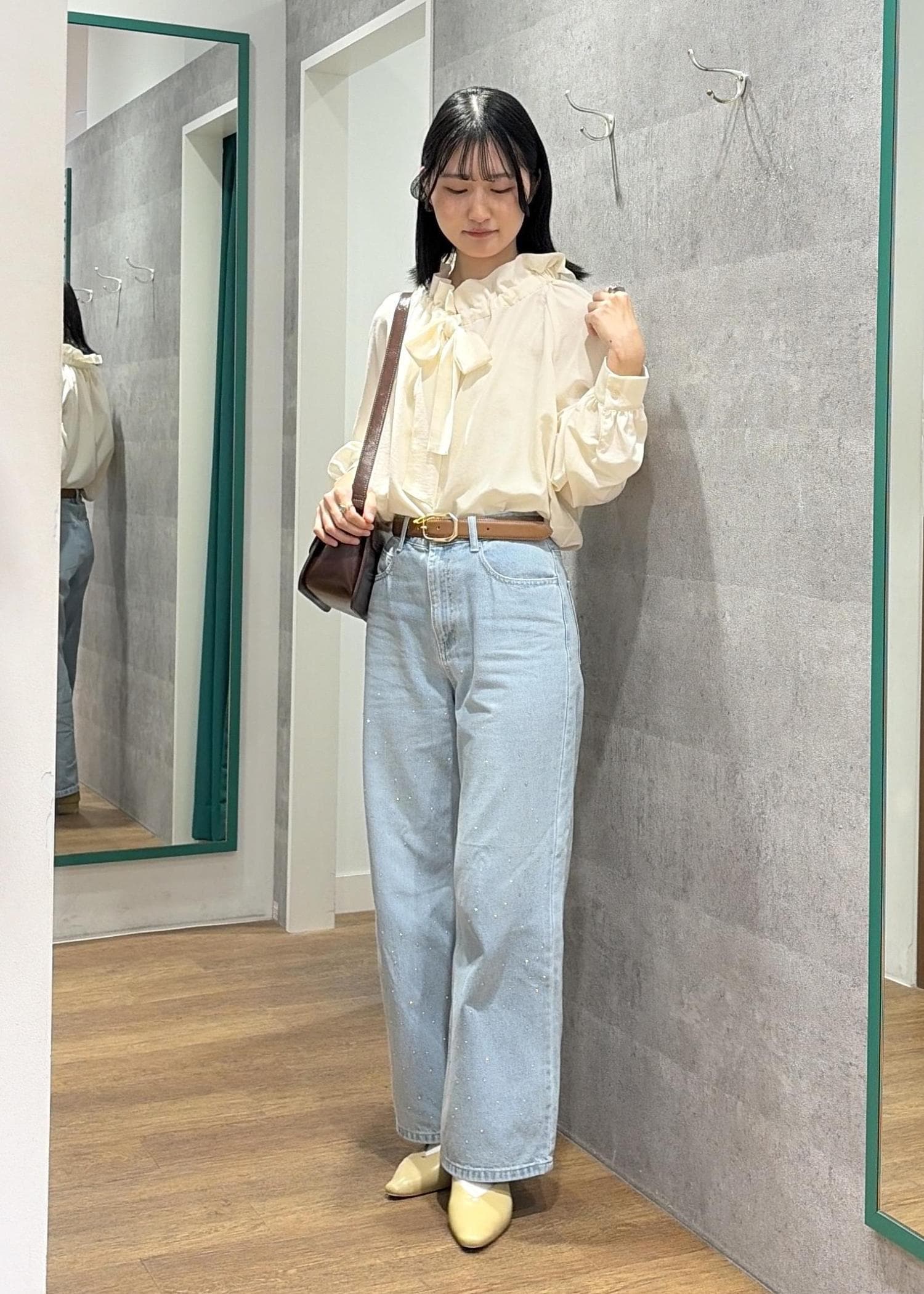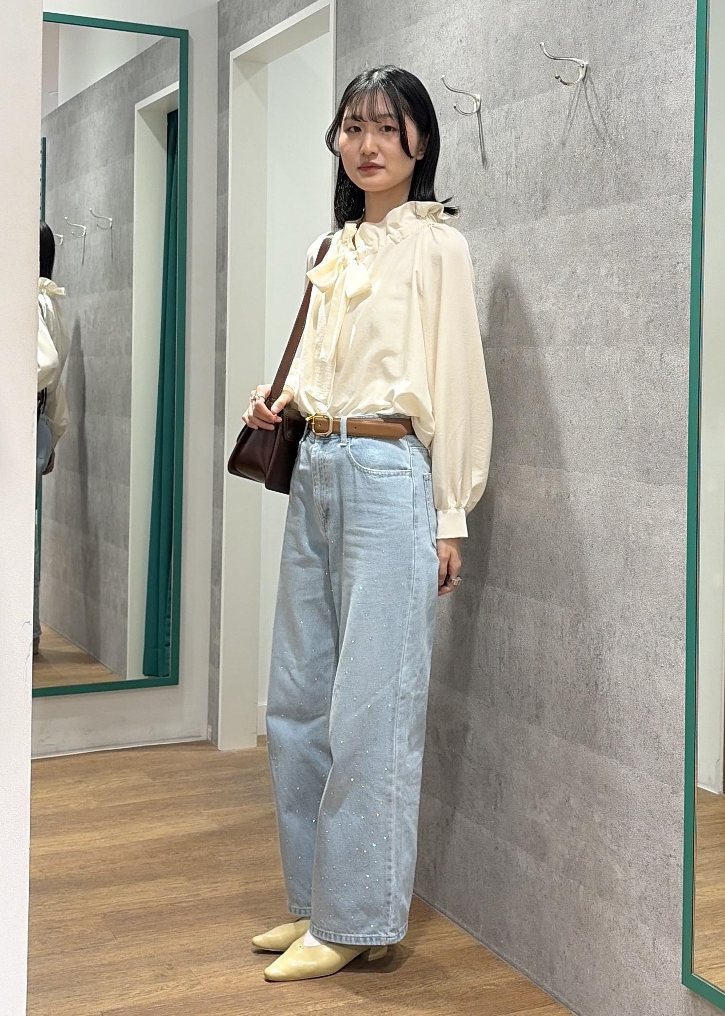 普段のデニムをビジューデニムに変えるだけでトレンド感のあるコーデになります。 -