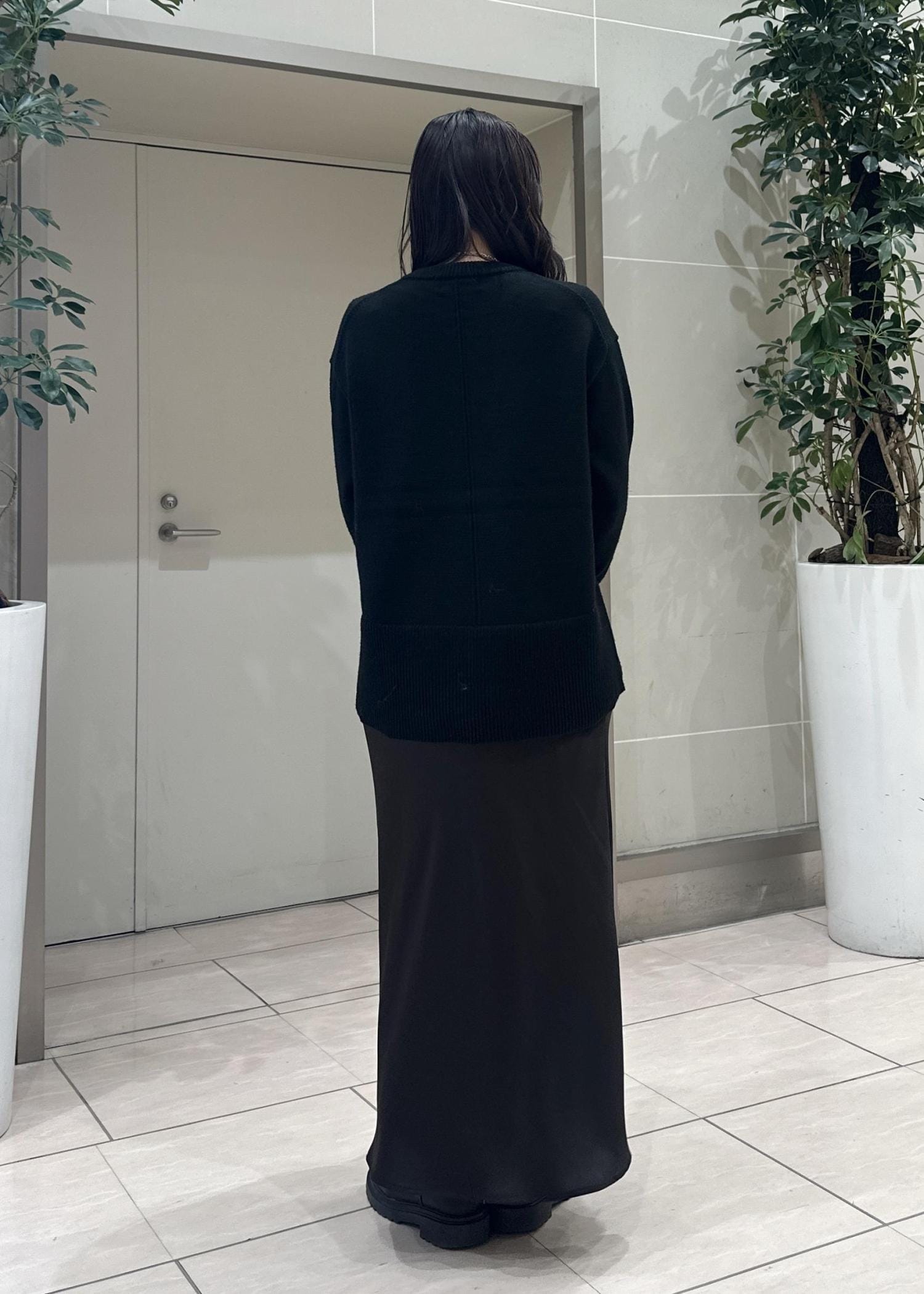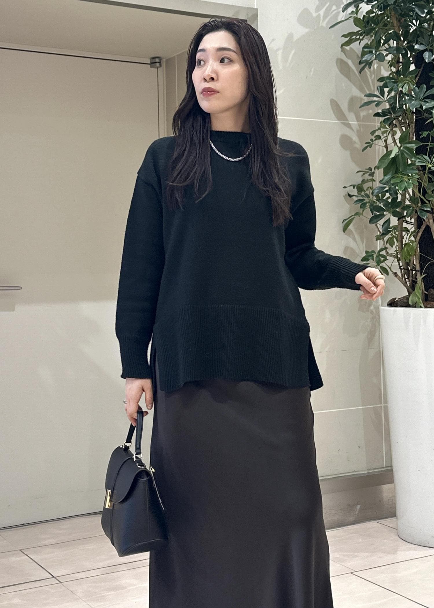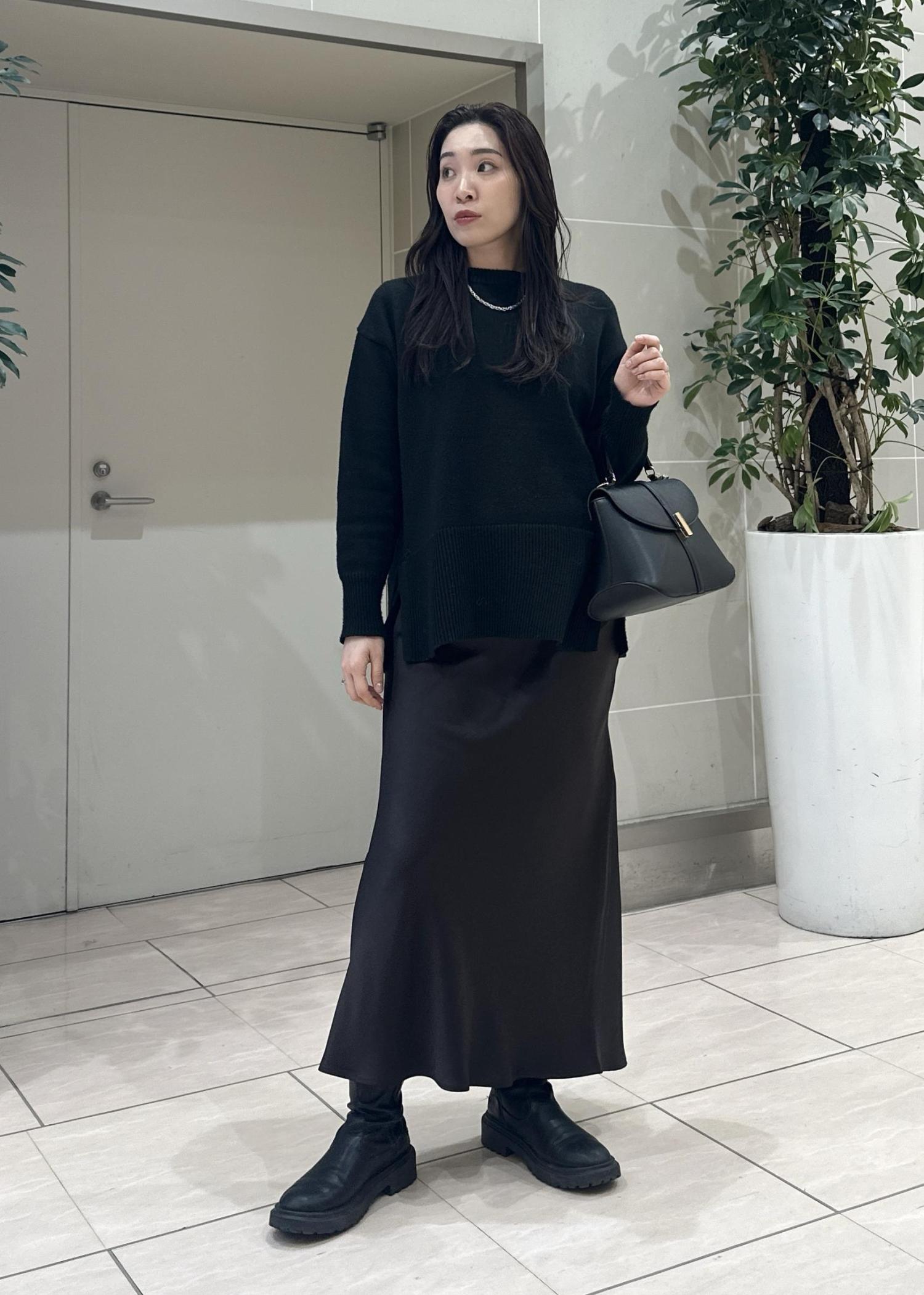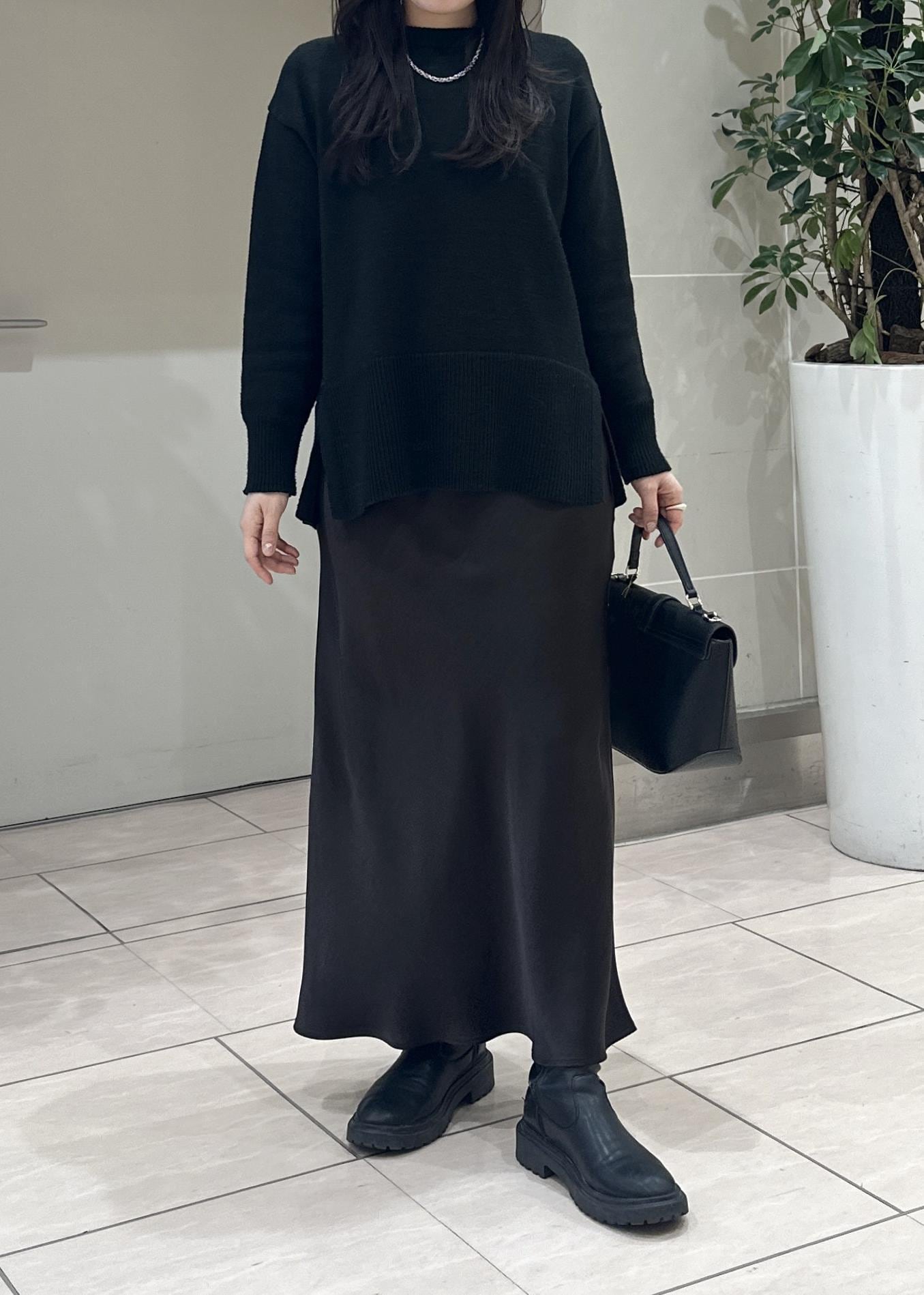 定番のニットにサテンスカートを合わせたコーデ。
