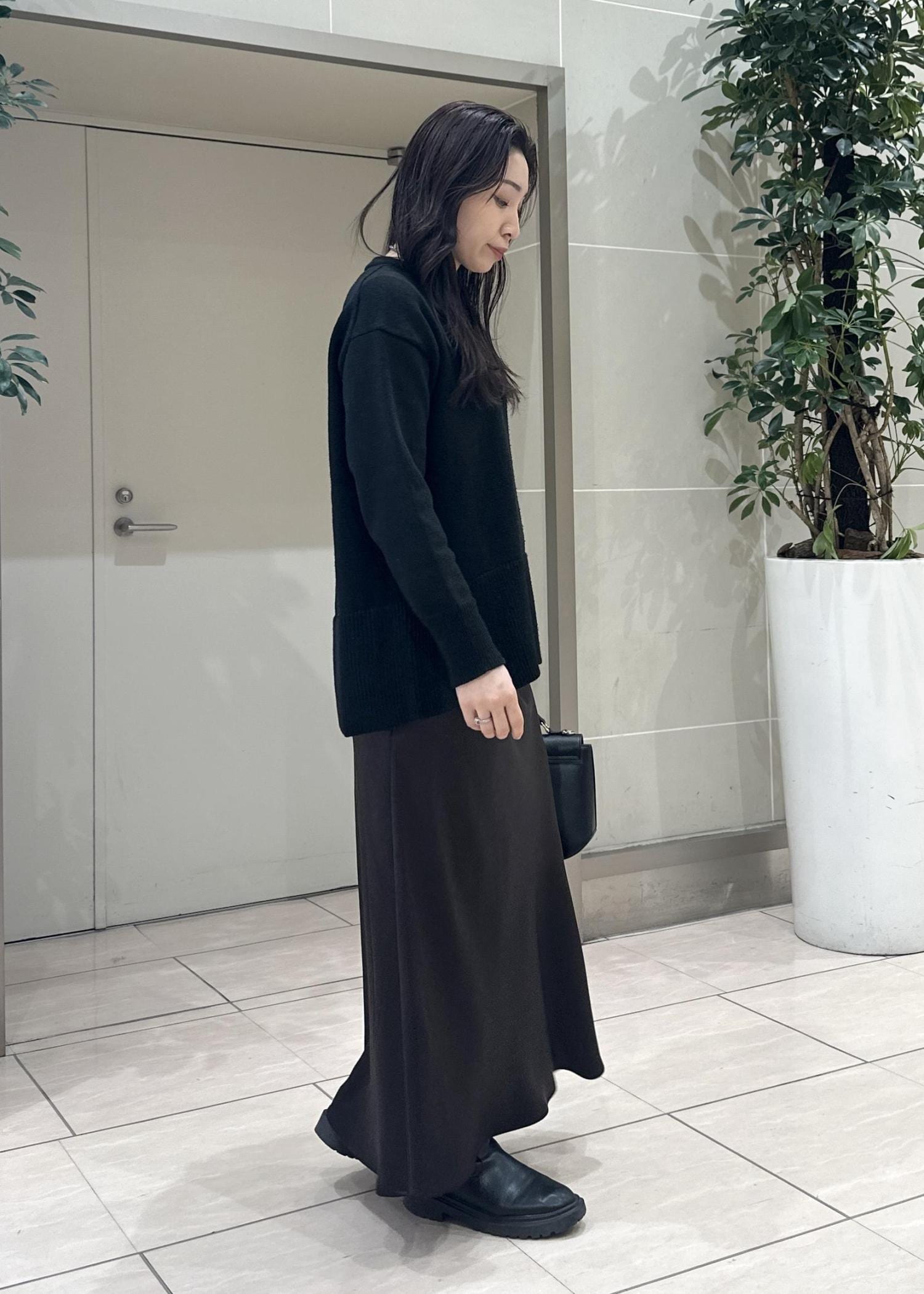 濃いブラウンのカラーのサテンスカートは大人っぽくおしゃれな印象に。