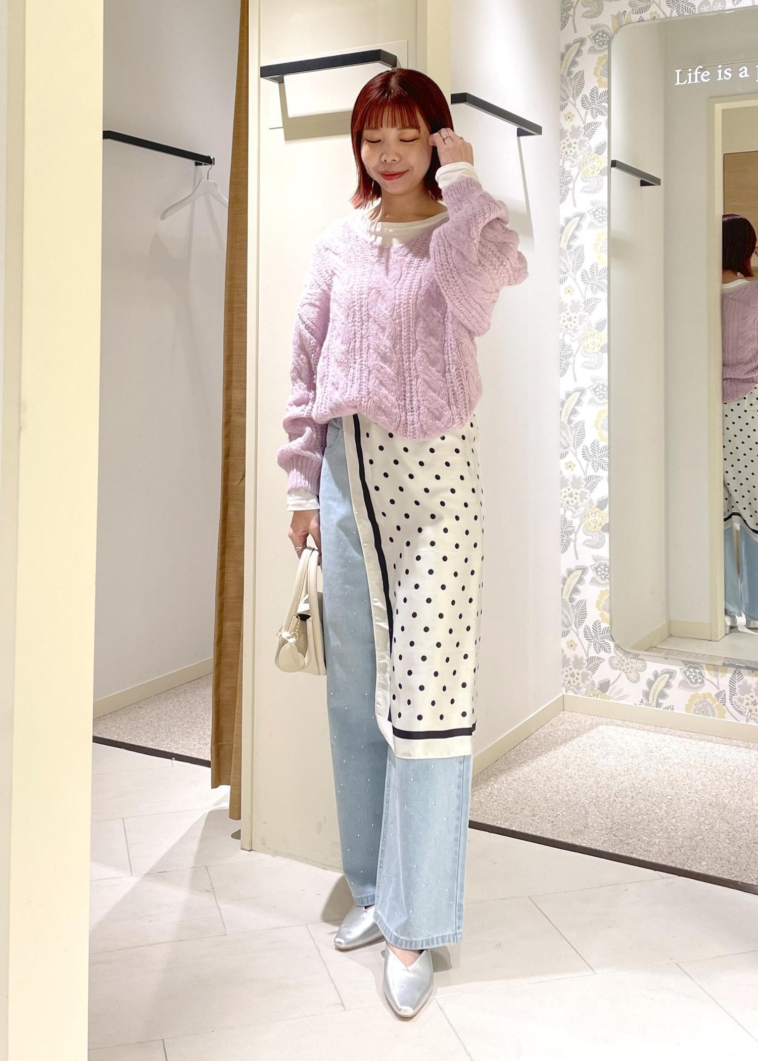 小物から春物を取り入れて、ドット柄のスカーフを腰にまき、シルバーのシューズで軽さのあるコーディネートにまとめてみました。
