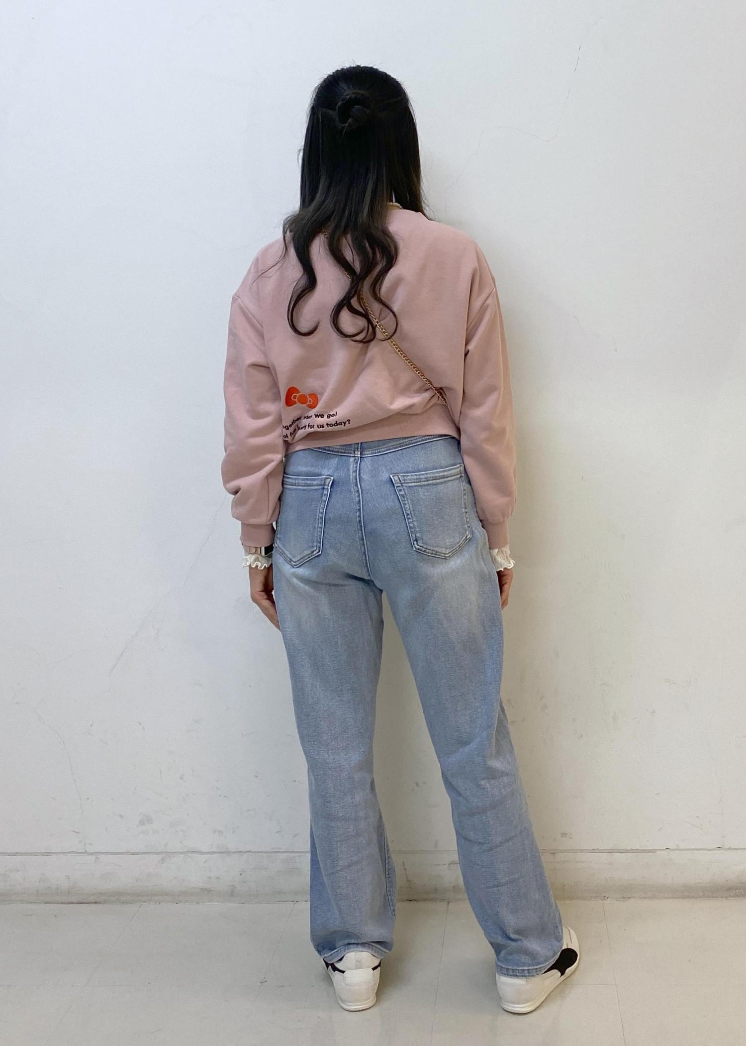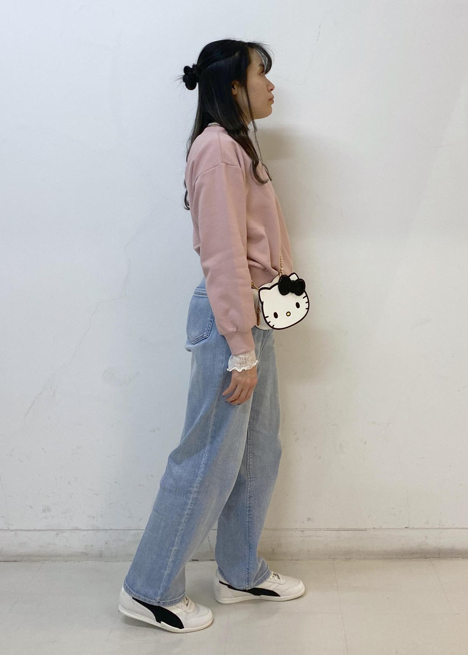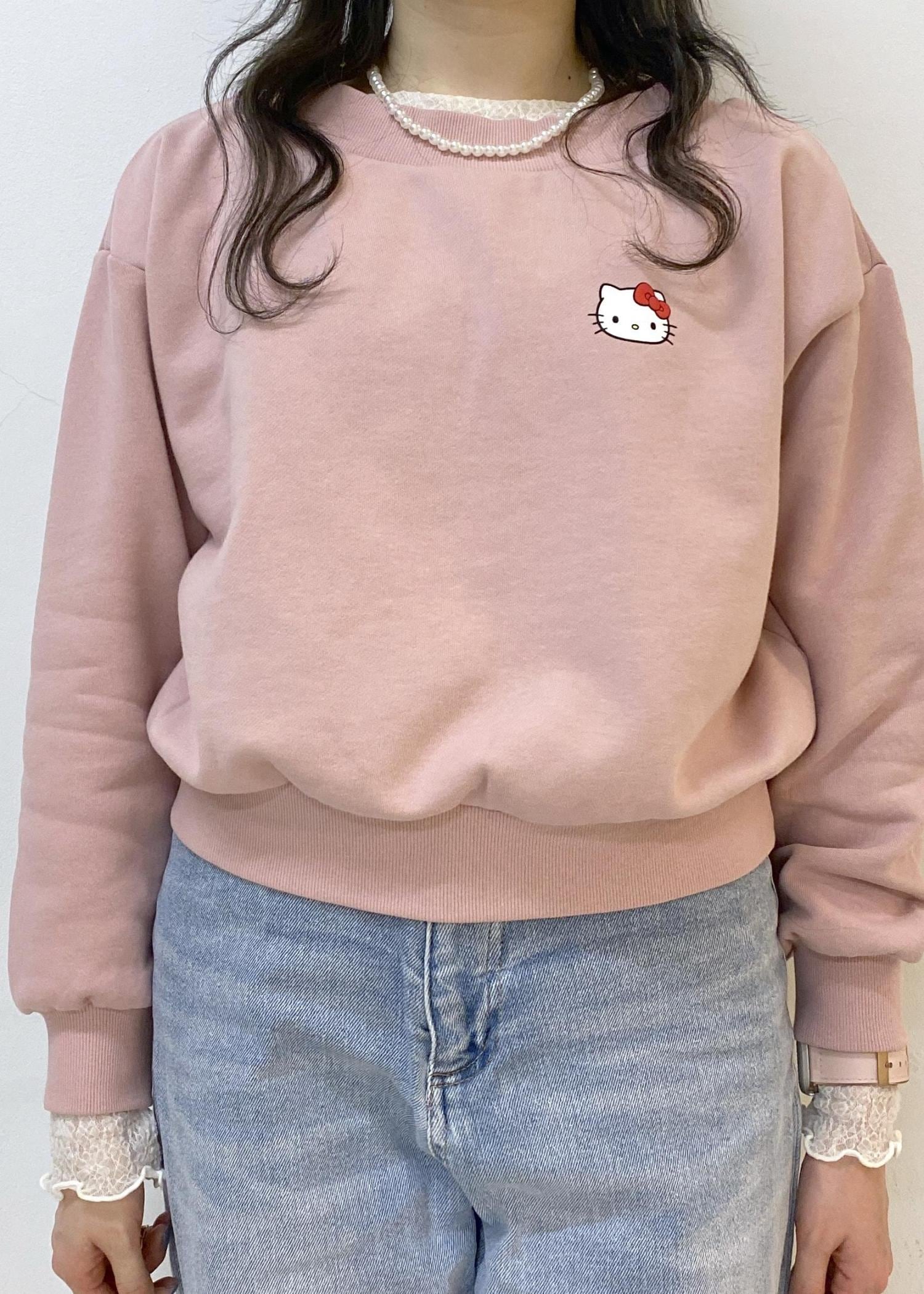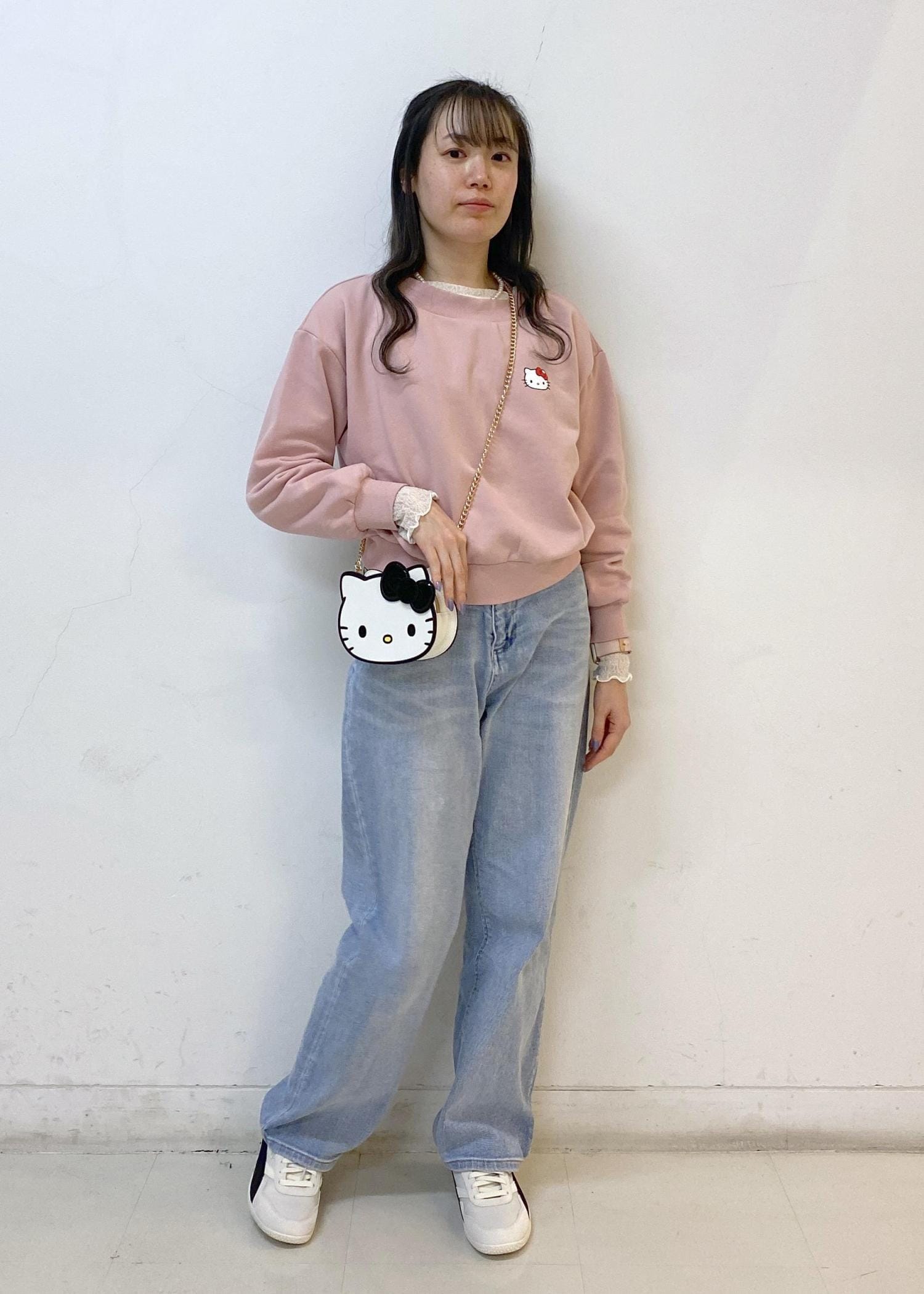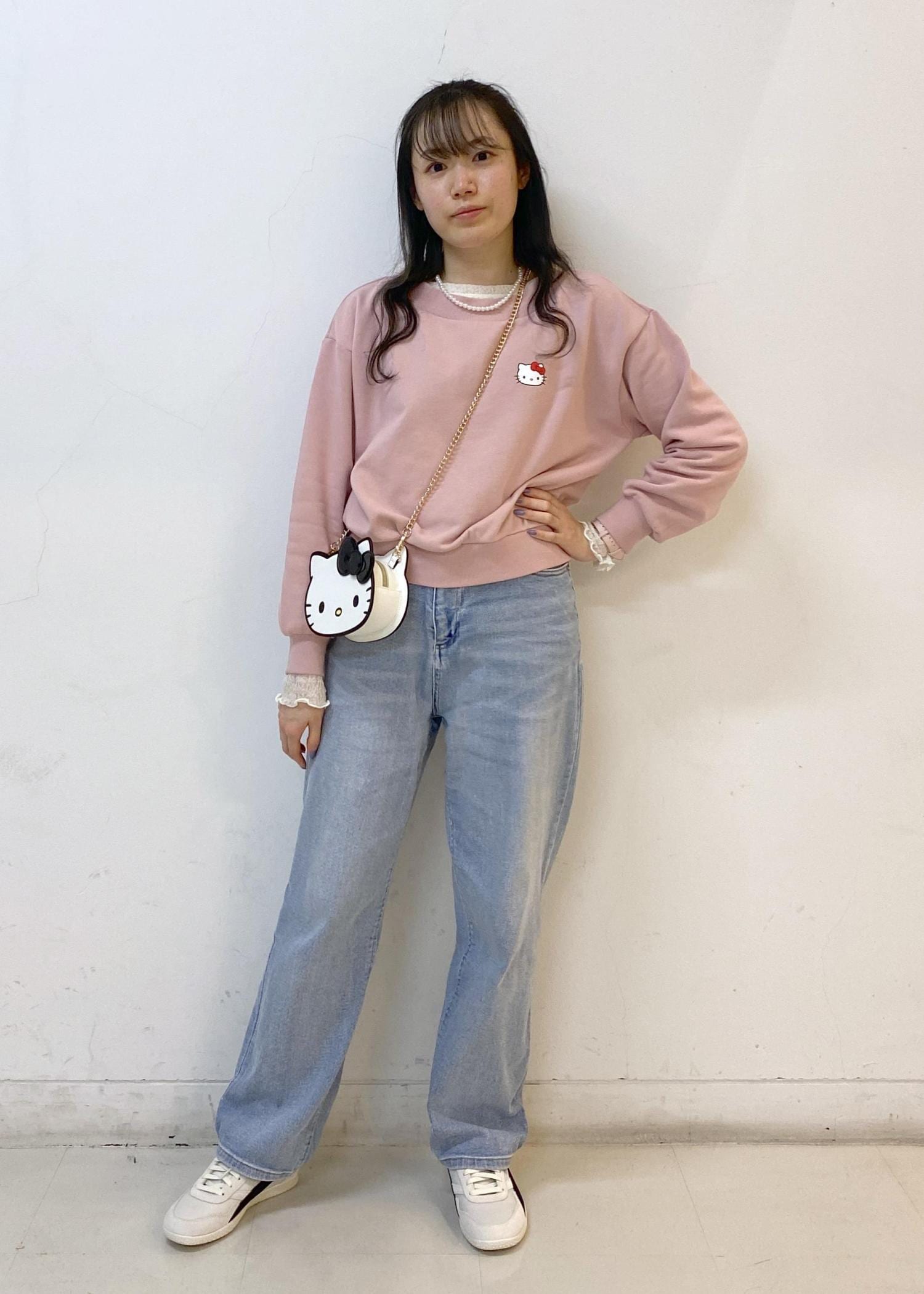 ハローキティのトレーナーは襟ぐりがやや広めなのでレースインナーをレイヤードしてオシャレな着こなしに。