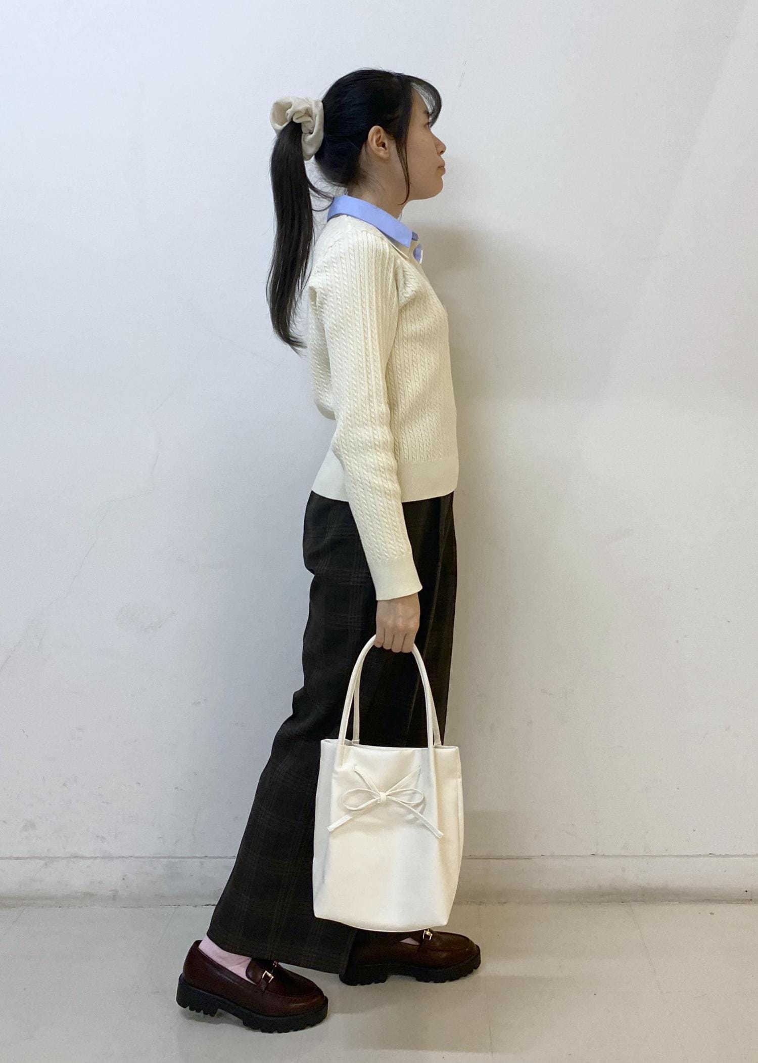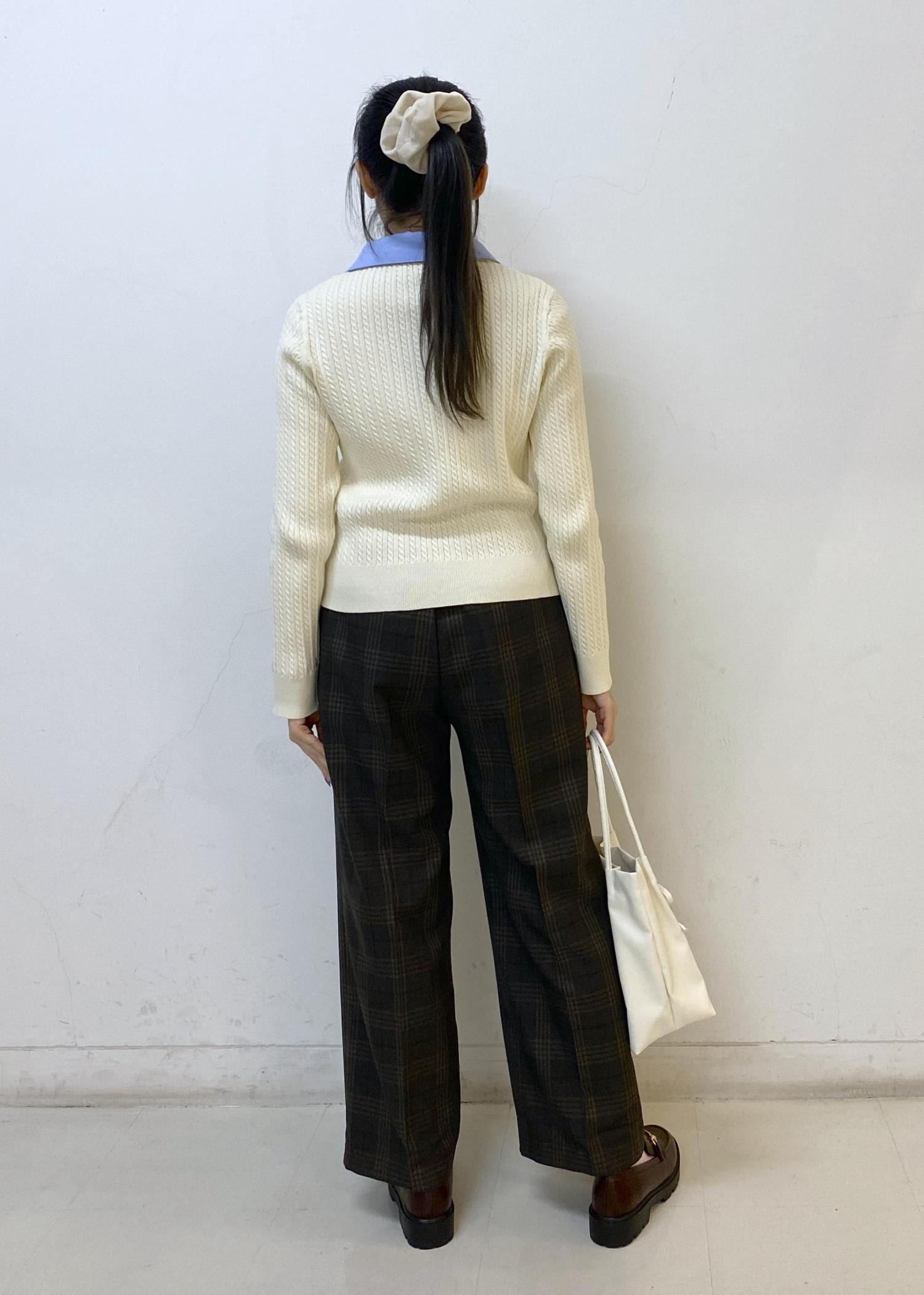 襟付きニットにチェックのパンツを合わせてプレッピーにまとめました。