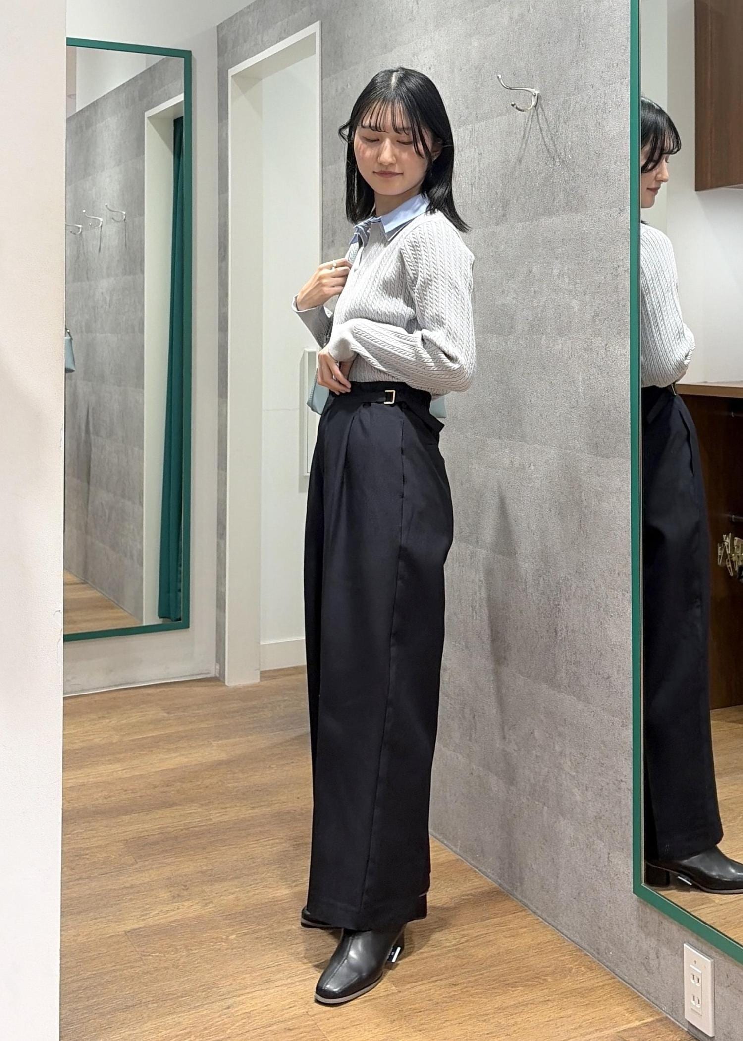 ワイドシルエットで脚のラインを拾わず、きれいに着用いただけます。