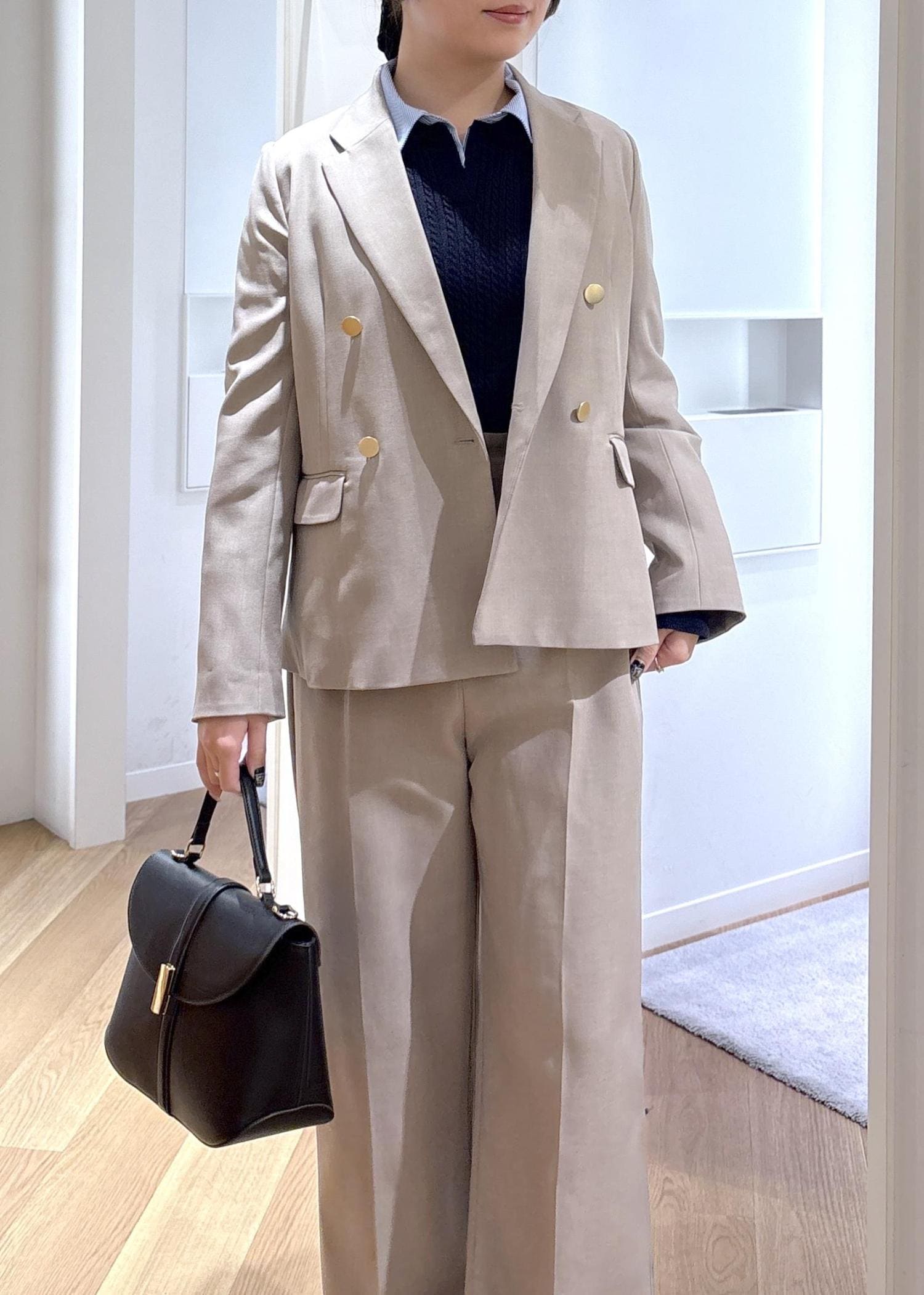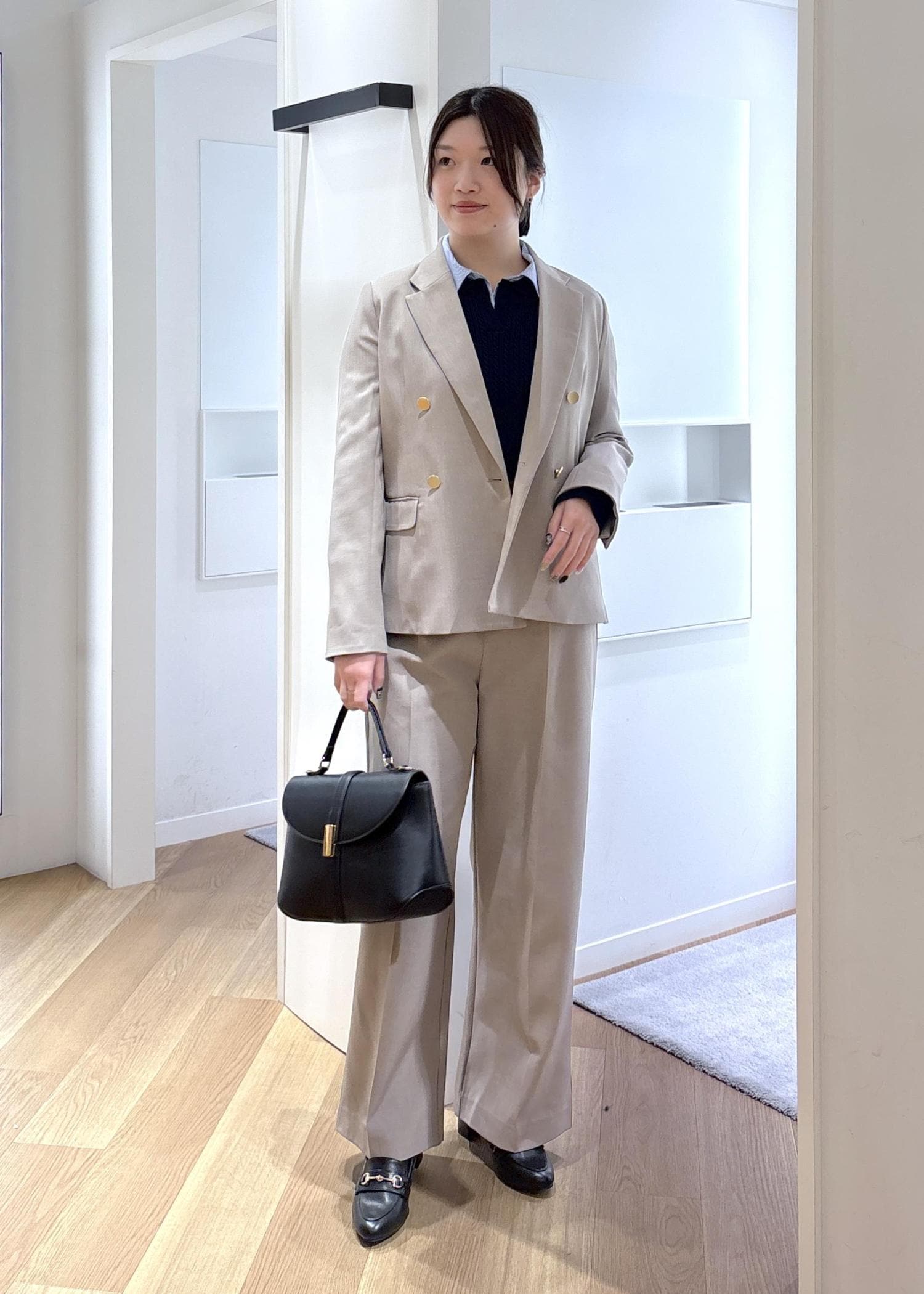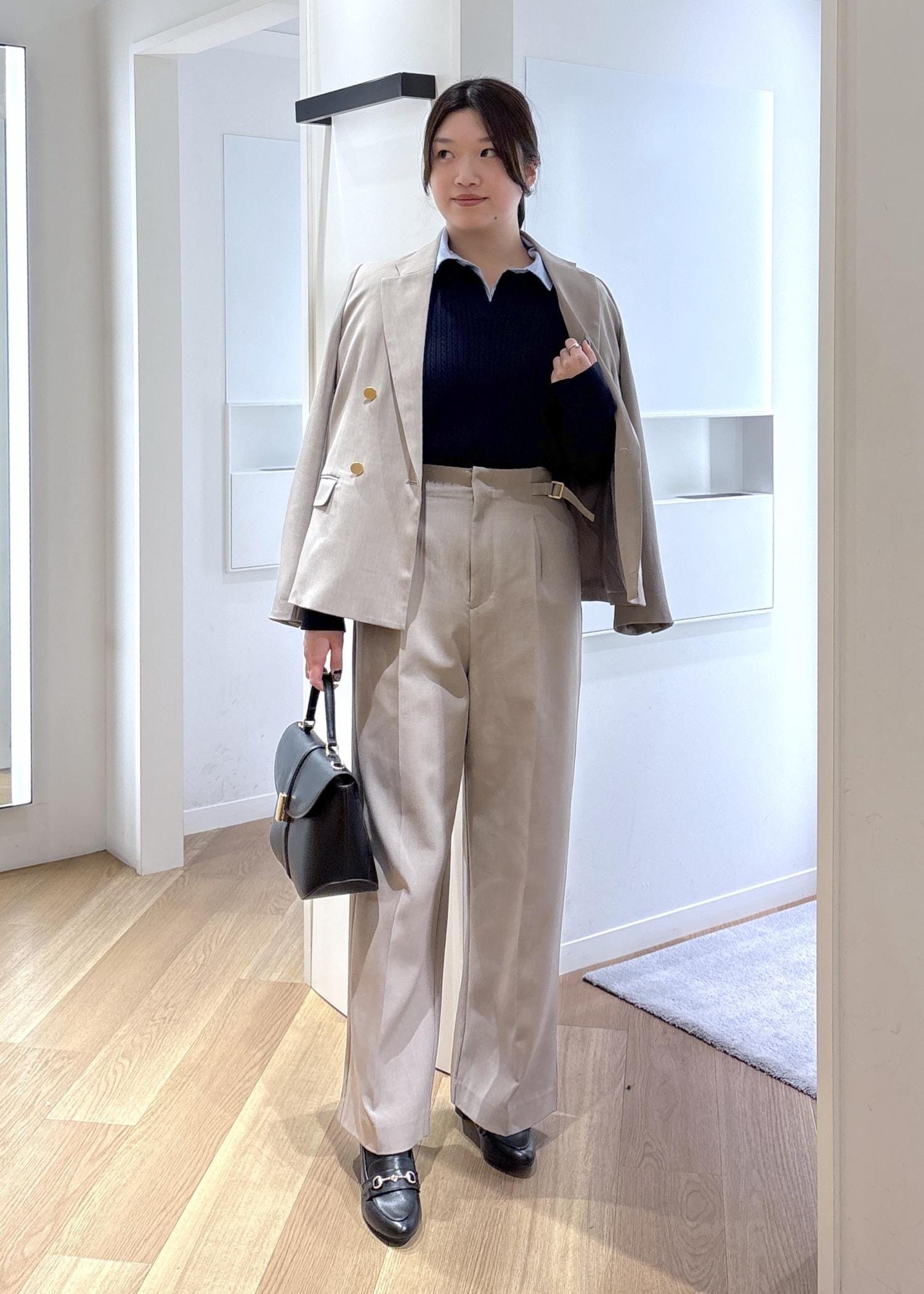 ベージュのカラーで春らしさをプラスしたセットアップコーデです。