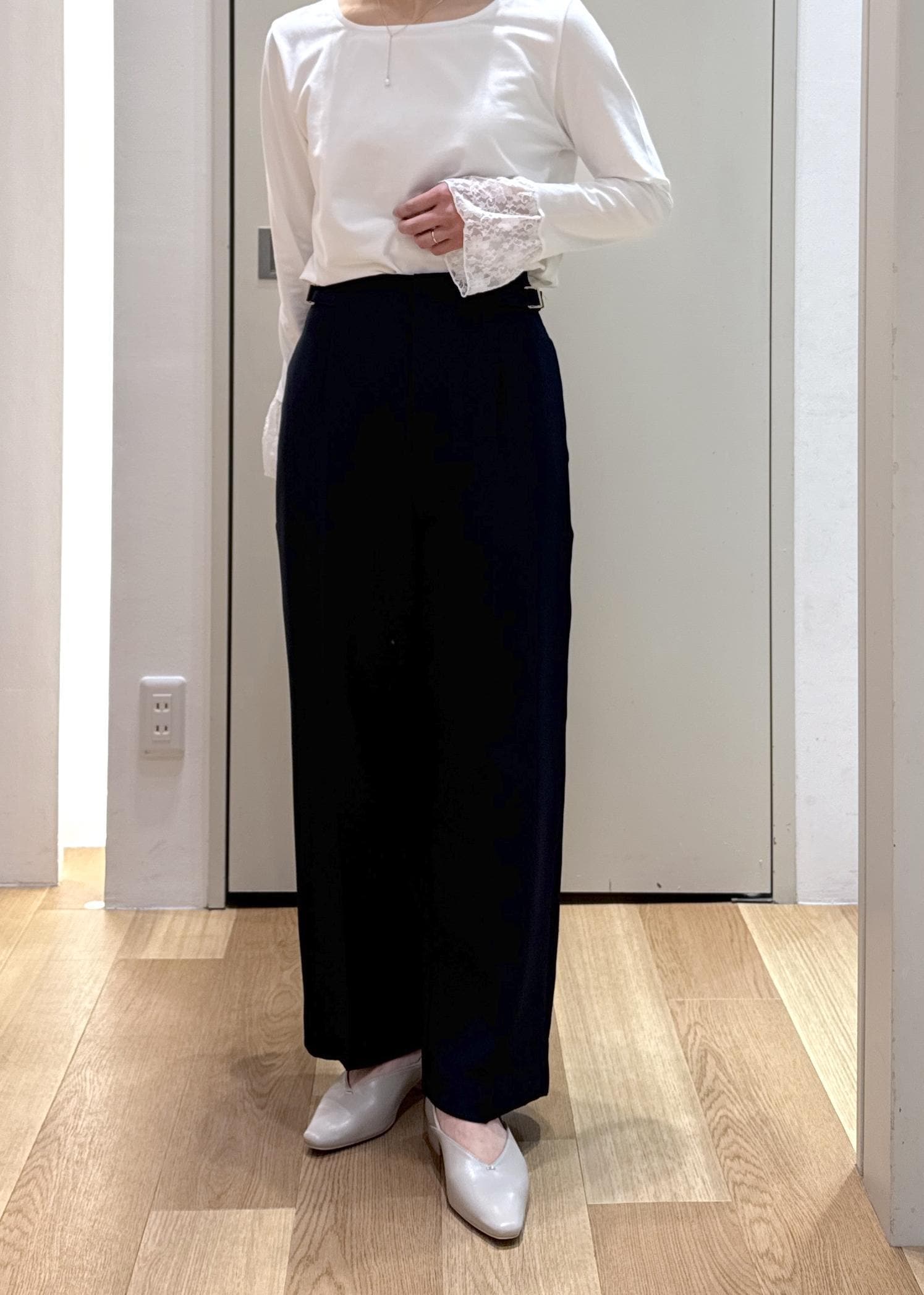 丈は155㎝でくるぶしが隠れるくらいで、フラットシューズでも床に付くことなく履けます。 -