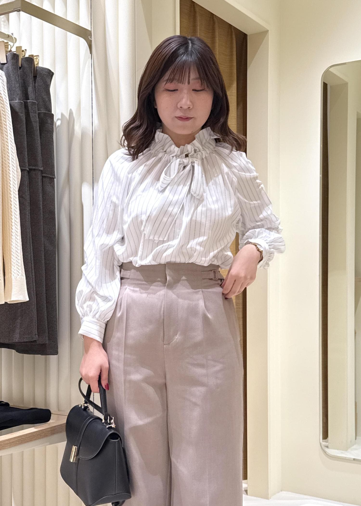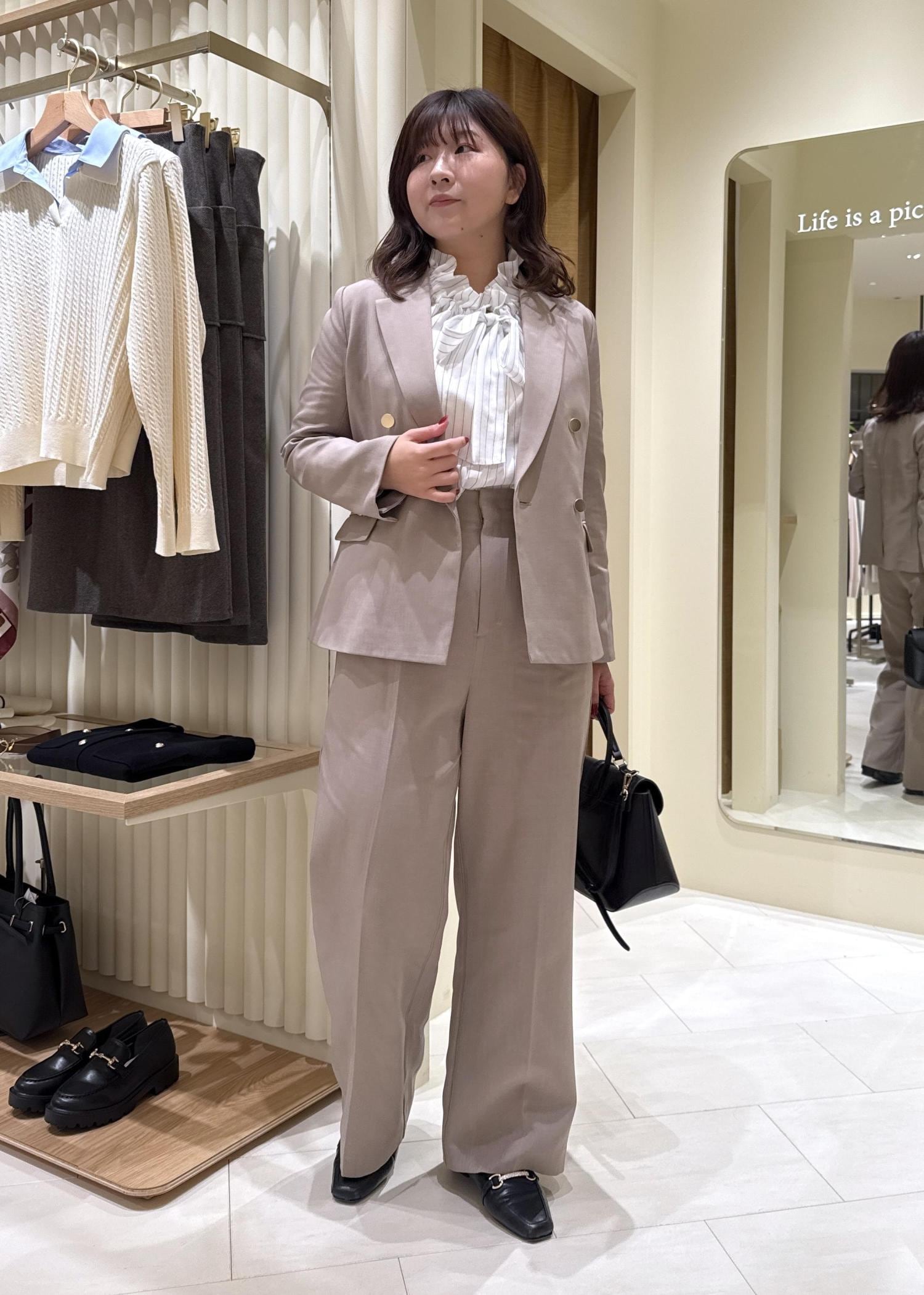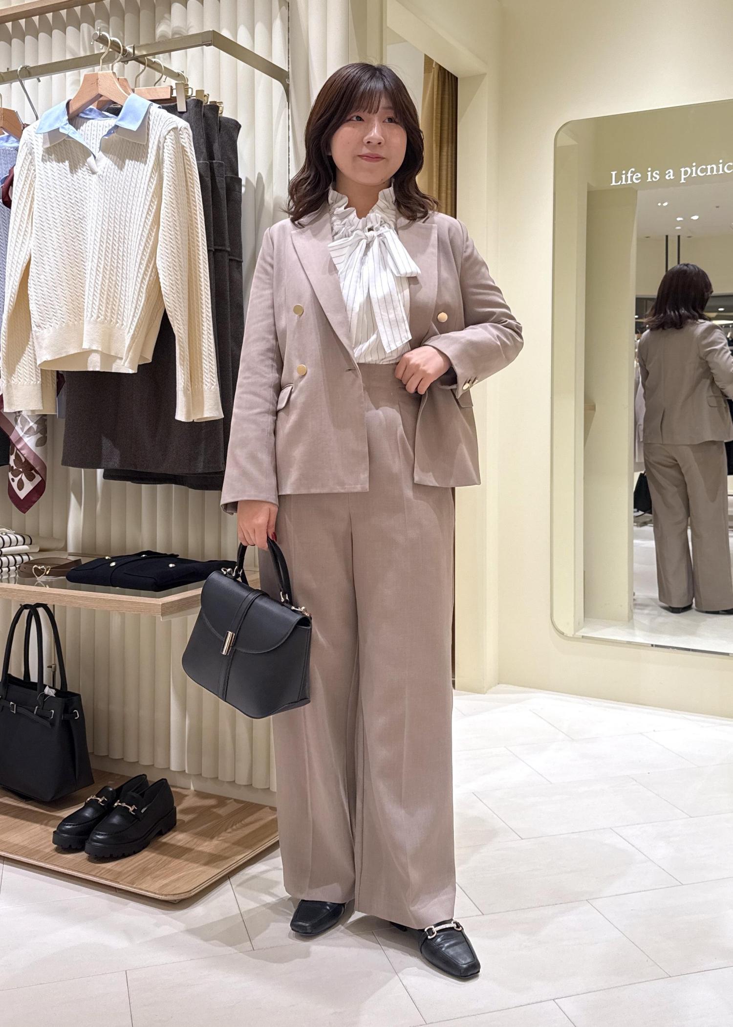 ベージュ上下なので小物は黒で引きしてきちんと感を。