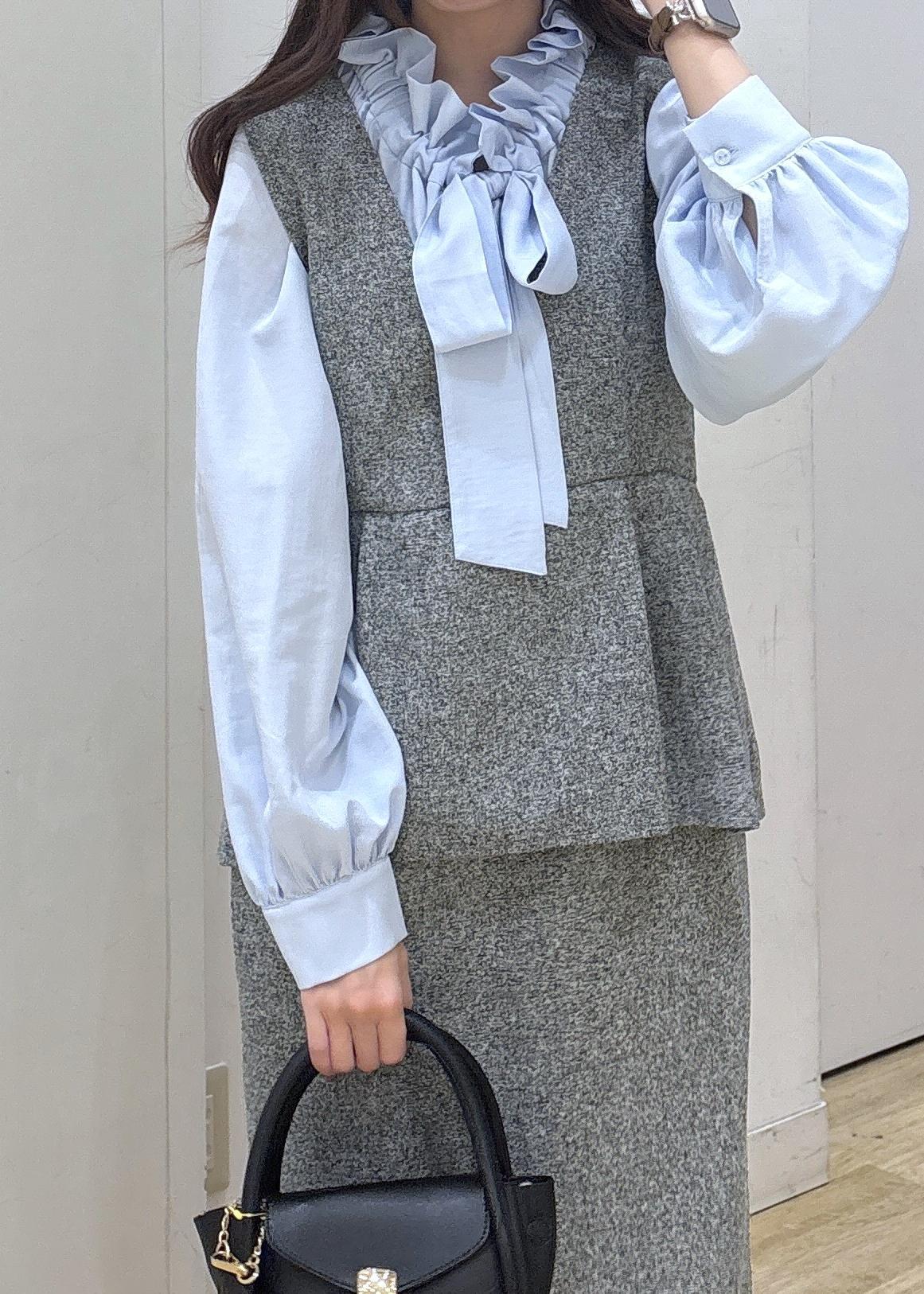 フリルの華やかなデザインブラウスに、セットアップ見えのワンピースを合わせてキレイめなコーデにしました!