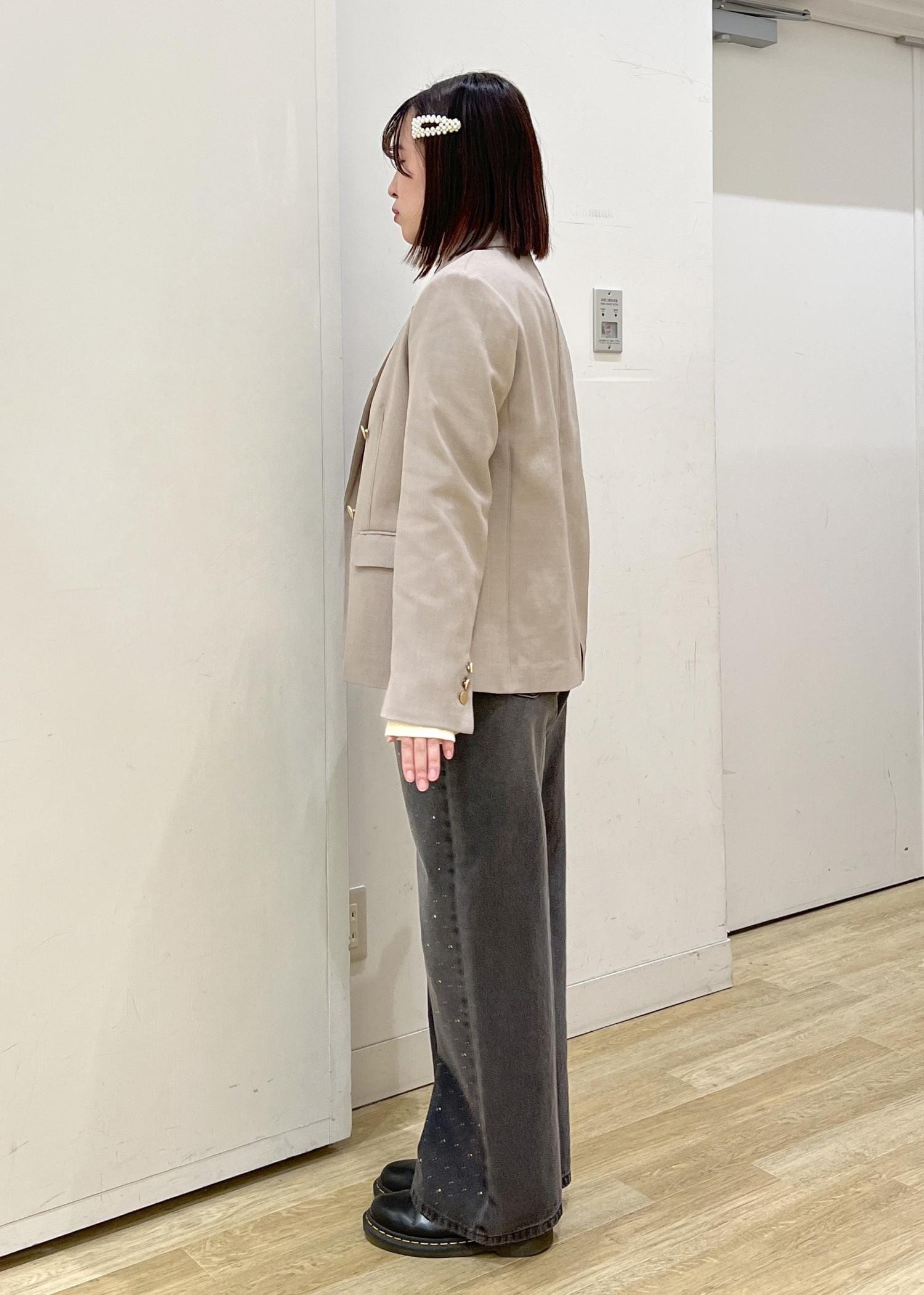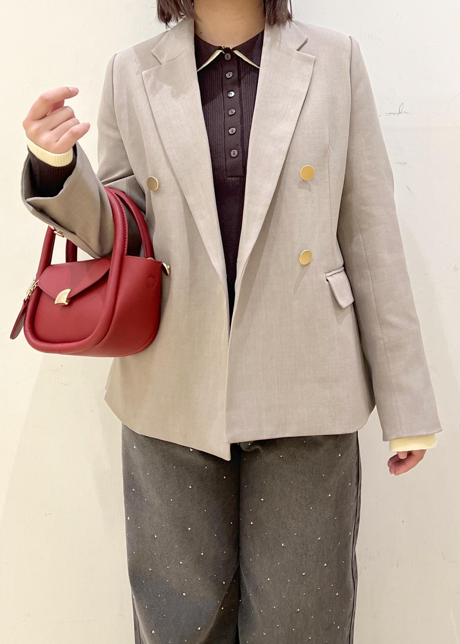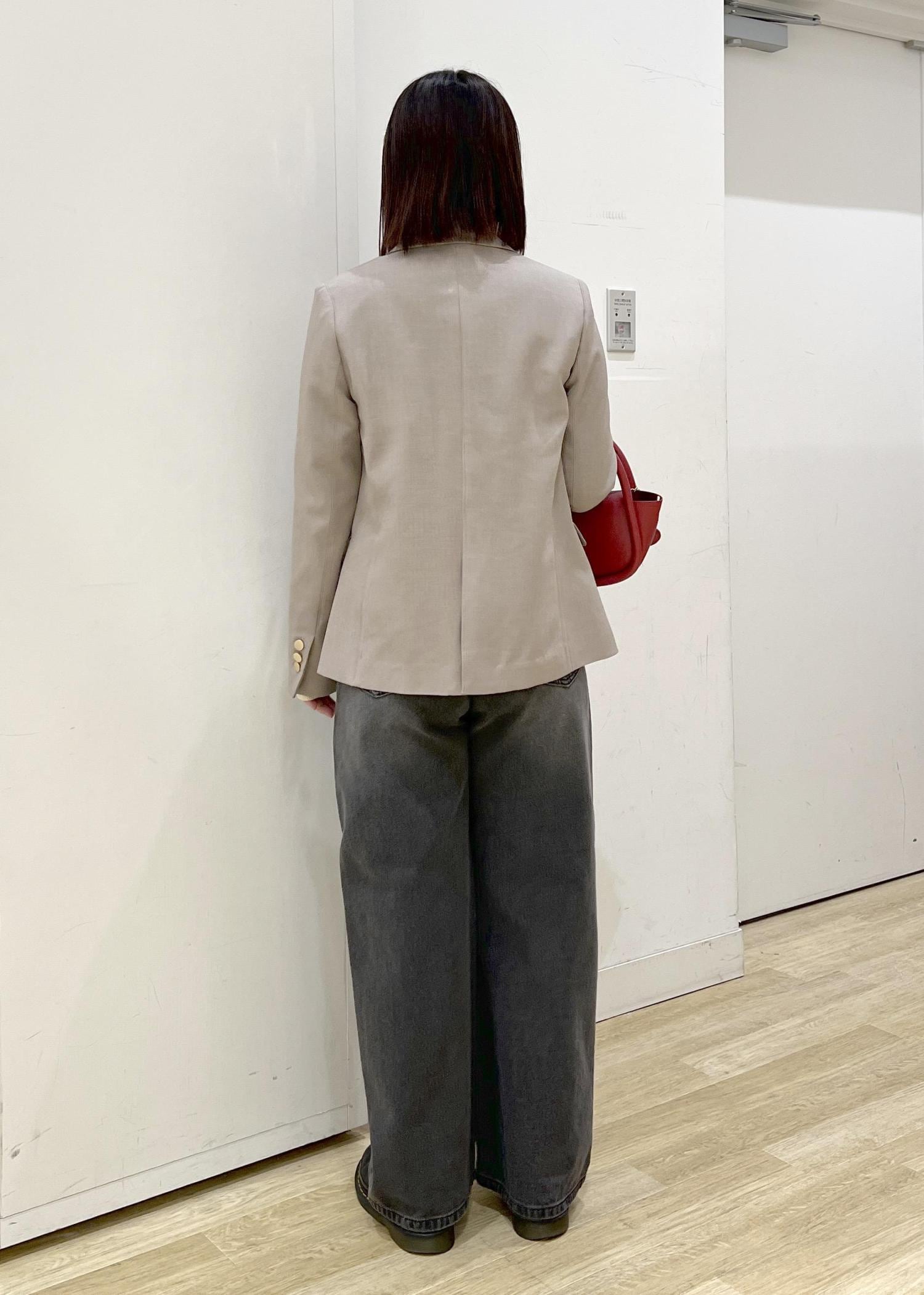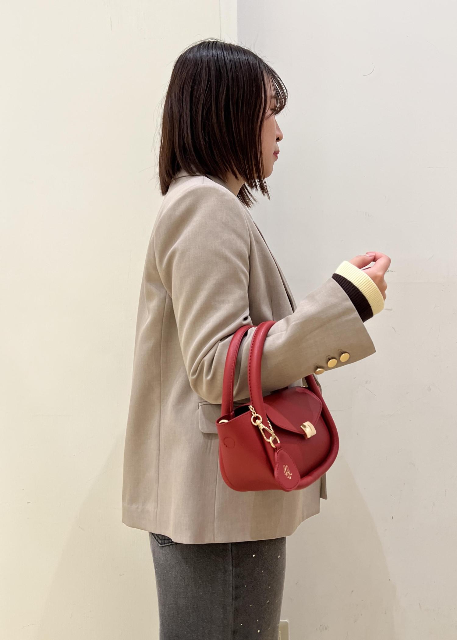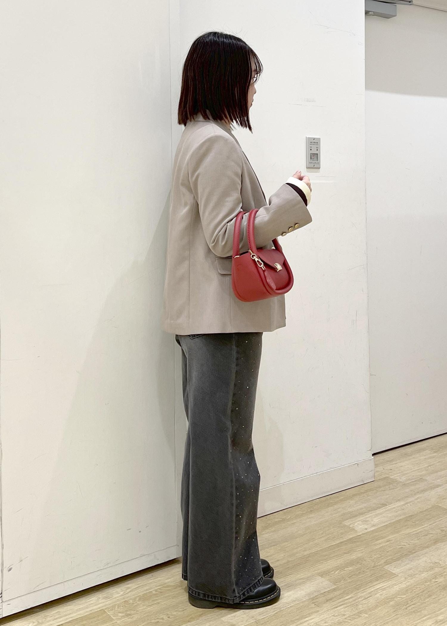全体的にベーシックな色を使ったコーディネートなのでレッドのバッグがワンポイントになるようにしました◎