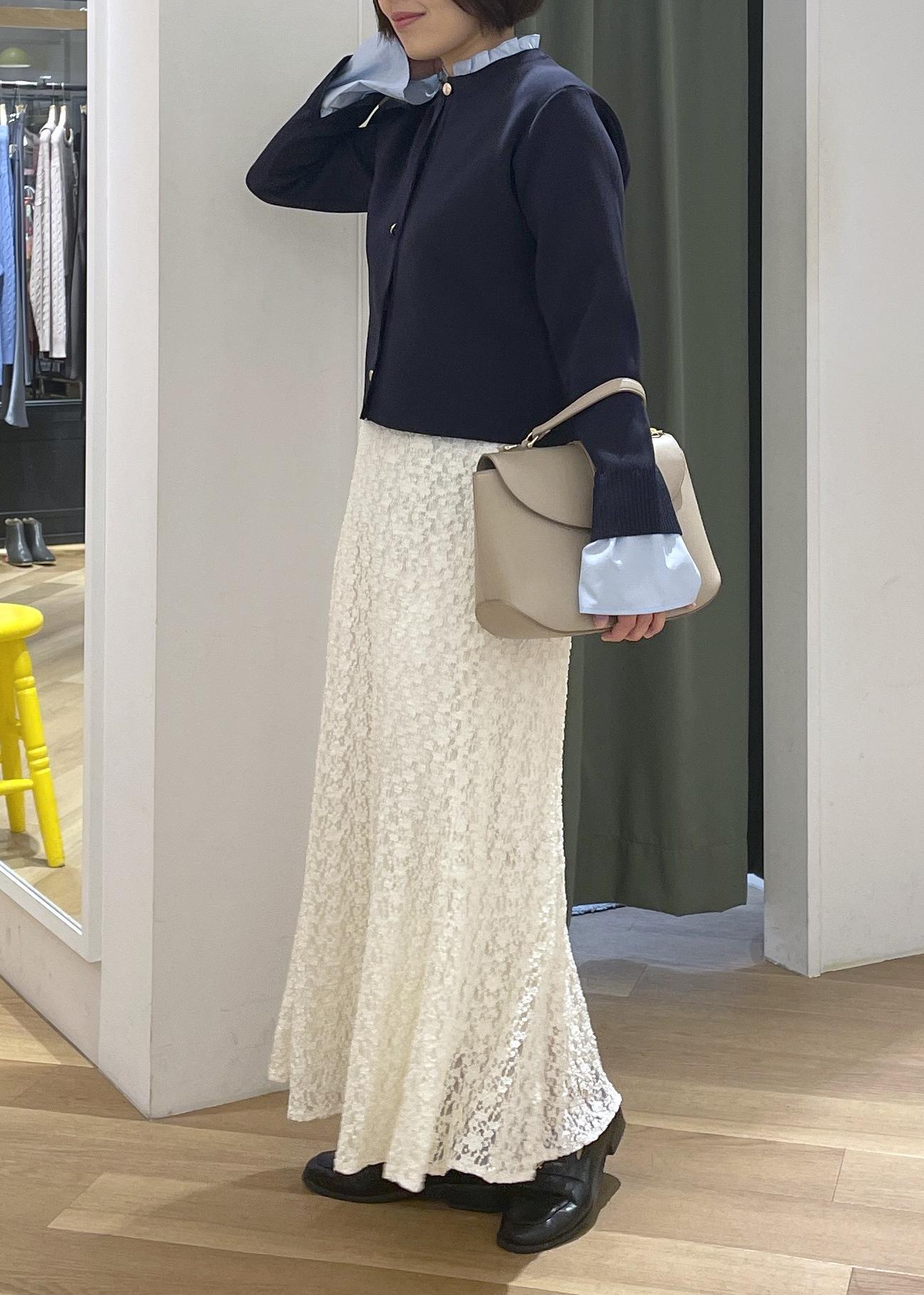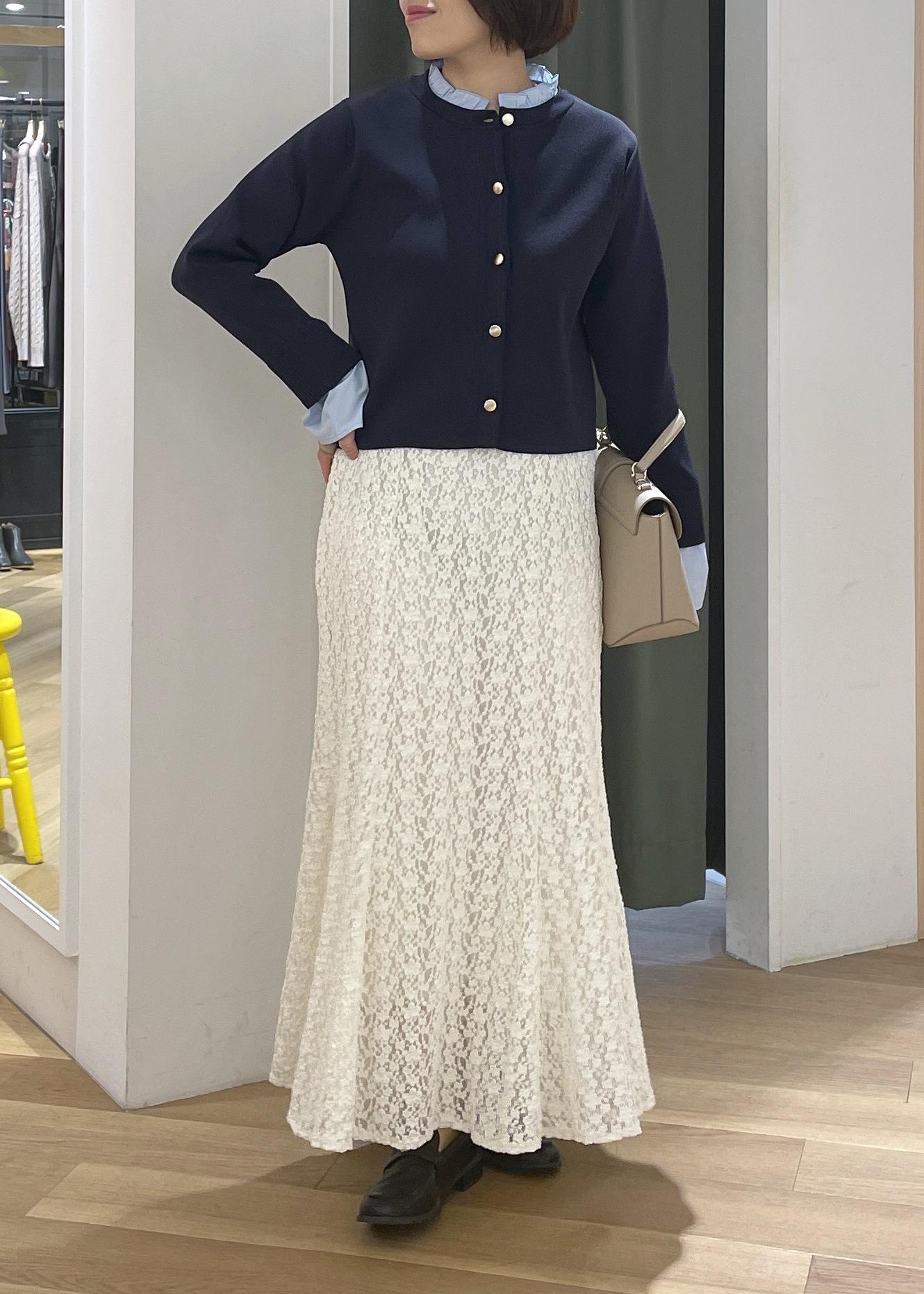レイヤード風で1枚でおしゃれ見えするカーディガンにレーススカートを合わせて、品良く決まる大人カジュアルコーデです!
