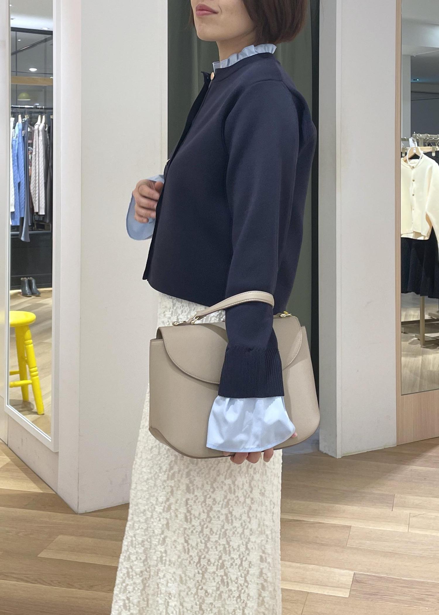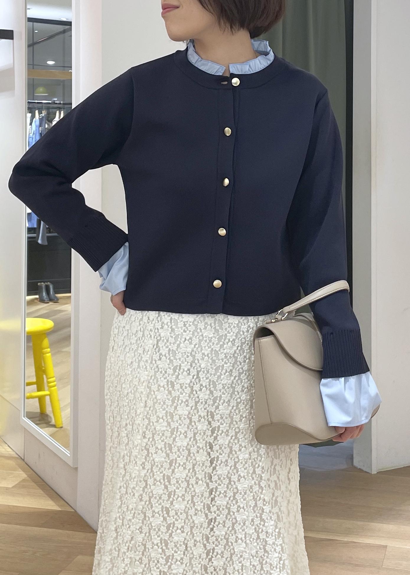 ROPÉ PICNIC襟フリルドッキングカーディガンネイビー / F¥5,995レビュー襟とお袖の布帛パーツがシャツをレイヤードしたようなデザインで、1枚でおしゃれ見えが叶うカーディガンです。布帛部分は取り外しも可能なので、雰囲気を変えて合わせて頂けます。着丈はウエストが隠れるくらいのすっきりした長さで、身頃は程良くゆとりもあります。柔らかな質感で伸縮性もあり着心地の良いニット生地です。