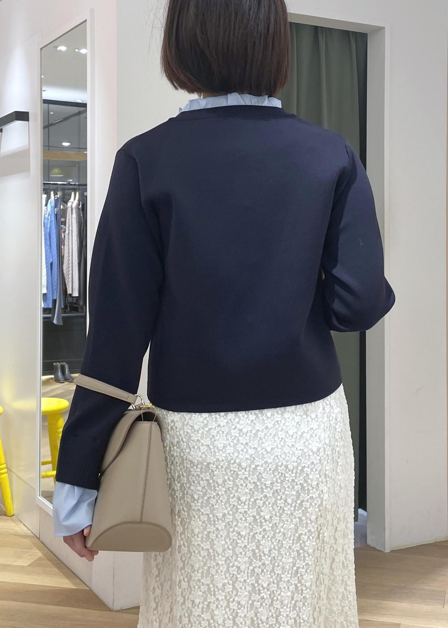 金釦デザインできちんと感があるカーディガンなので、きれい見えするボトムと合わせれば通勤服にもぴったりです◎