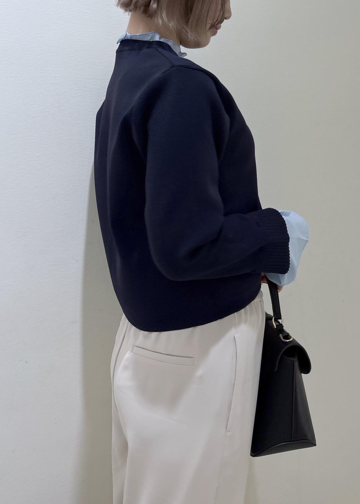 1枚で着映えするレイヤード風のカーディガンです。ブルーがアクセントになったコーディネートです。
