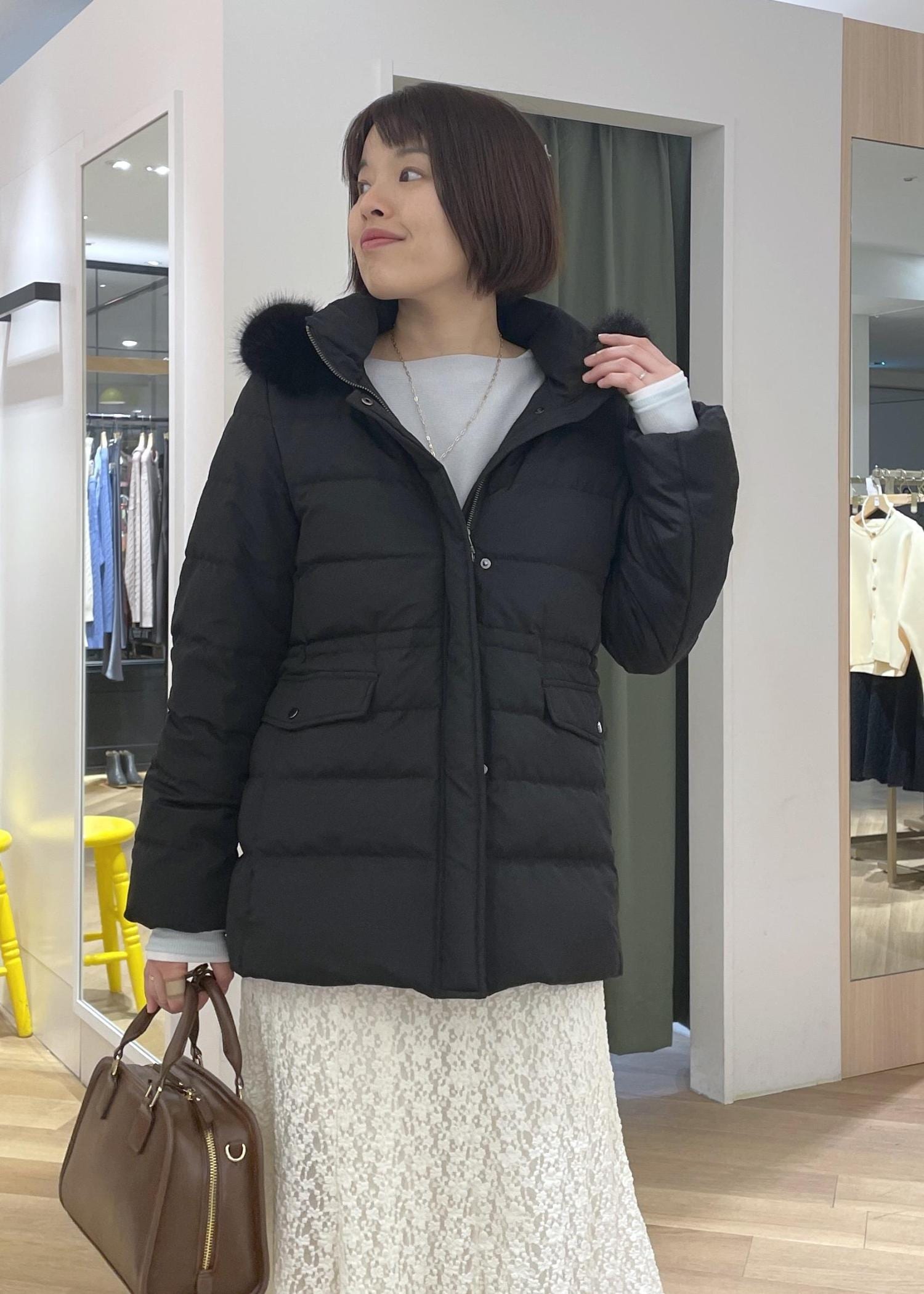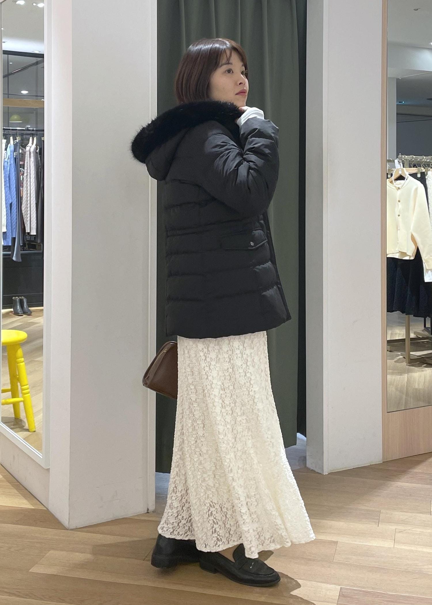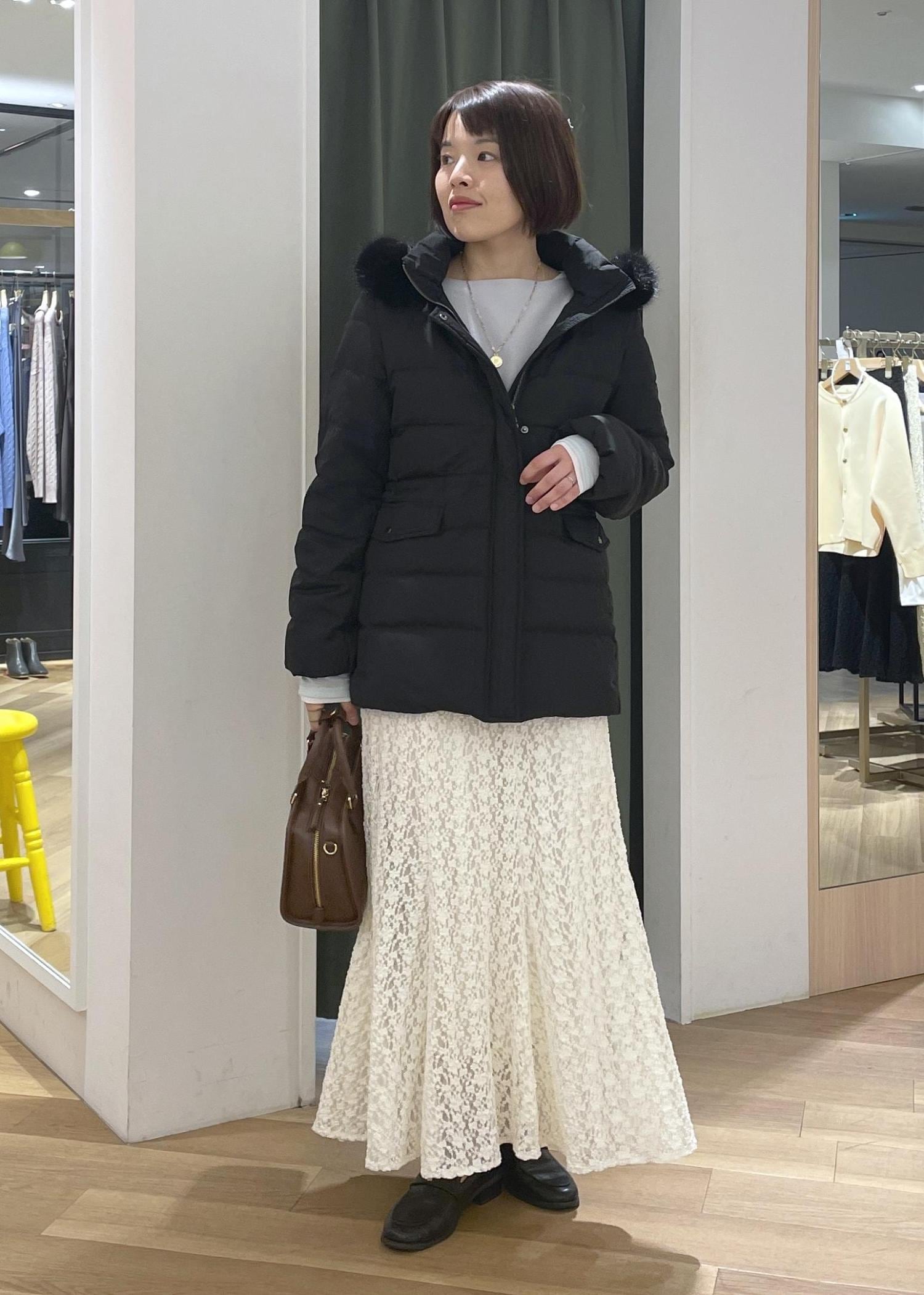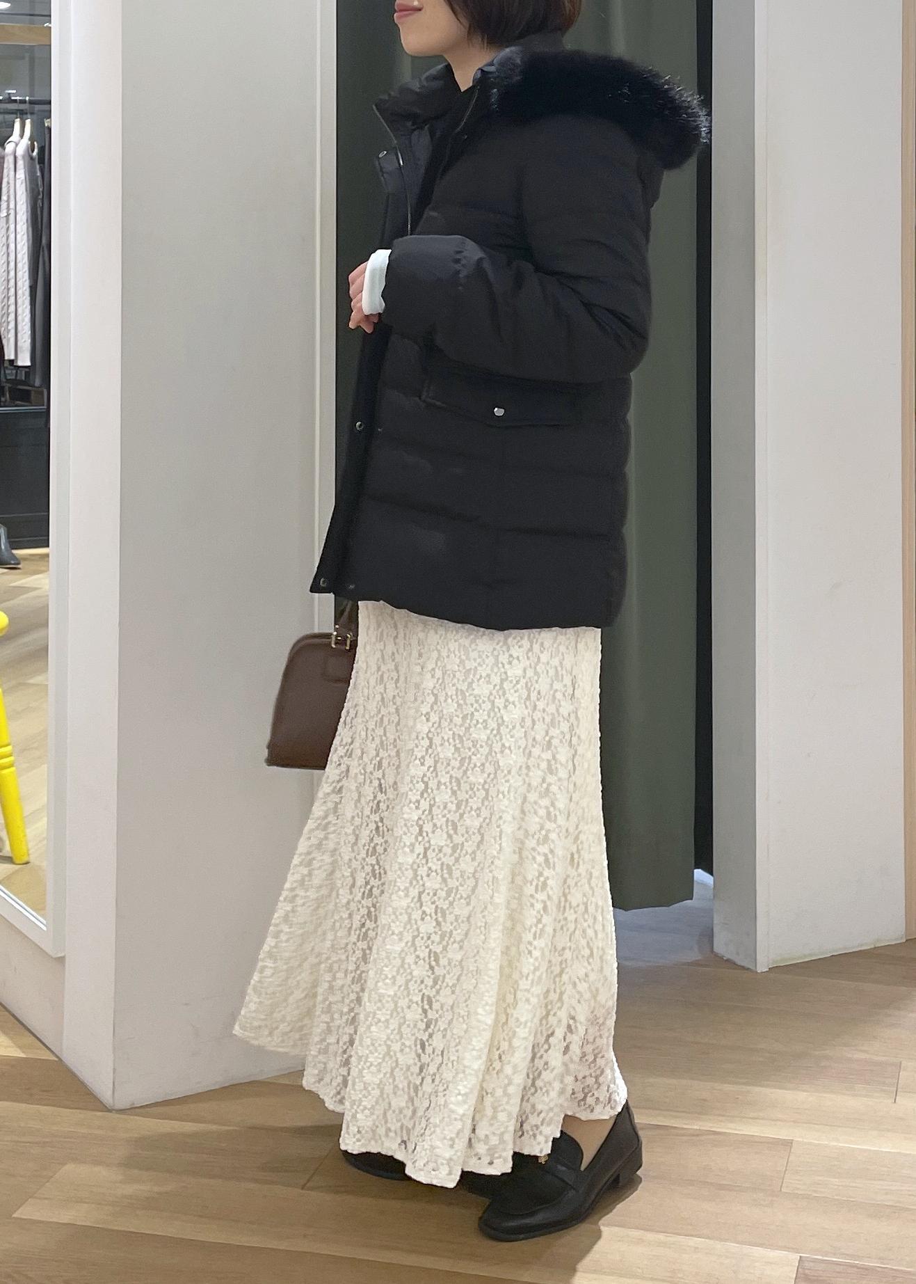 ブラックのミドル丈ダウンにレースのロングスカートを合わせた、上品さのあるきれいめコーデです!