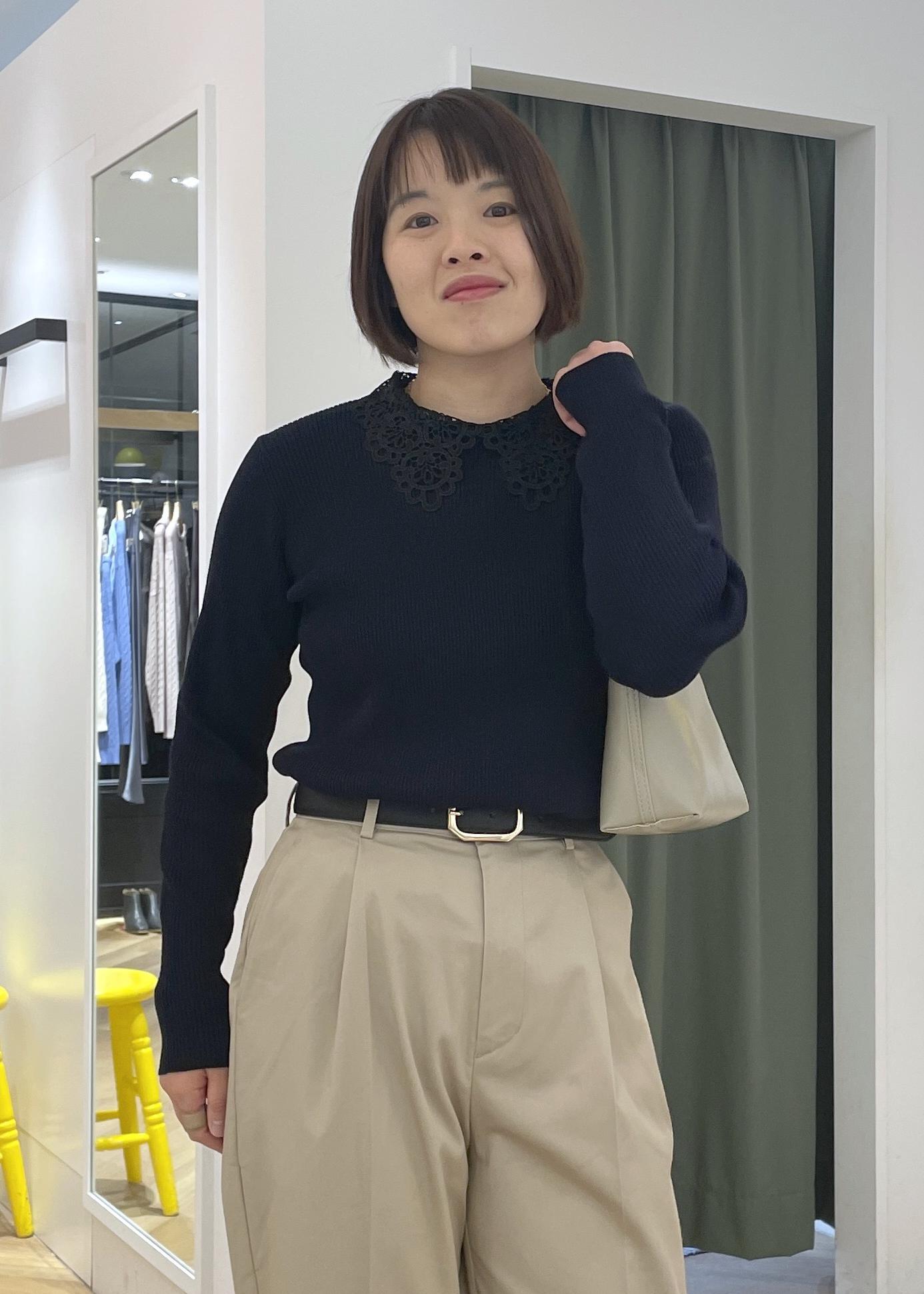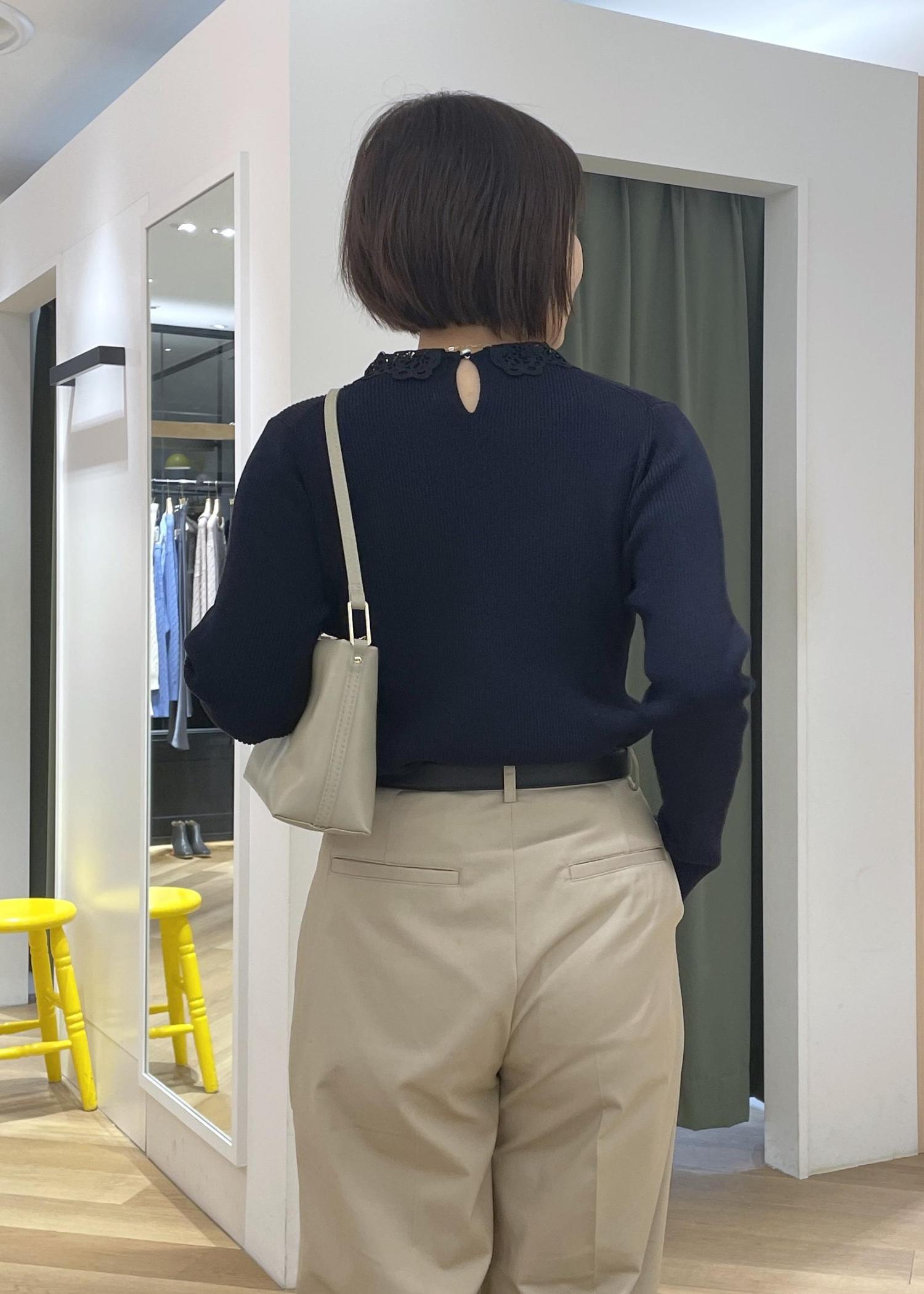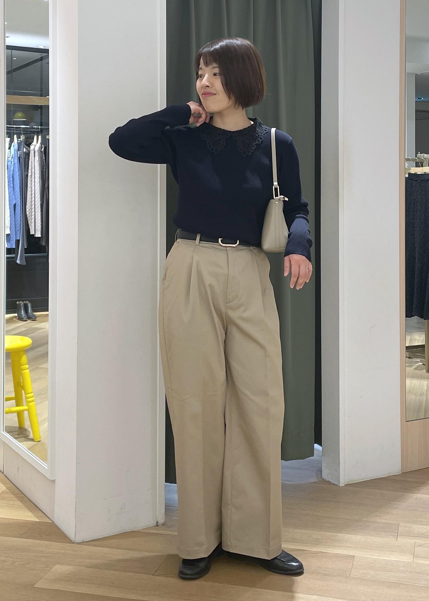 少し甘さのあるレースカラーニットにチノのワイドパンツを合わせた大人カジュアルコーデです!