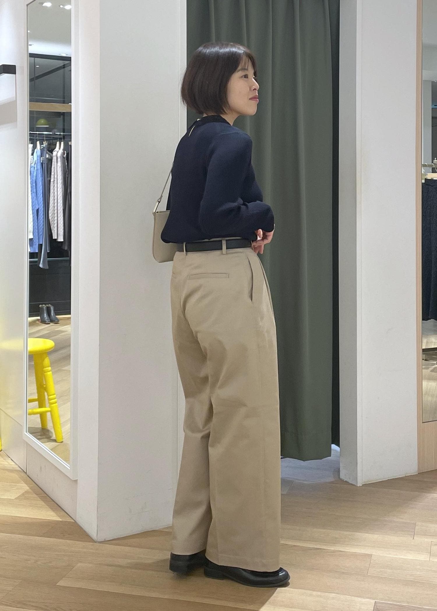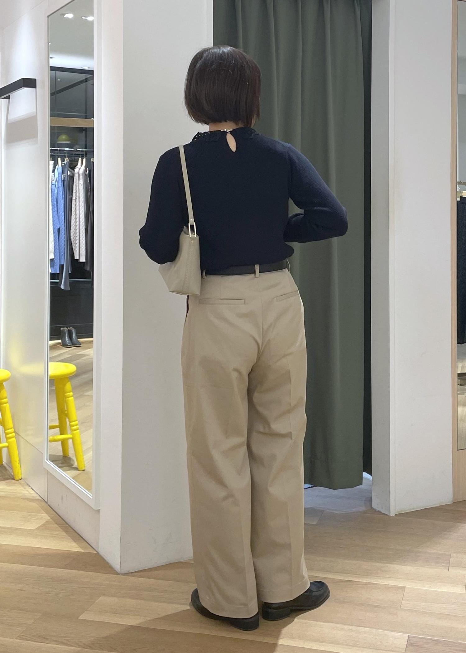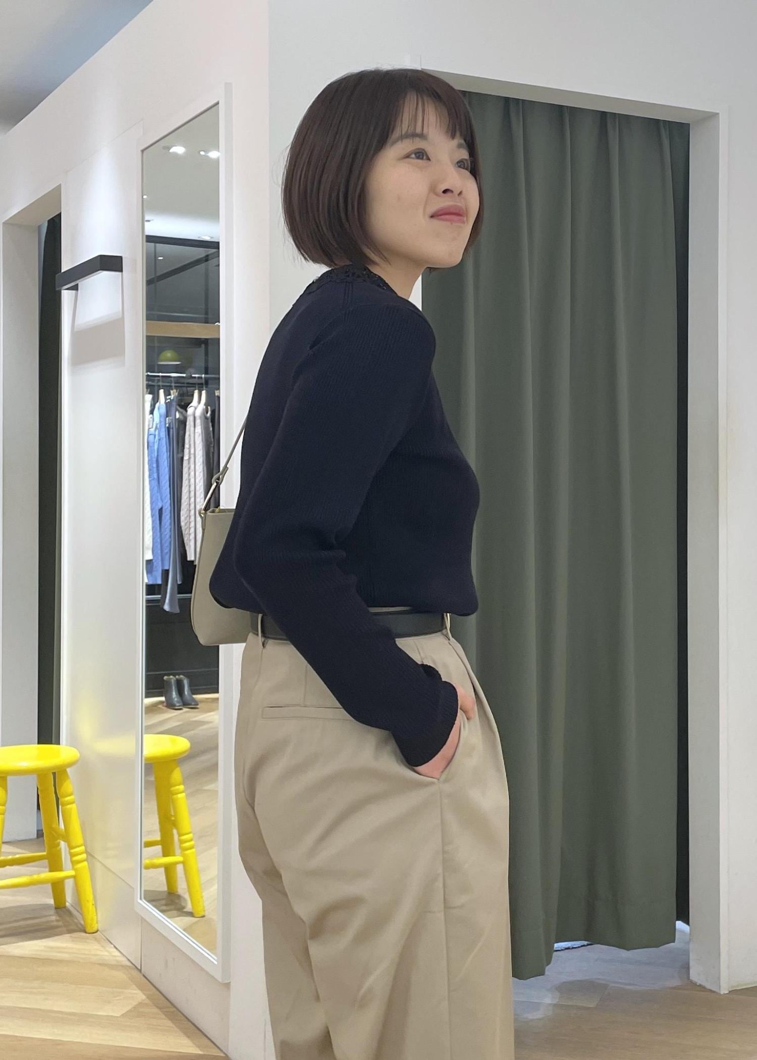少し甘さのあるレースカラーニットにチノのワイドパンツを合わせた大人カジュアルコーデです!