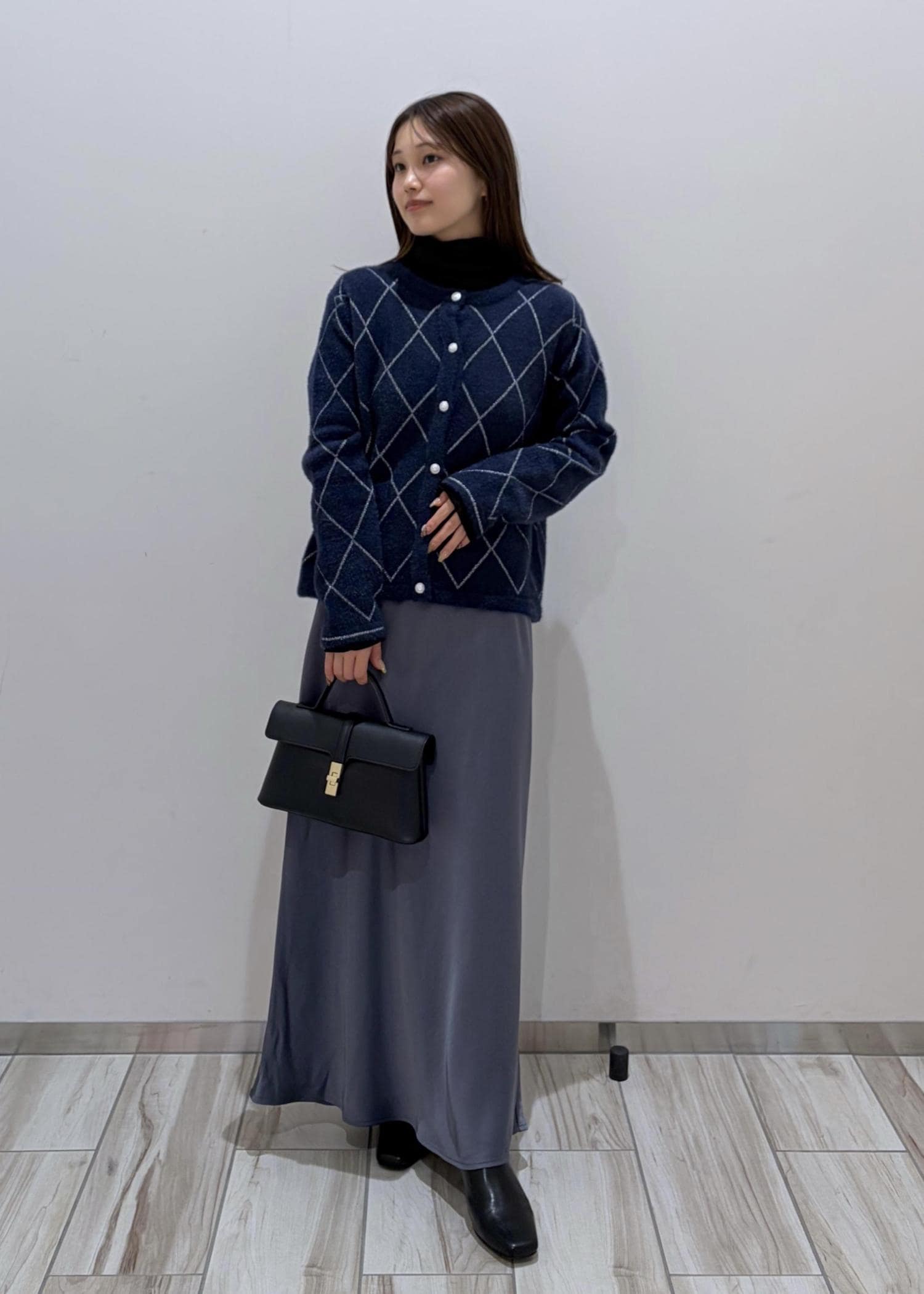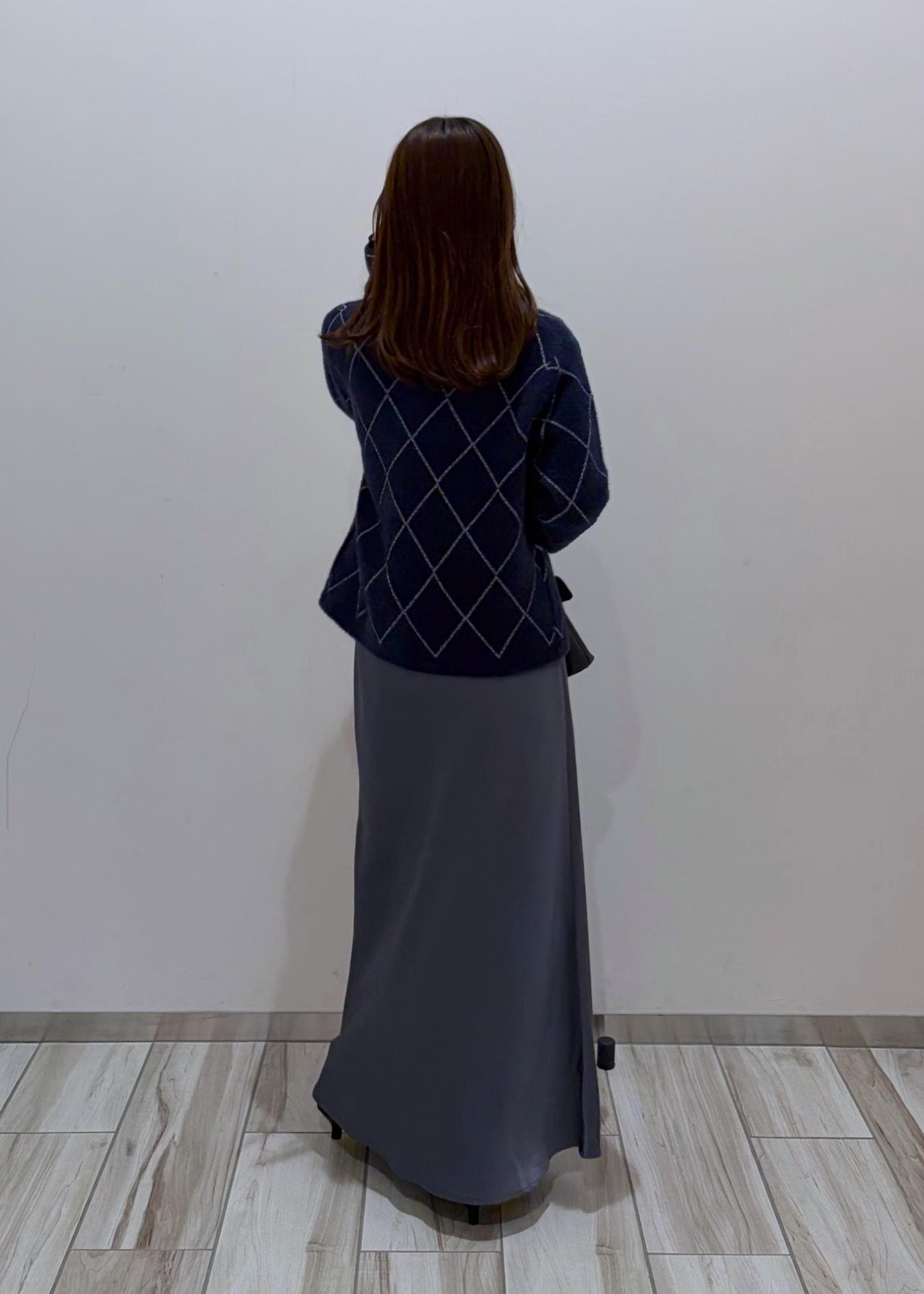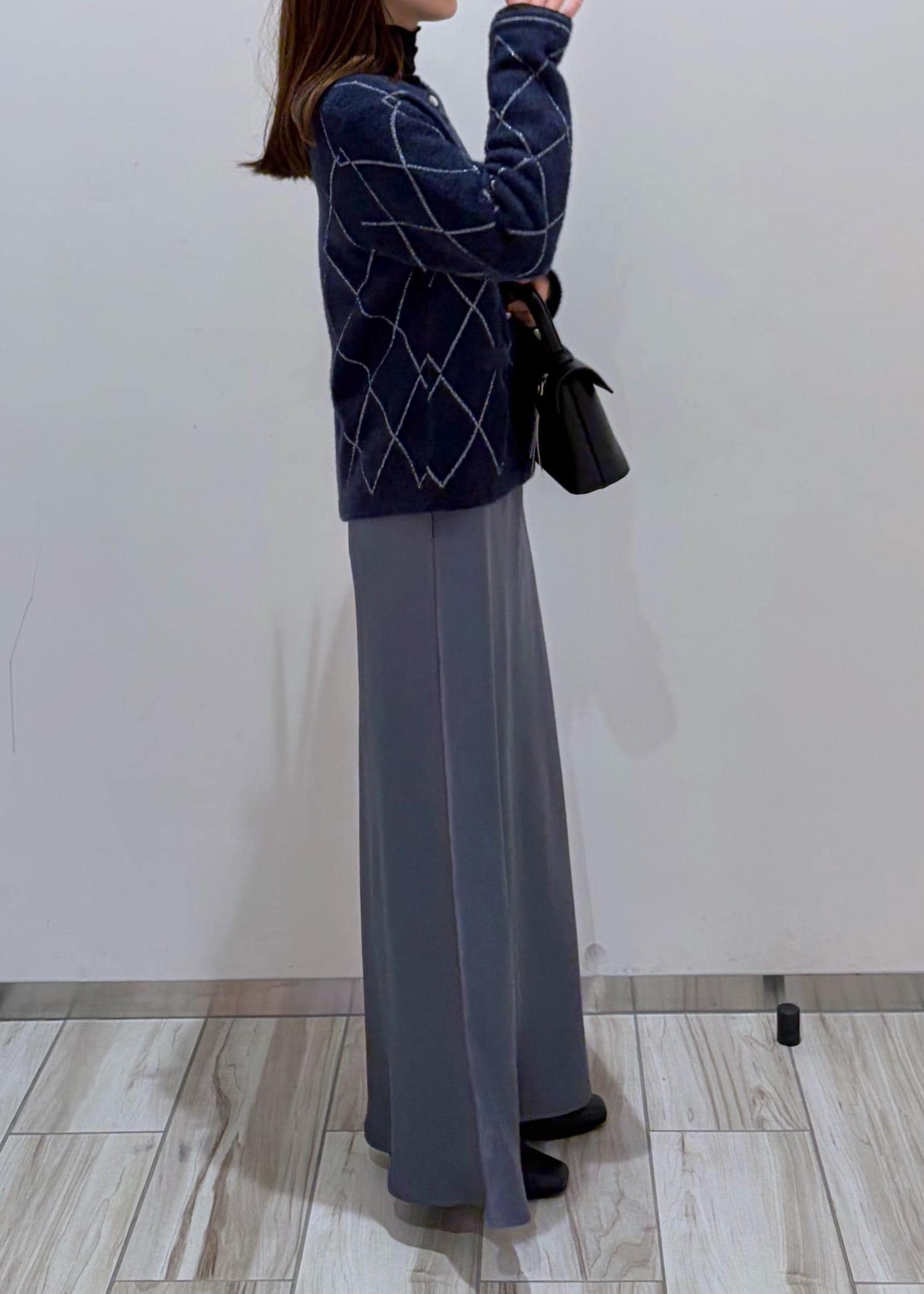 全体的にブルー系で統一し、クールな落ち着いた雰囲気に寄せてみました。カーディガンのさりげないラメと光沢のあるスカートが上品魅せも叶います◎