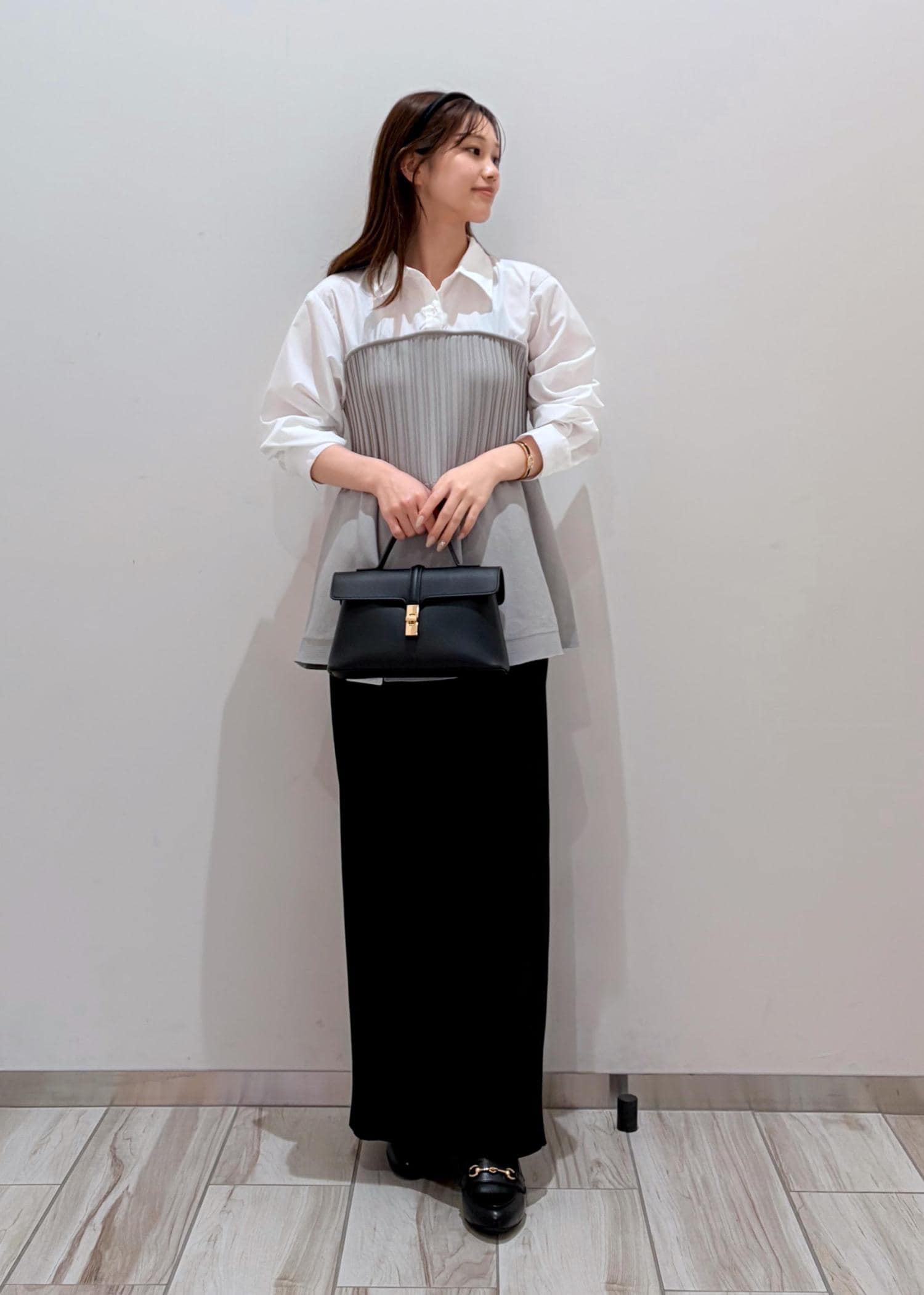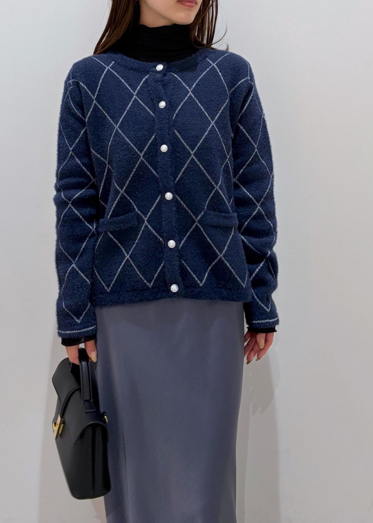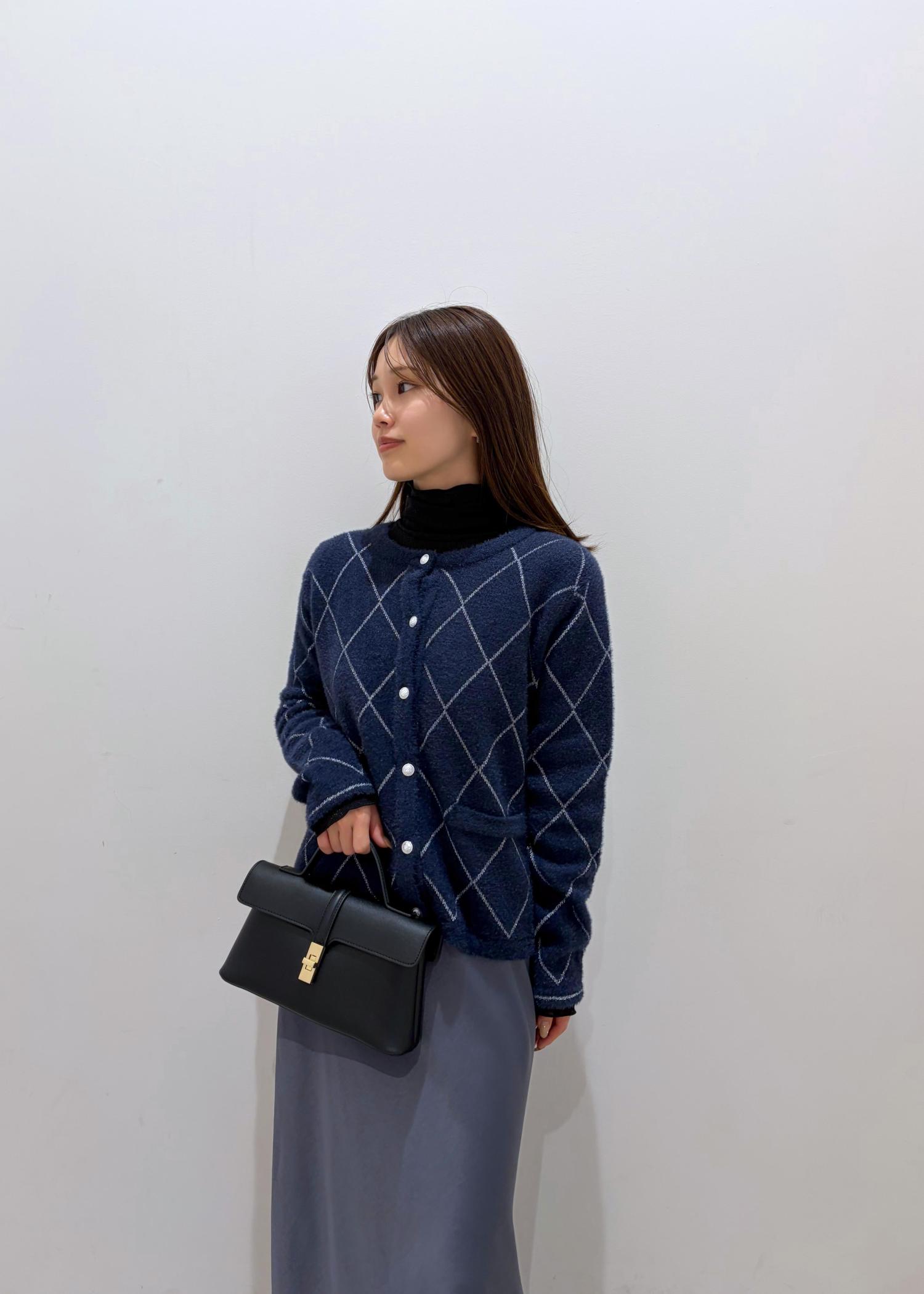 全体的にブルー系で統一し、クールな落ち着いた雰囲気に寄せてみました。カーディガンのさりげないラメと光沢のあるスカートが上品魅せも叶います◎
