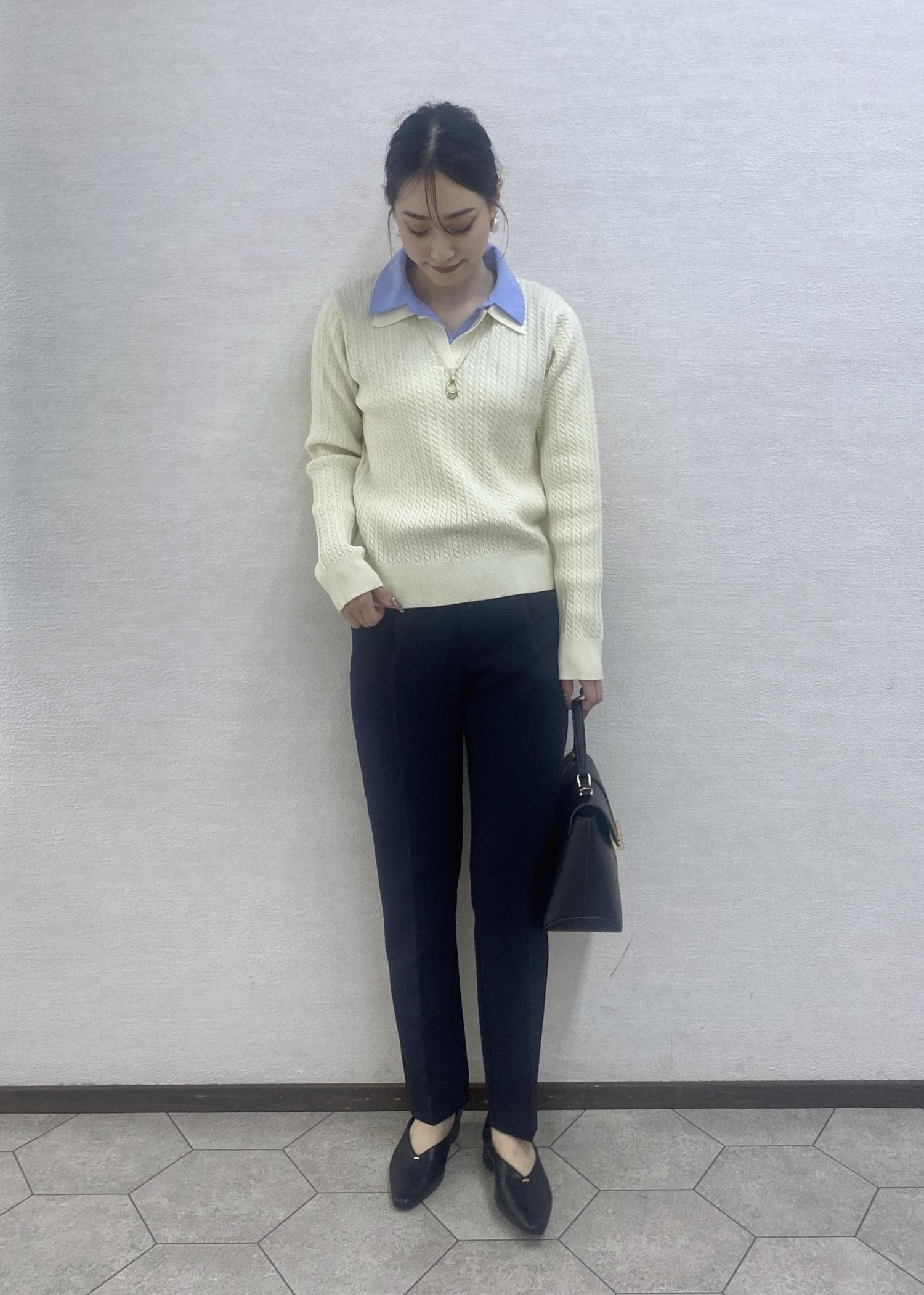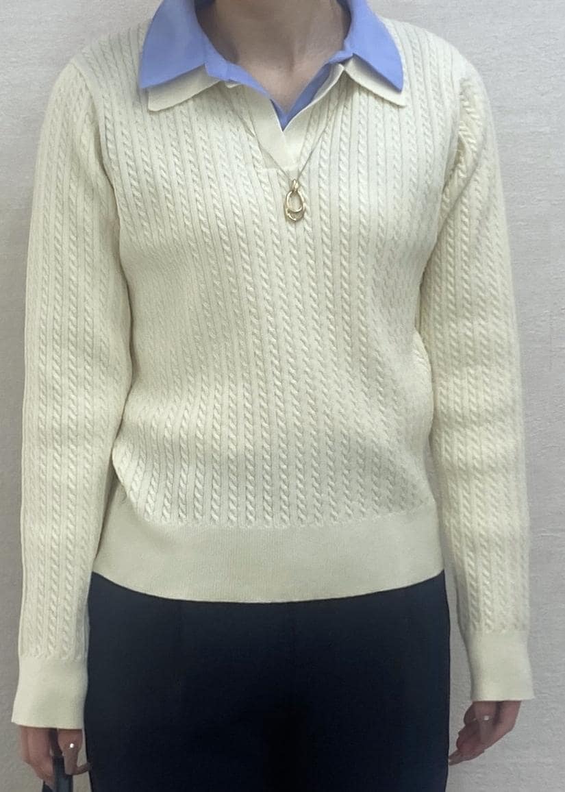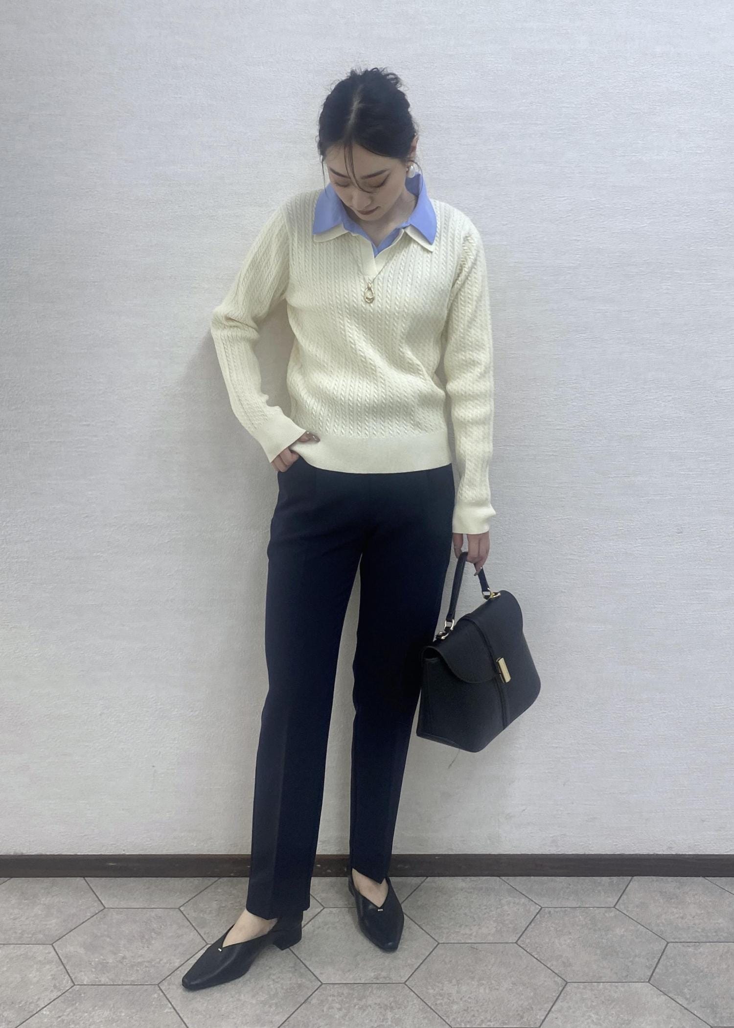 ダブルカラーがお洒落感のあるケーブルニットにキレイめなパンツを合わせたオフィスカジュアルなコーディネートです。