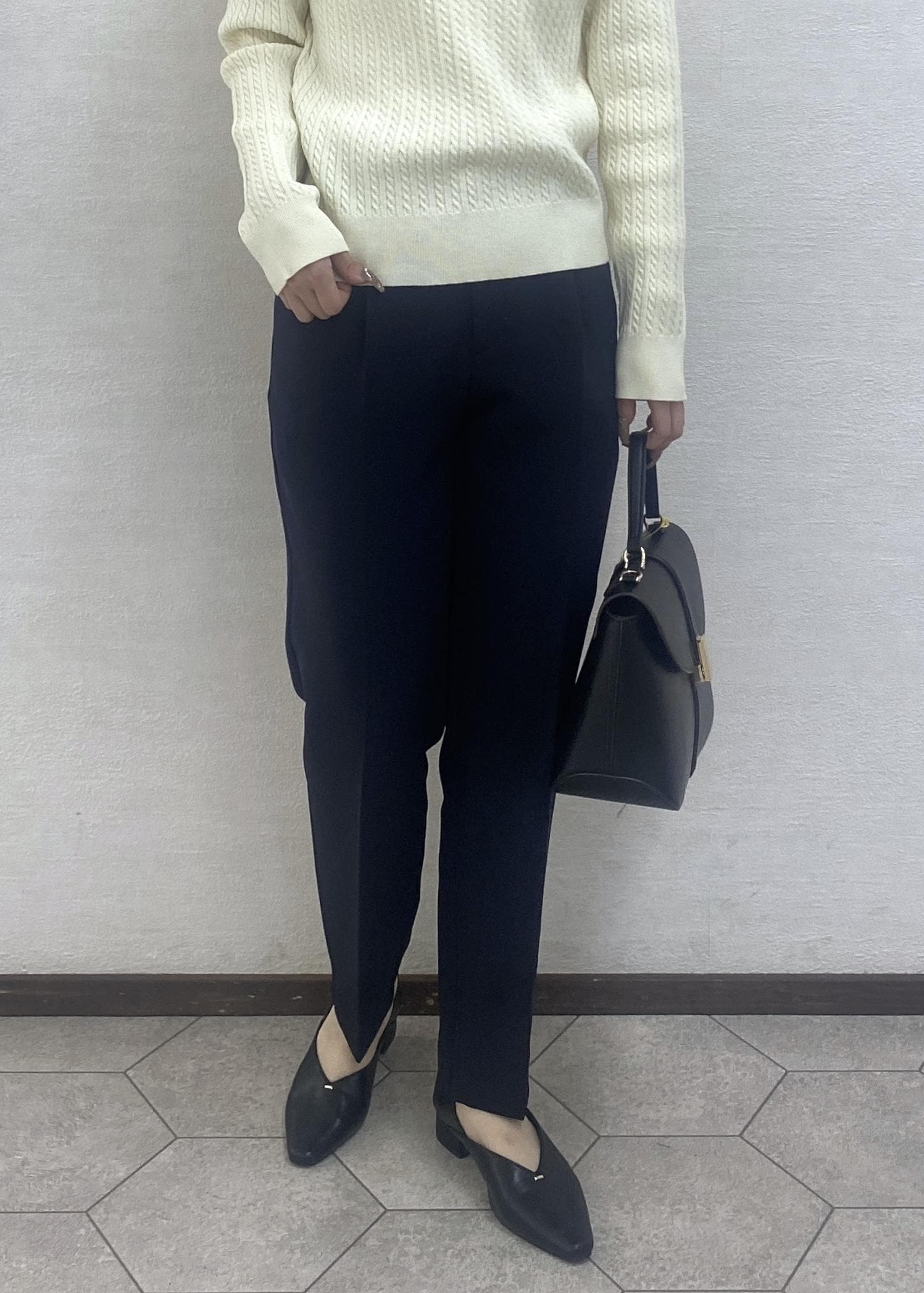 ダブルカラーケーブルニットのきれいめコーデ