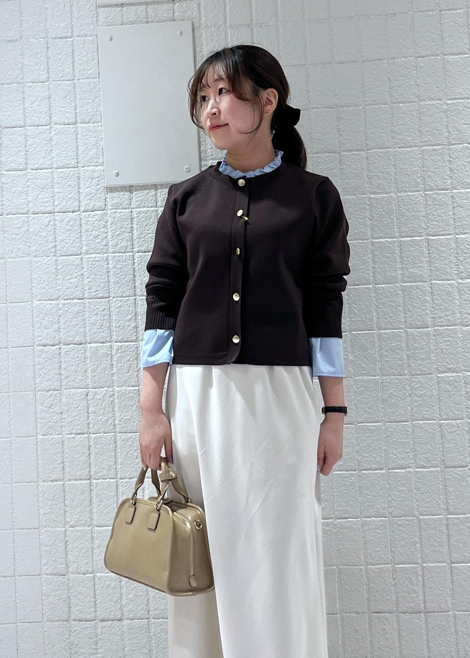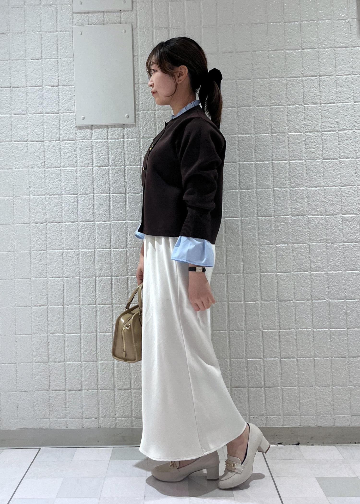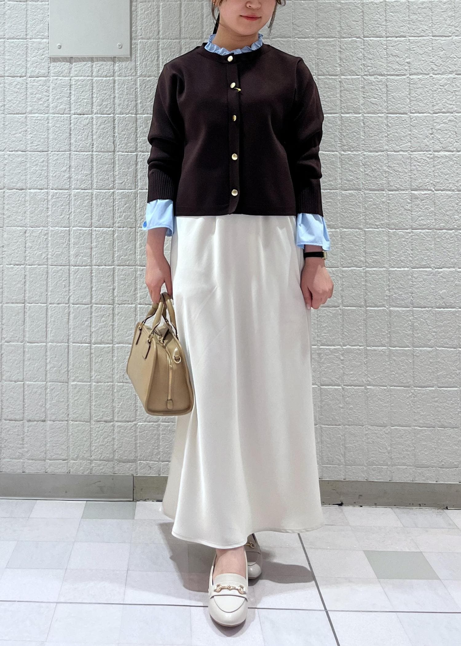 ダークブラウンのシャツレイヤードカーディガンは一枚で華やかに見え、ホワイトのロングスカートでシンプルに