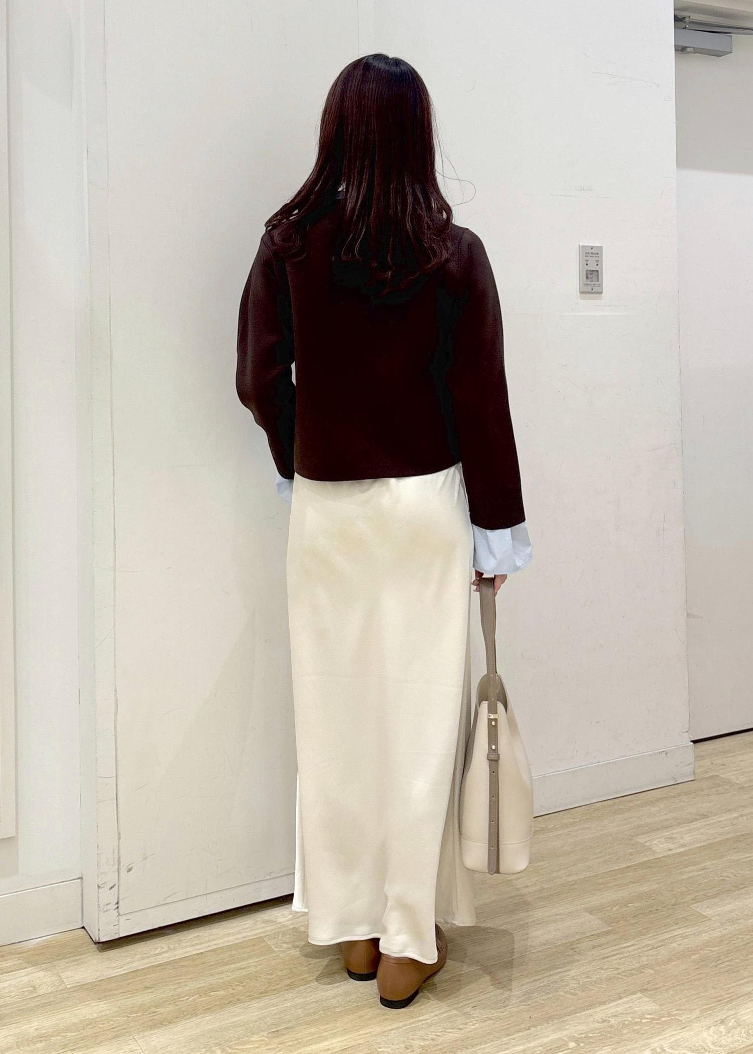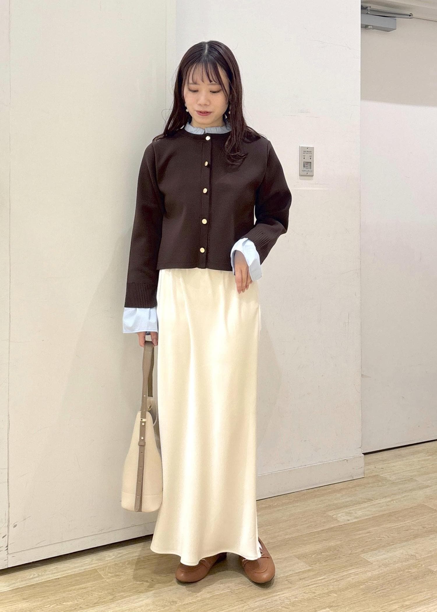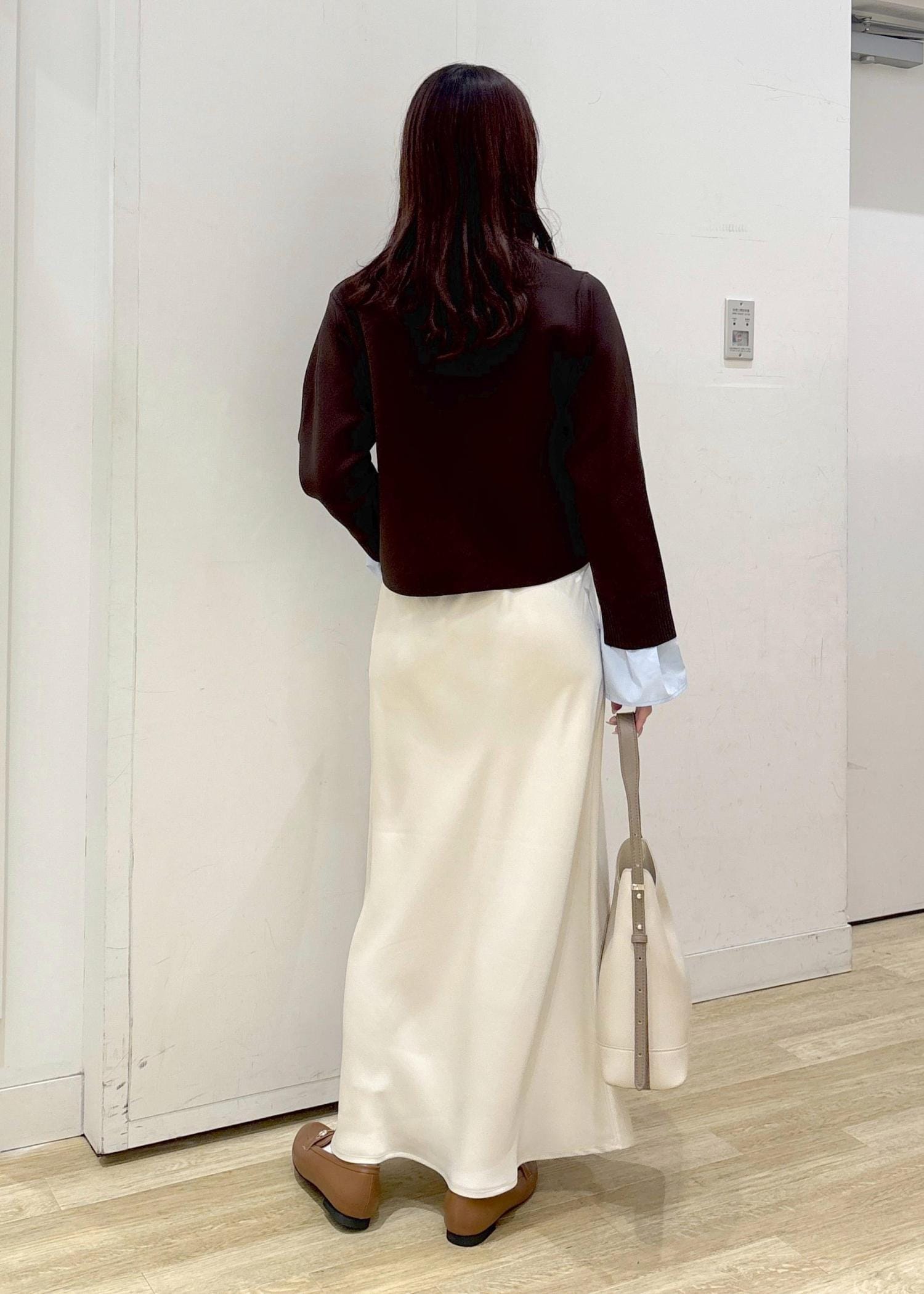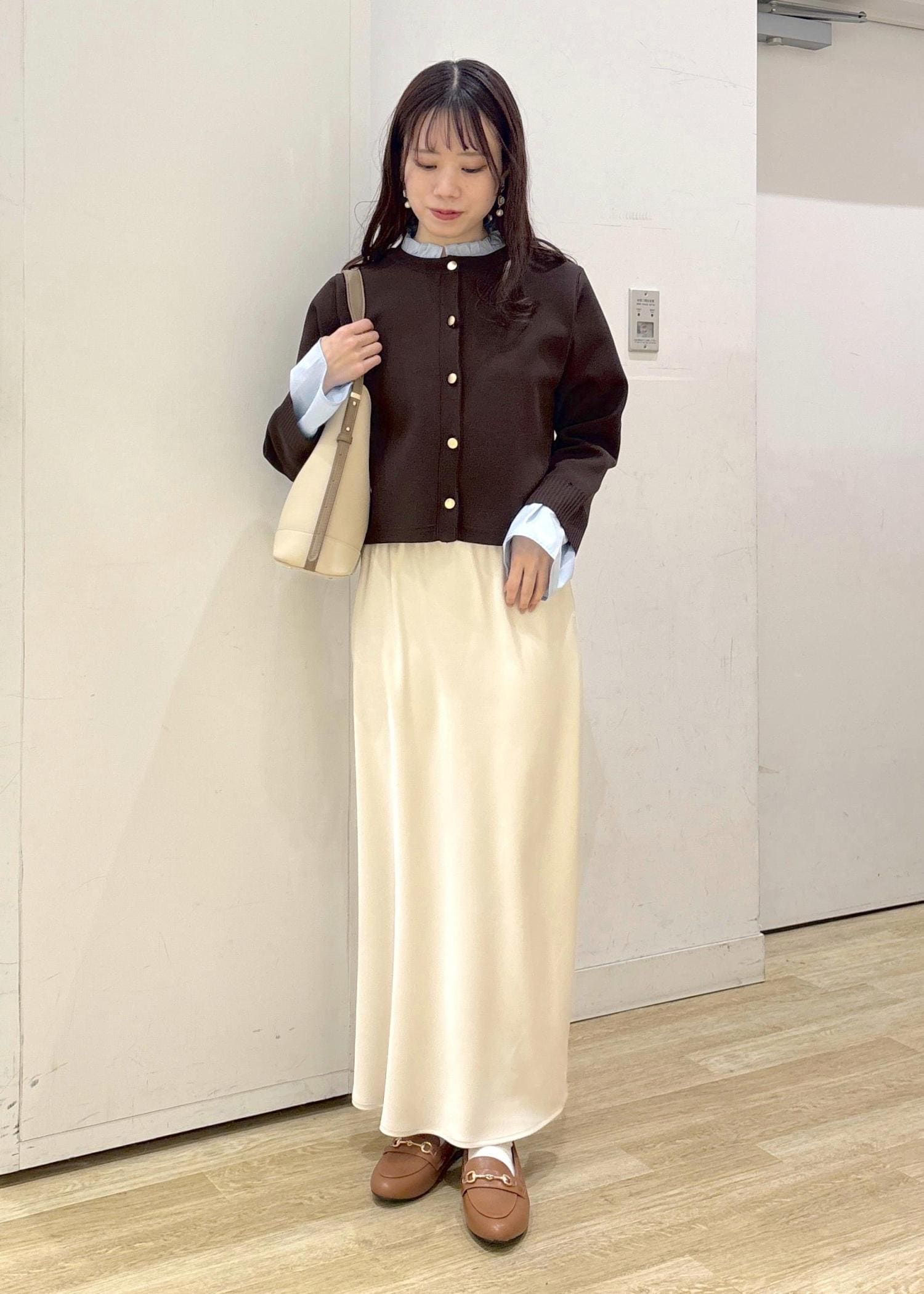 ブラウンのカーディガンと光沢感のある白のスカートを合わせて大人カジュアルなコーディネートに仕上げました◎