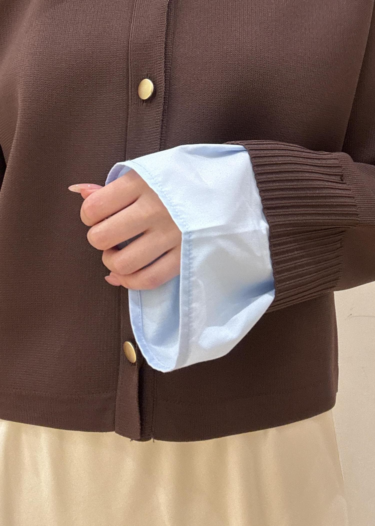 カーディガンの袖と襟のブルーがワンポイントで可愛いです。