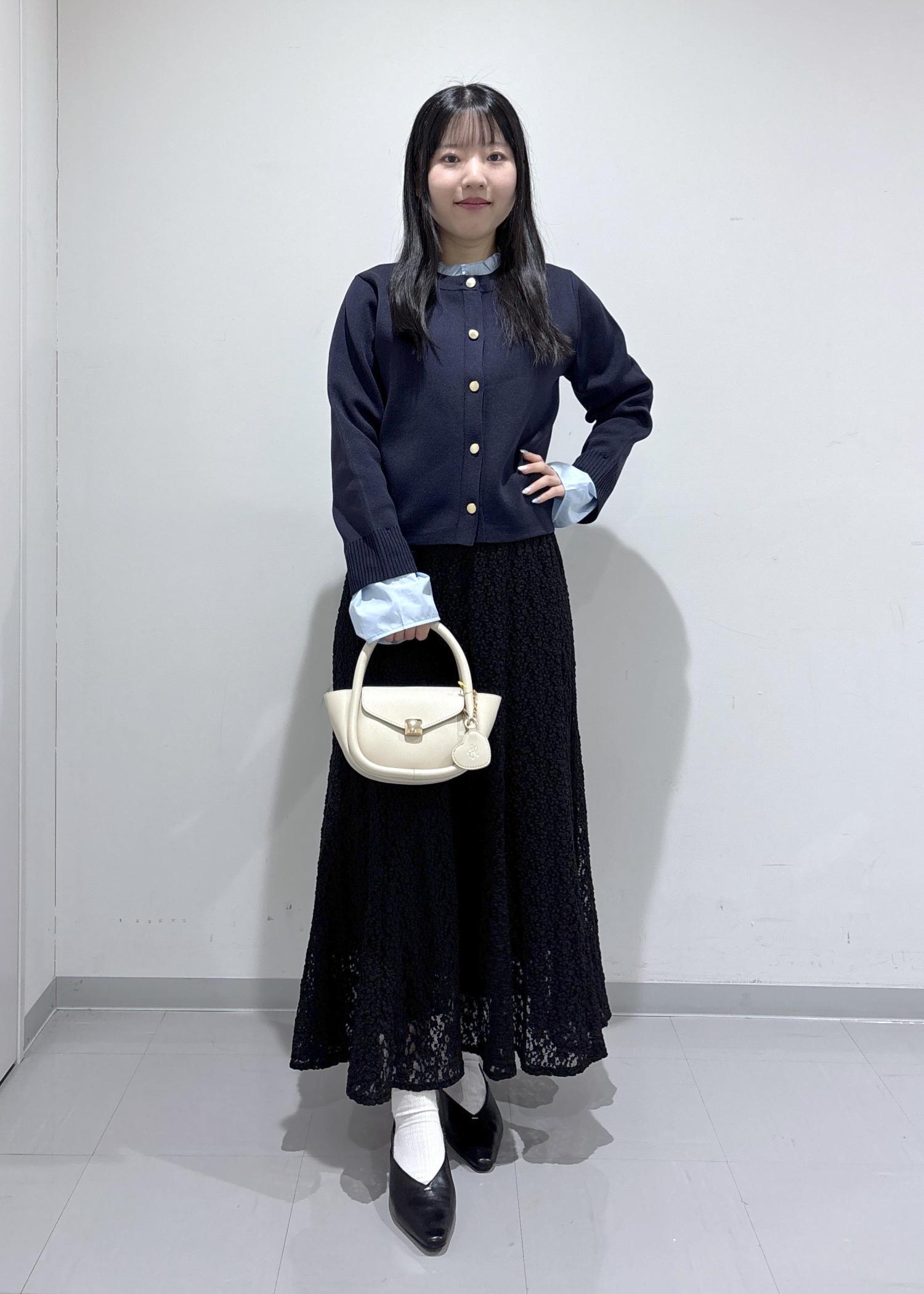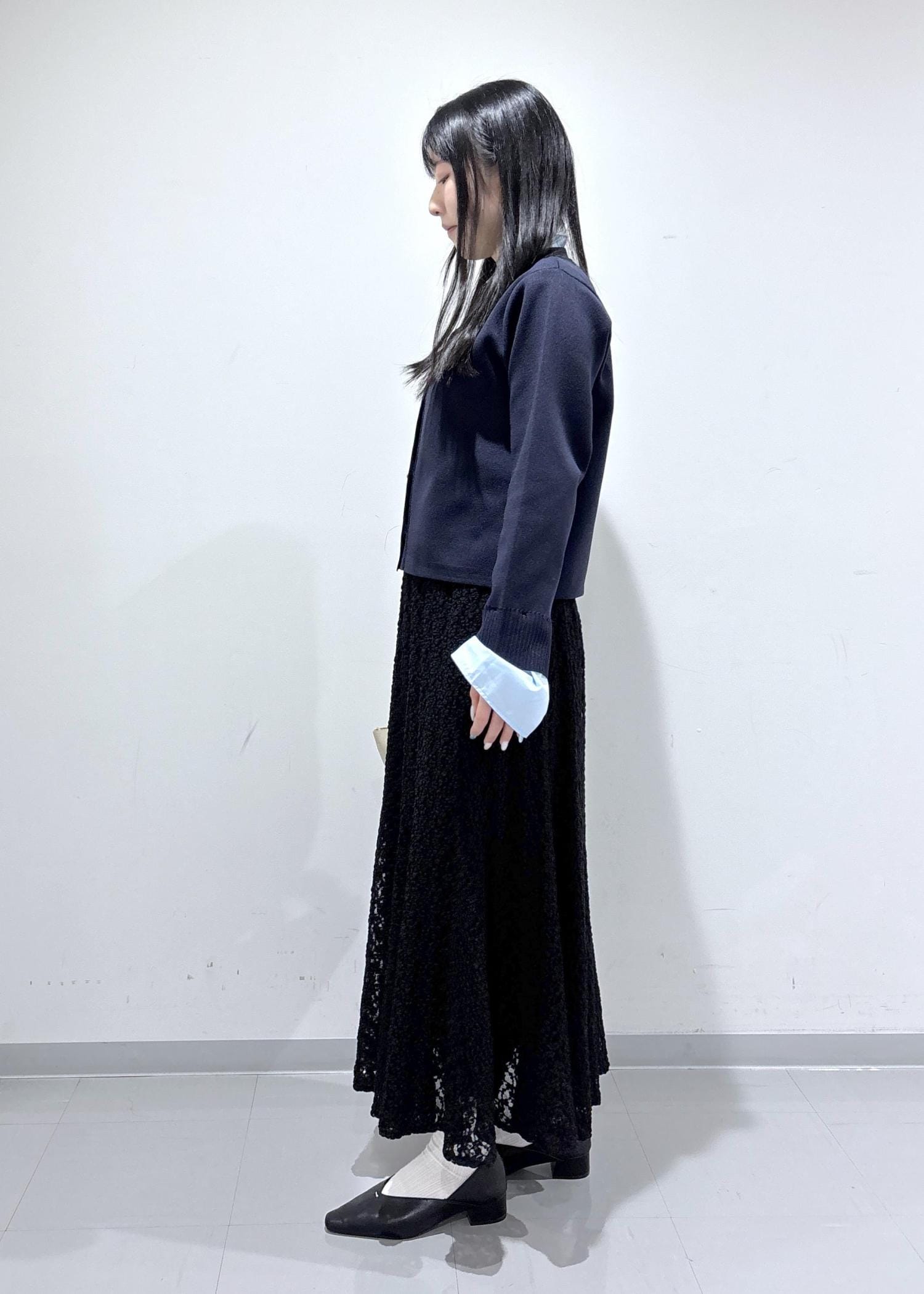 ネイビーのカーディガンとブラックのスカートを合わせた大人キレイめコーデです!