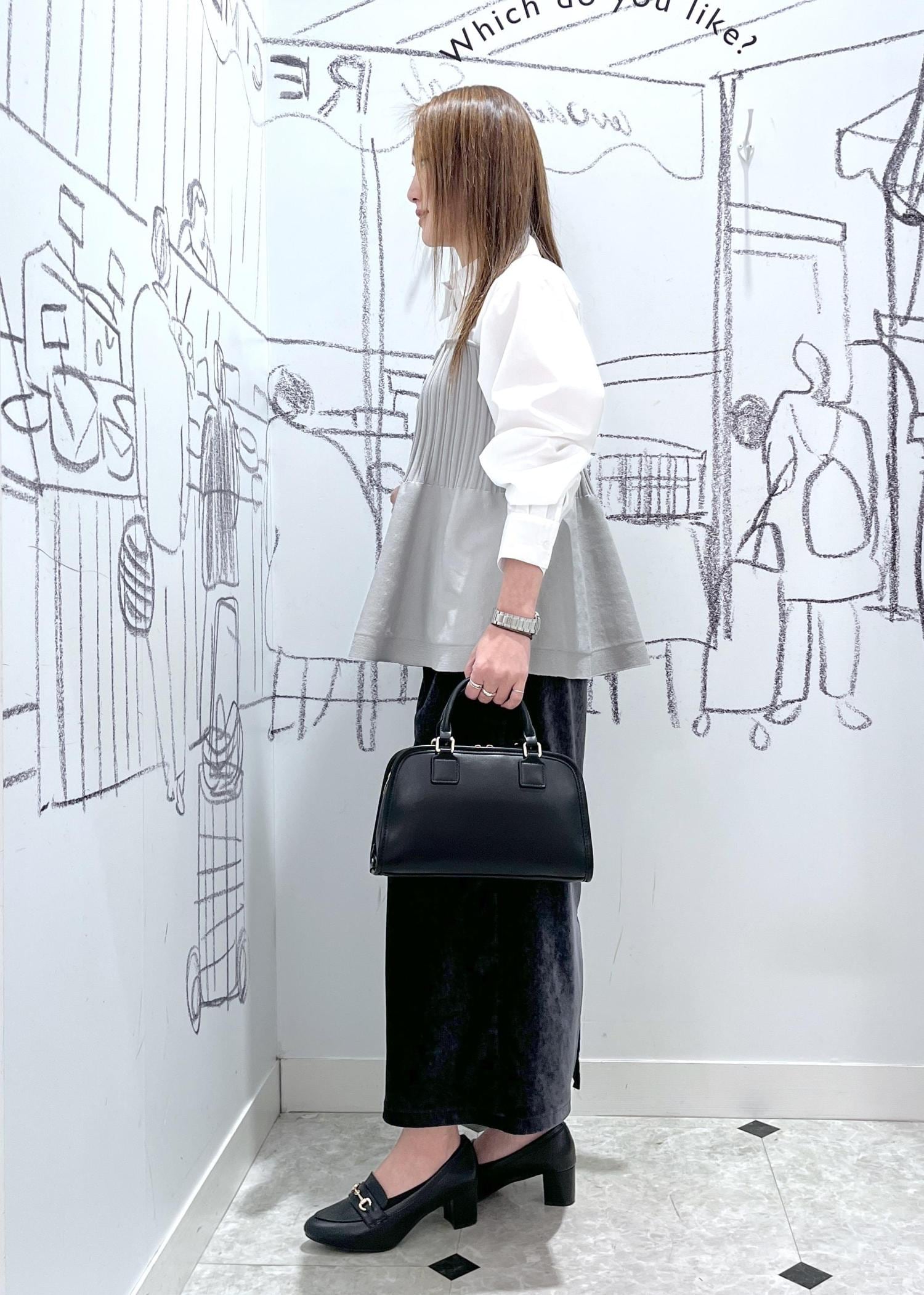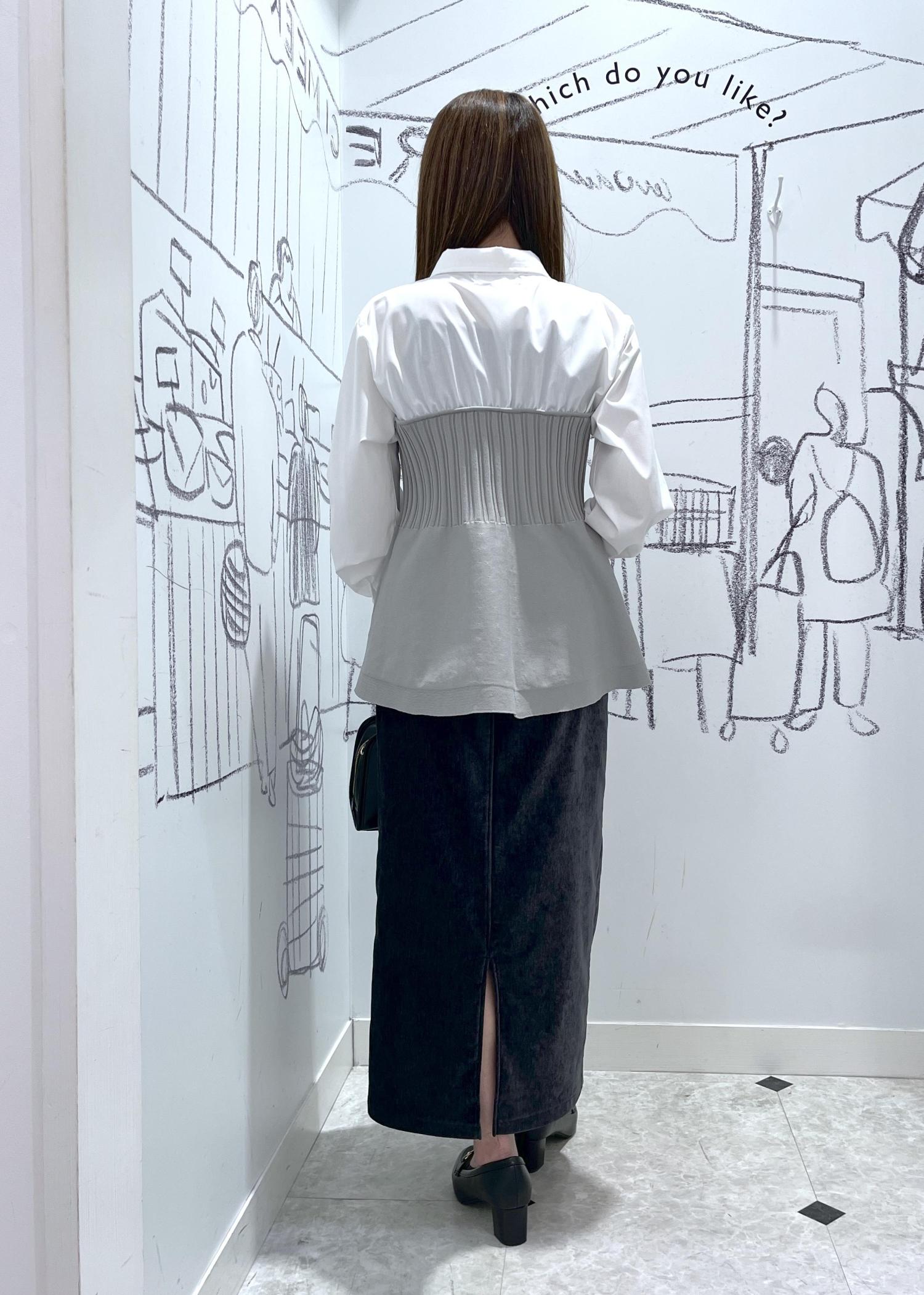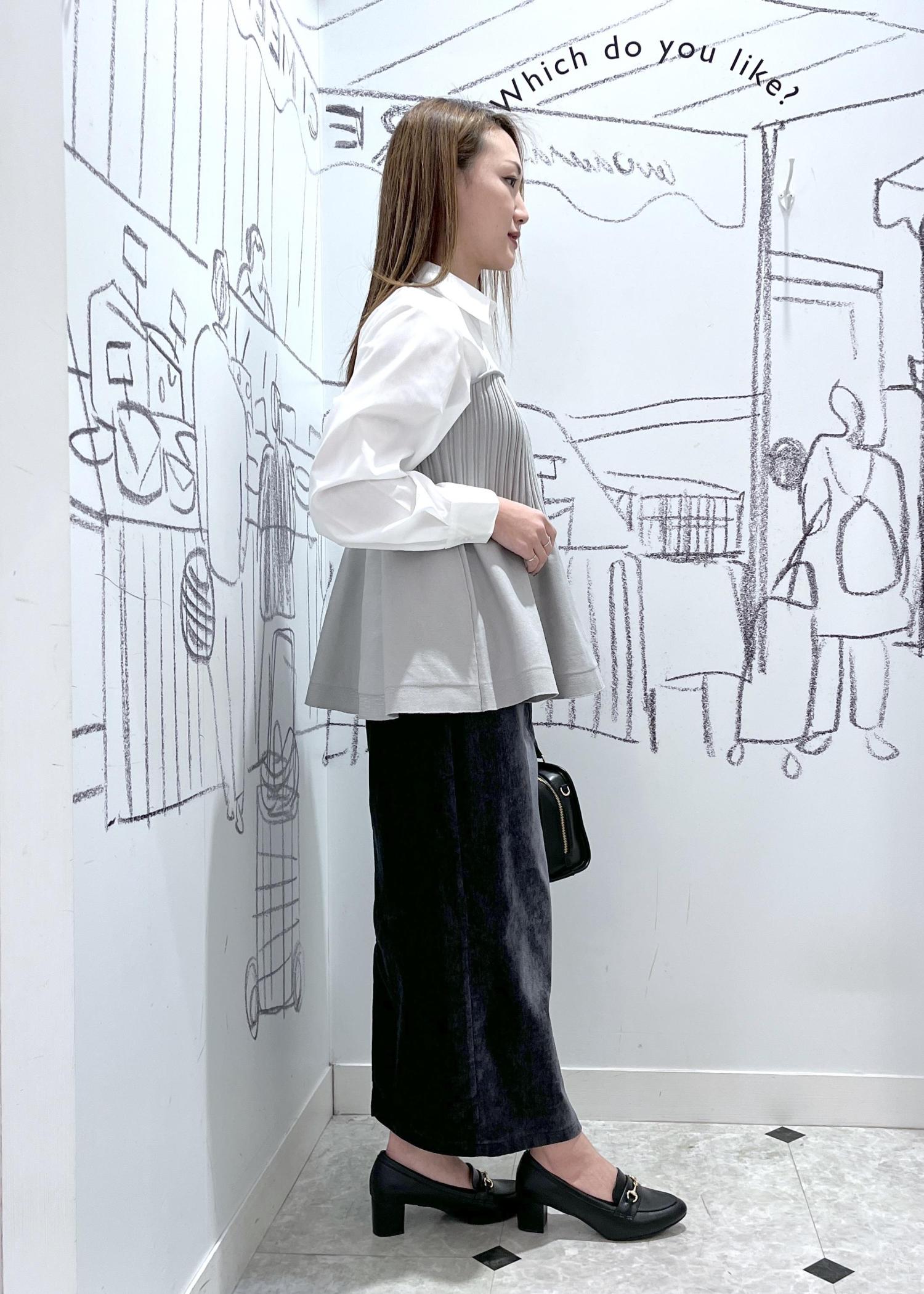 一枚でレイヤードが完成する素敵なトップス。ペプラムデザインですっきりと体型カバーも出来るのが嬉しい。Iラインスカートと合わせるとよりすっきり見えます。