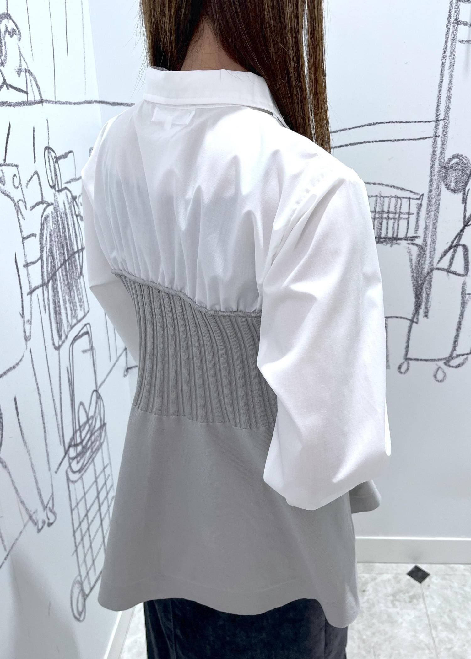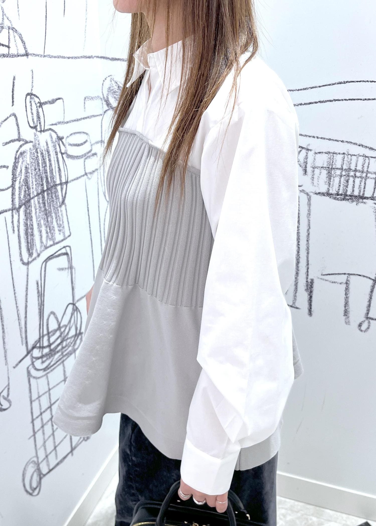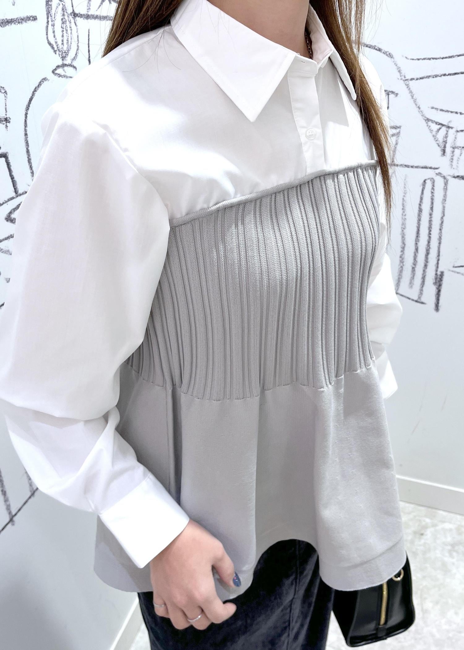 ROPÉ PICNICシャツドッキングペプラムニットライトグレー / F¥5,995レビューニット部分は、しっかりと張りのあるニットです。身幅は、適度なゆとりがあります。シャツ部分は少し透けるので、インナーがあると安心です。ペプラムで体型カバー出来るのですっきり見えます。