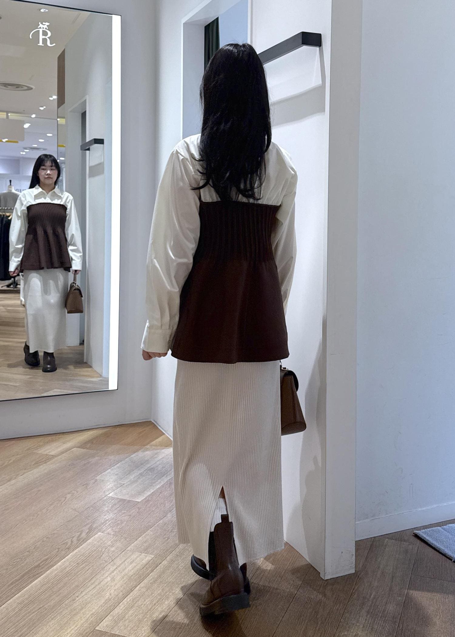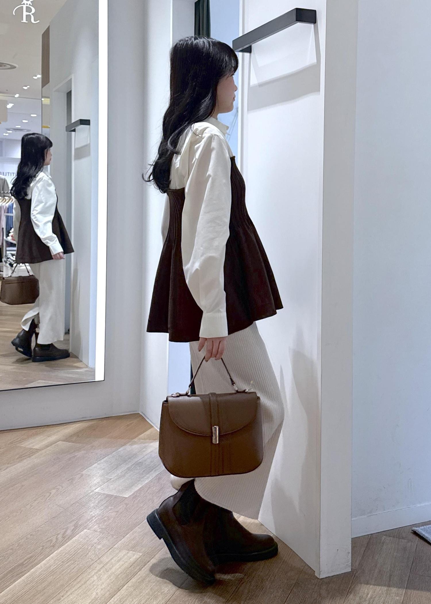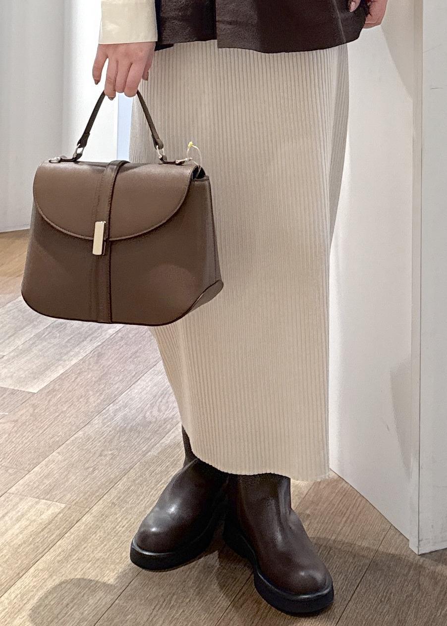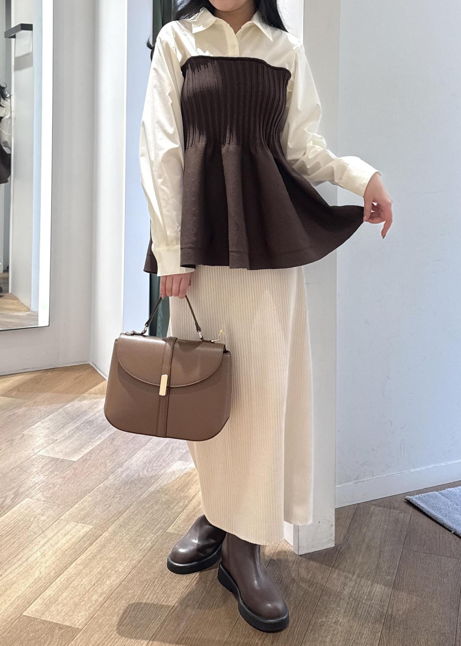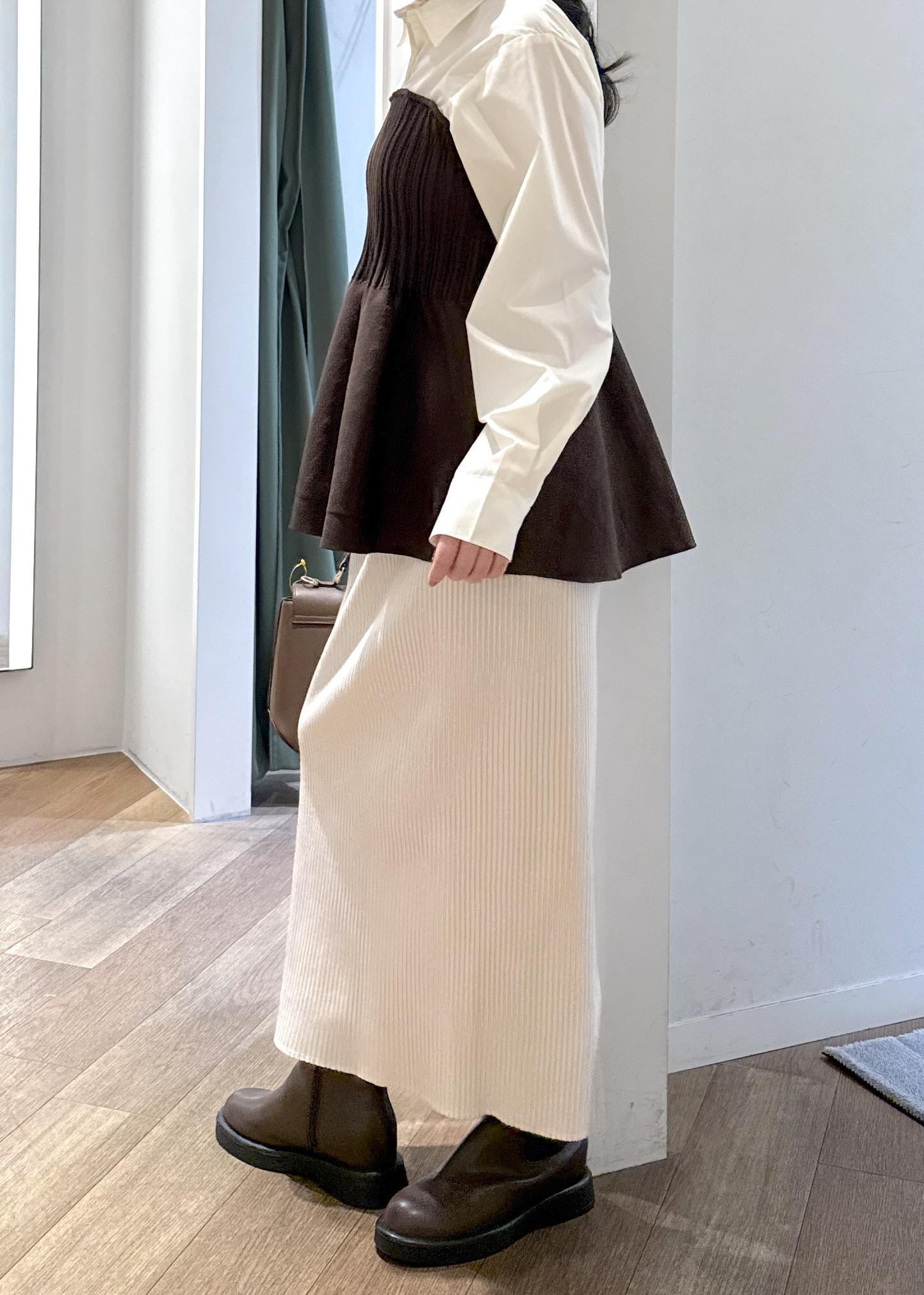トップスの裾が広がったシルエットなので、スカートはアイラインのものを合わせ、スッキリ見えるようにしました。