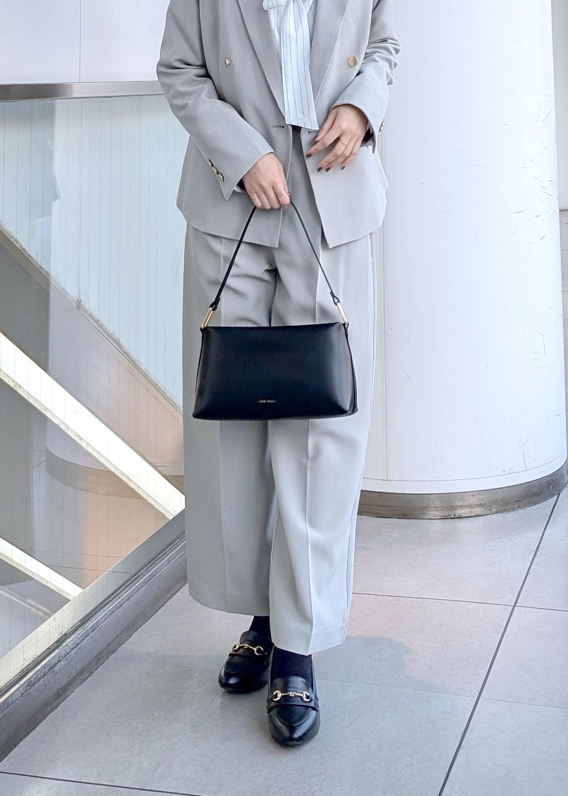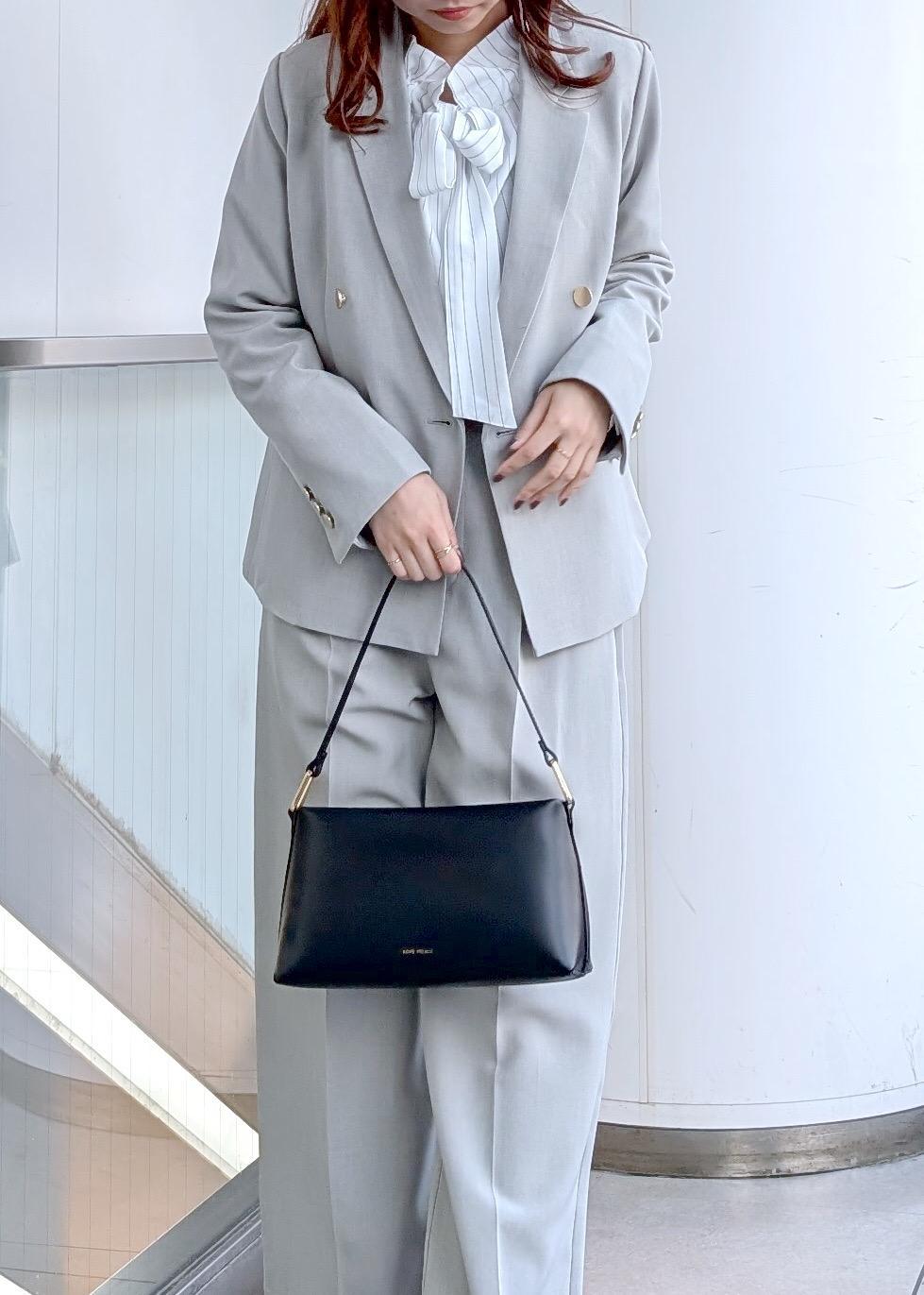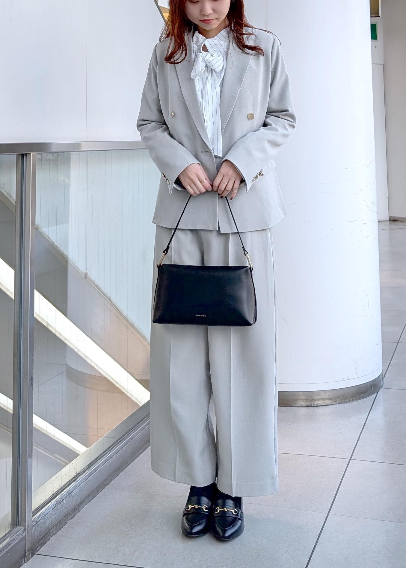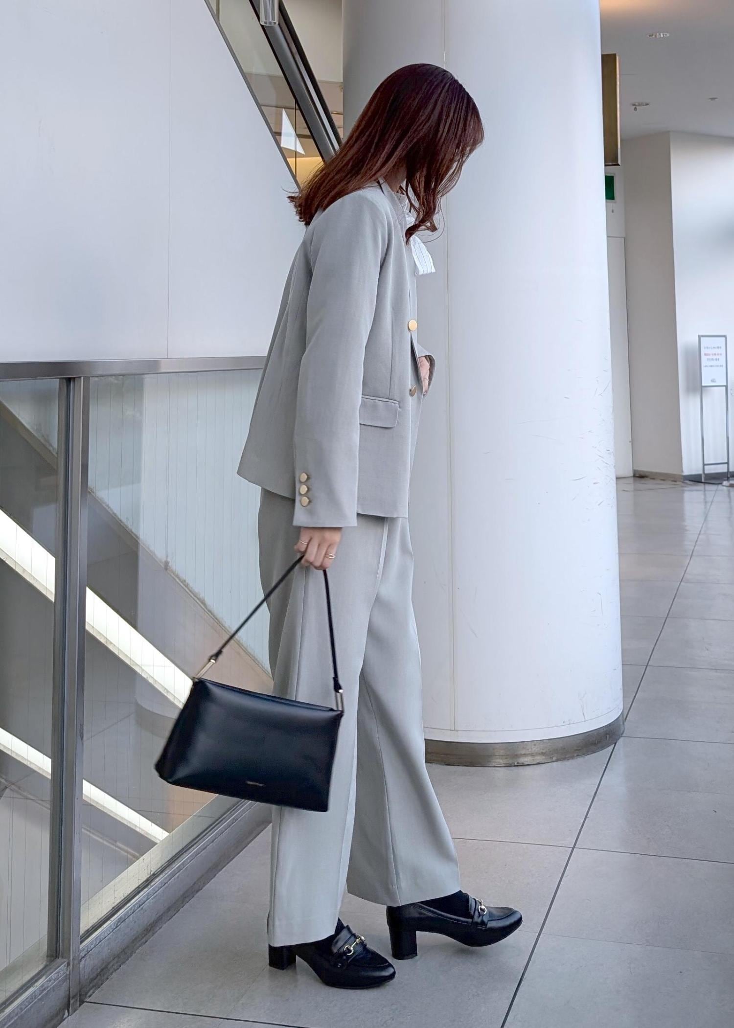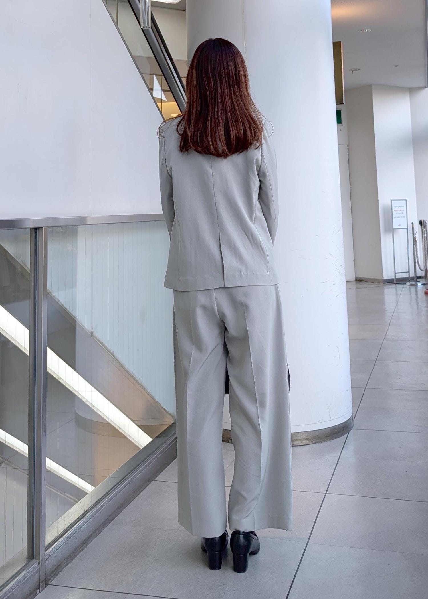 お仕事やセレモニーでも使える金ボタンジャケットとワイドパンツを合わせたキレイめセットアップ。落ち着いたグリーンが春らしさを出してくれます◎上下別々でも使いやすいため着回しにぴったりです!