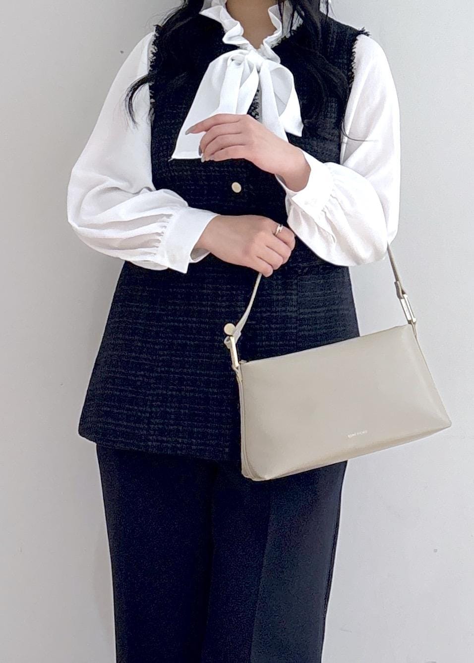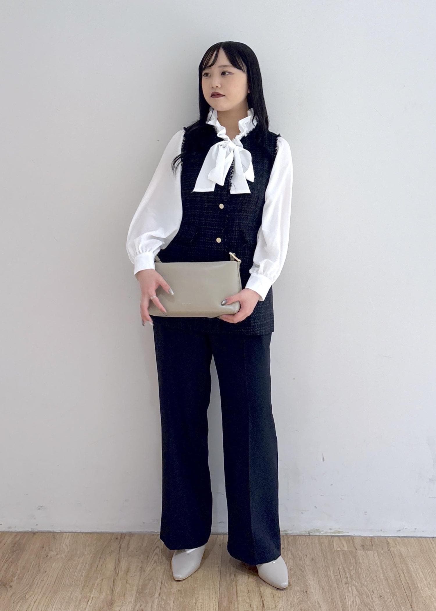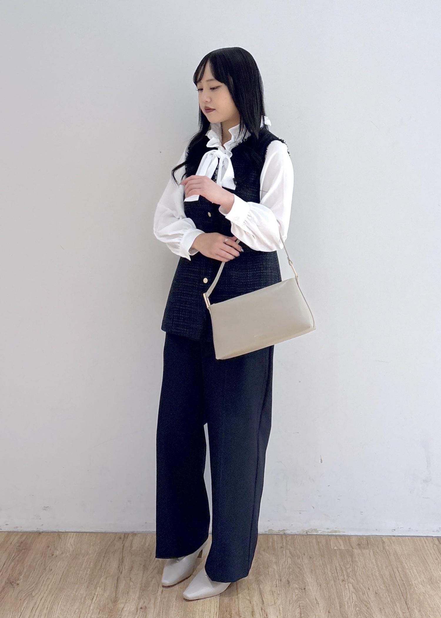 セレモニーはもちろん。普段使いもオッケーなツイードジレと、今年らしいボウタイブラウスでキレイめなスタイリング。