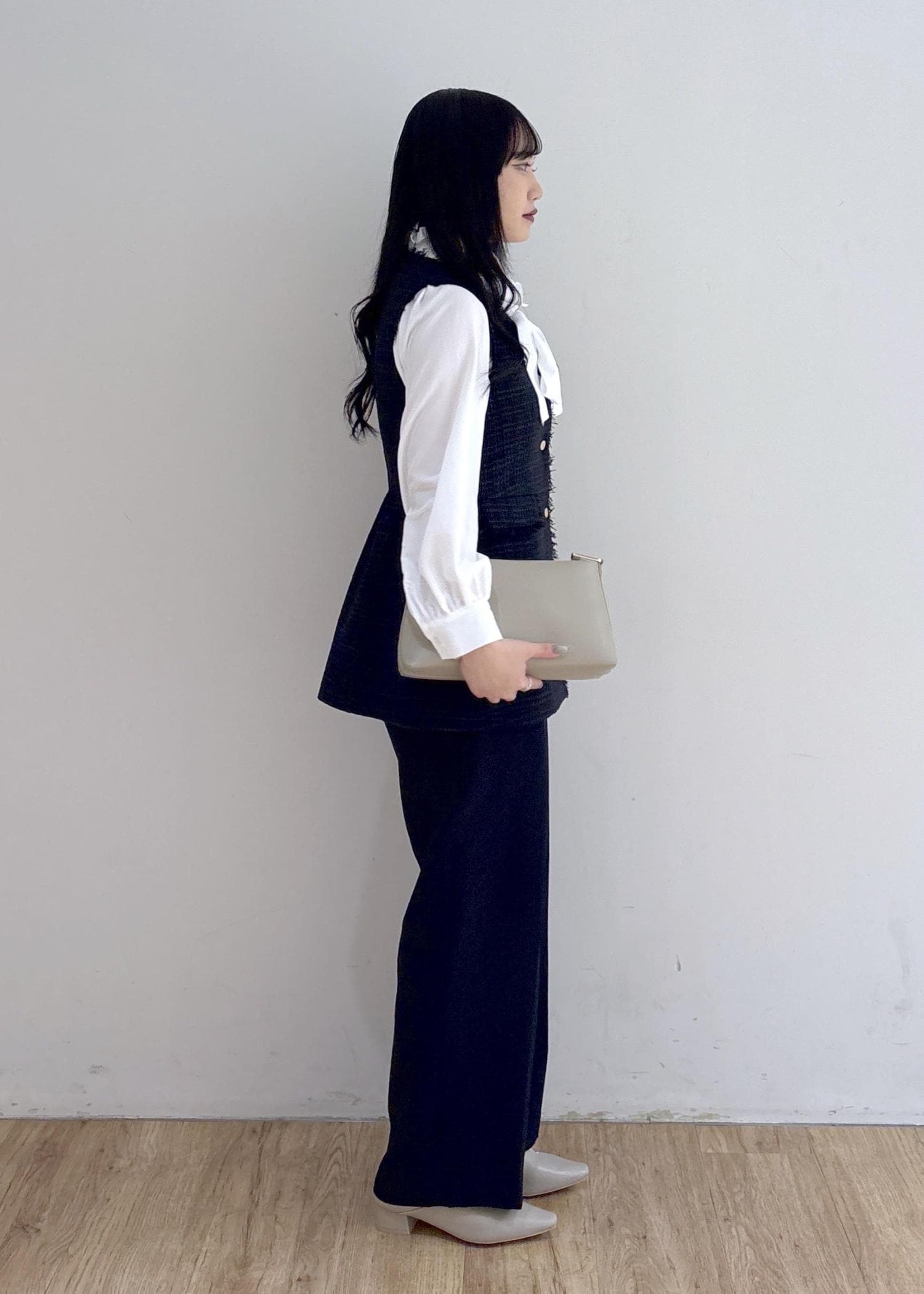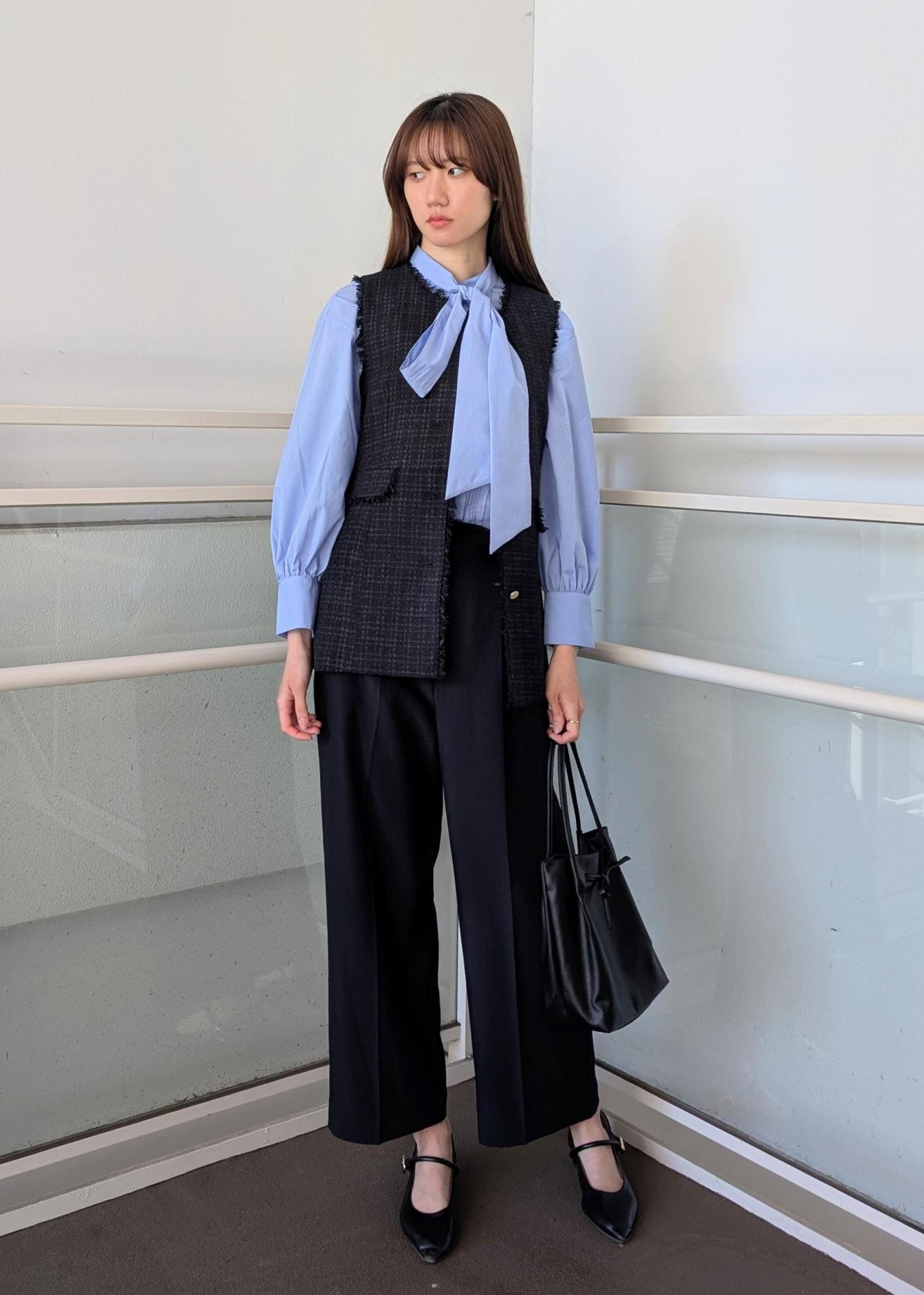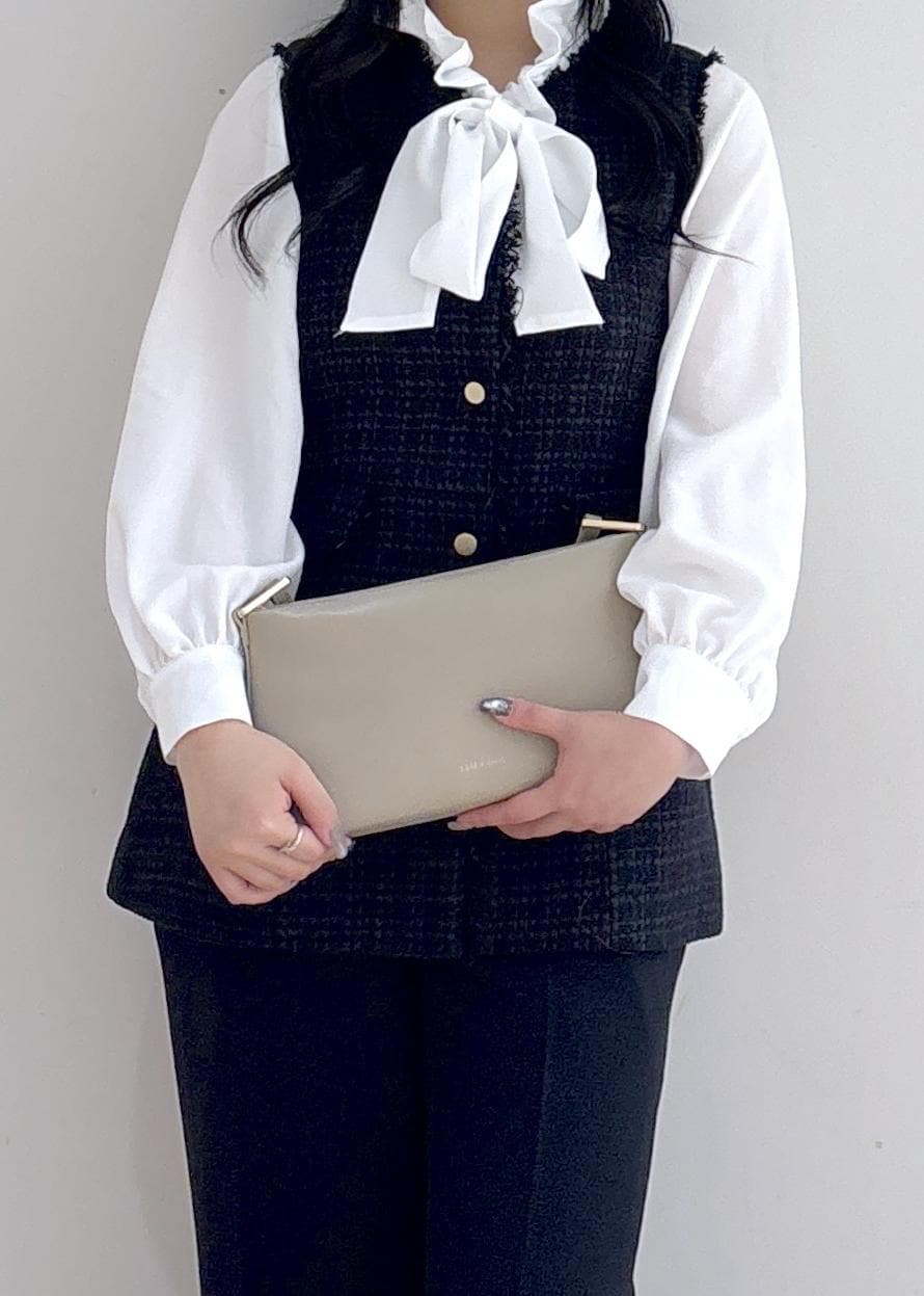 セレモニーはもちろん。普段使いもオッケーなツイードジレと、今年らしいボウタイブラウスでキレイめなスタイリング。