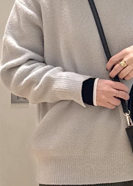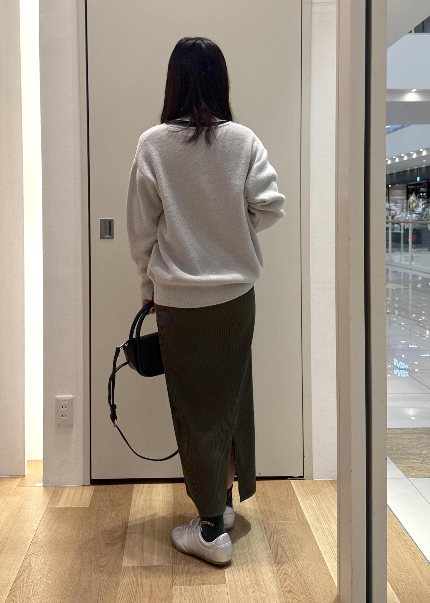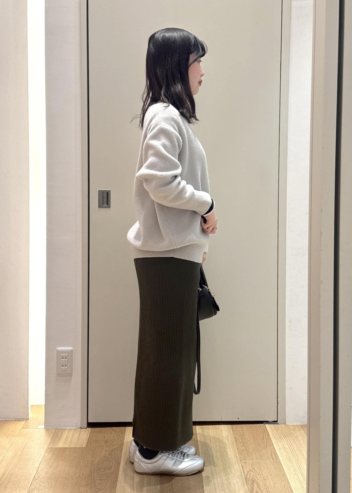 トップスは冬から春にかけて着れるグレーのスフレニットをチョイス。