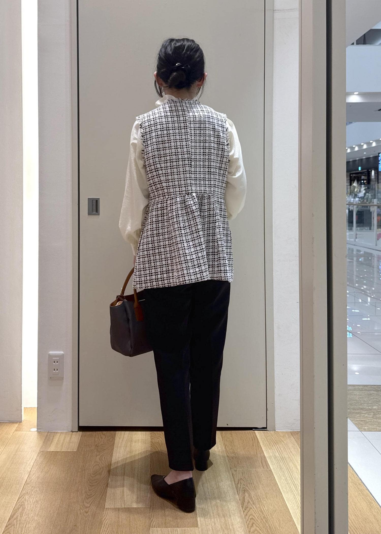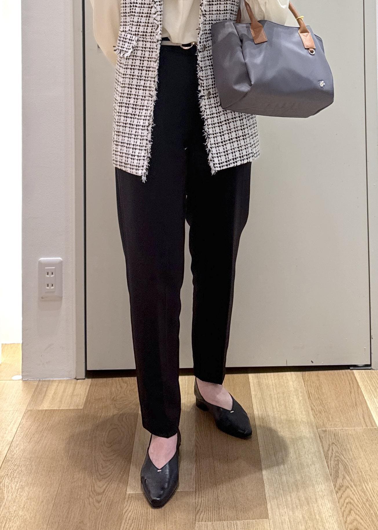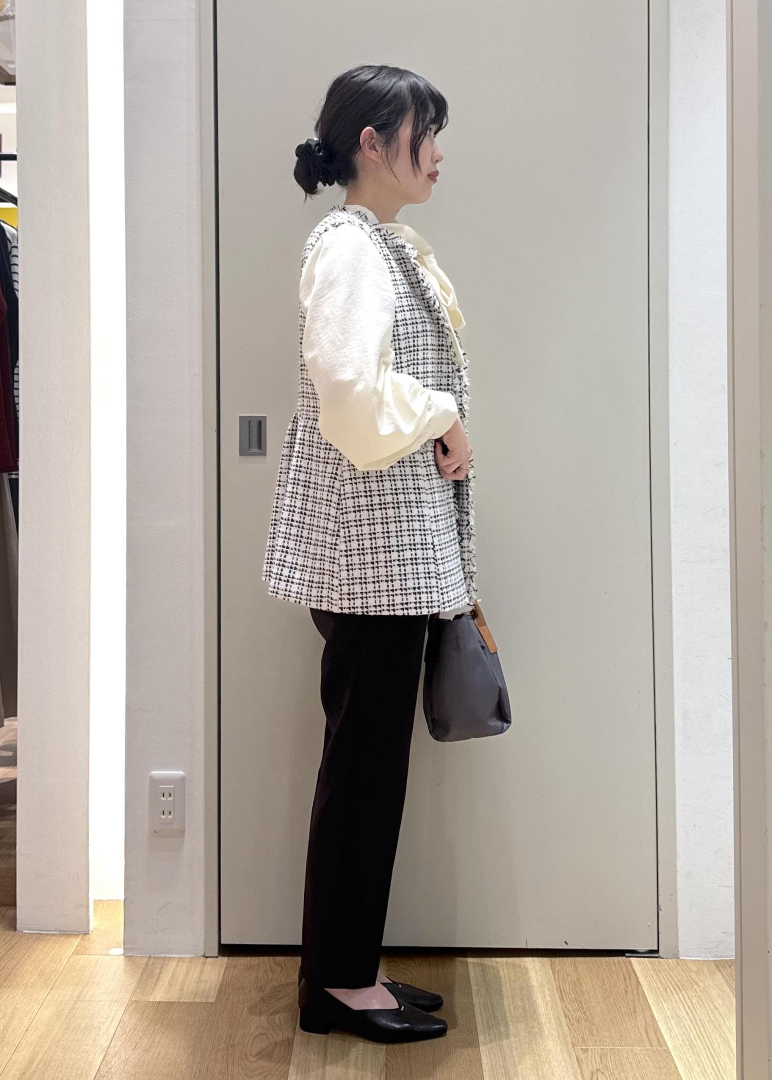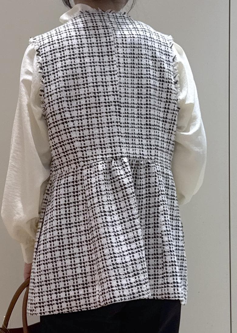 ジレがペプラムシルエットなので、パンツはシンプルな黒のテーパードパンツを合わせてバランスを取りました。