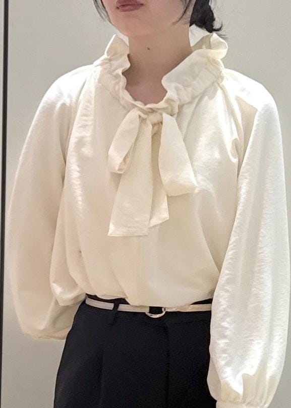 ROPÉ PICNICネックコンシャスデザインシャツ/イージーケアクリーム / F¥5,995レビュー首元のリボンとフリルがポイントのブラウス。